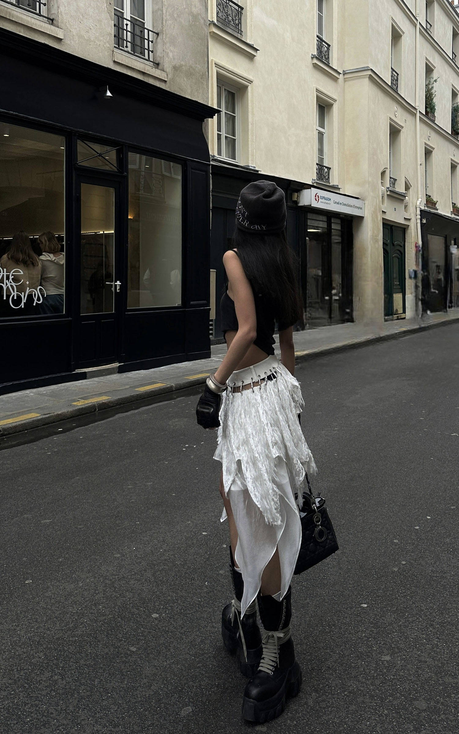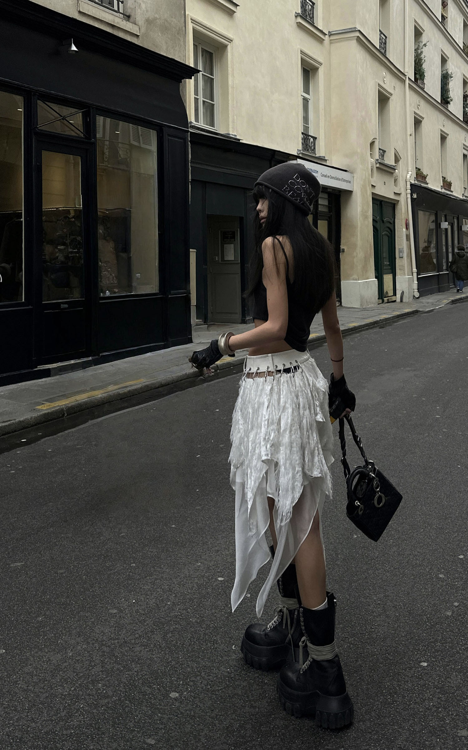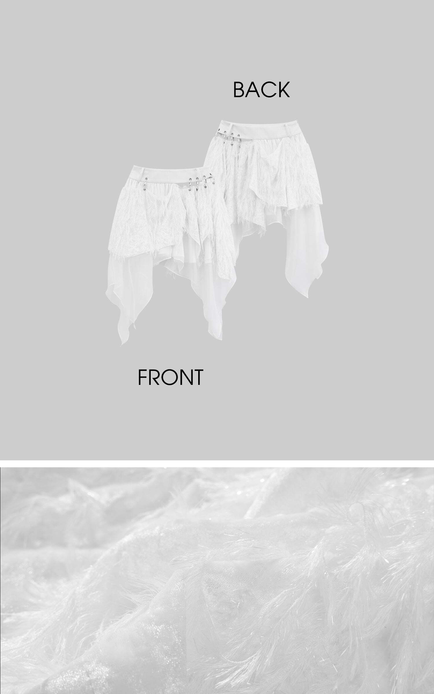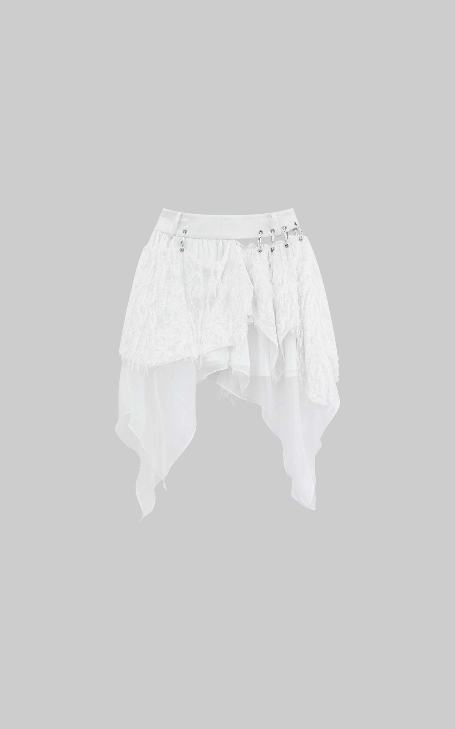 A collision of ethereal texture and industrial tension. This asymmetrical skirt features raw-edged feather-like panels clashing with sheer drapes, suspended from a grommeted waistband with oversized hardware. The silhouette flows with movement, yet disrupts symmetry—built for those who resist structure, yet own the street. Pair it with boots or layer it up—there are no rules.