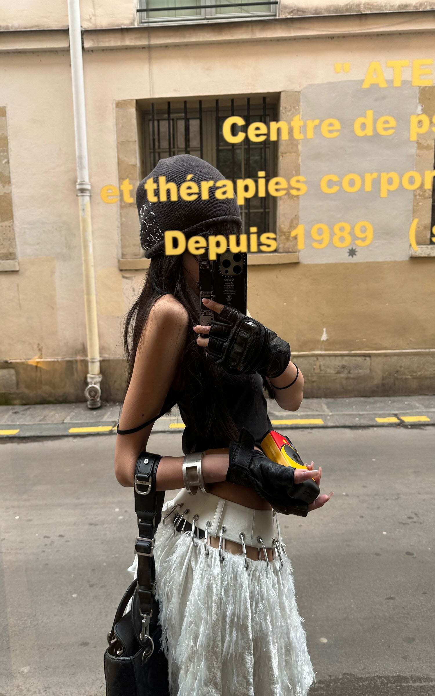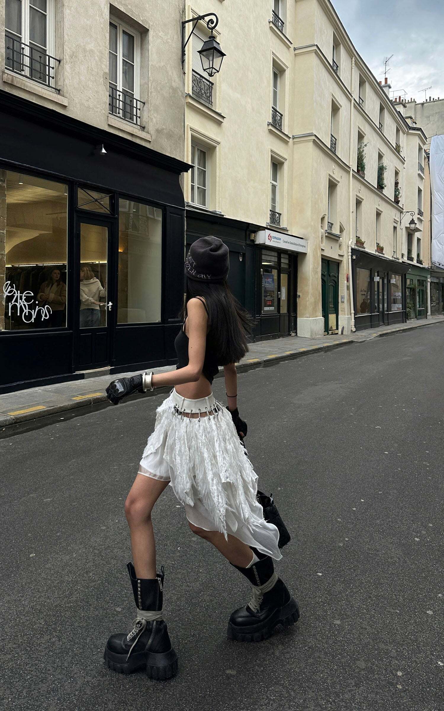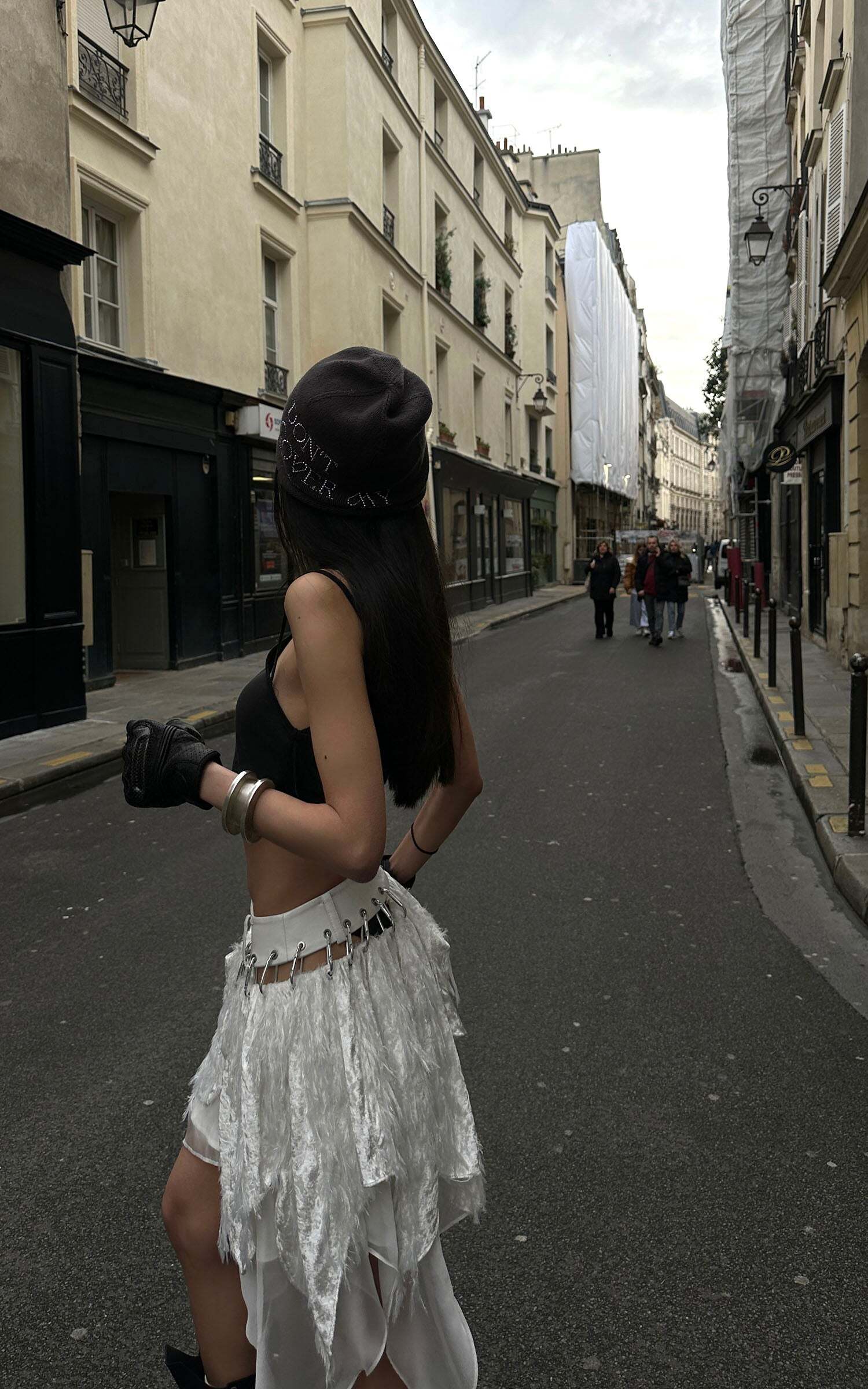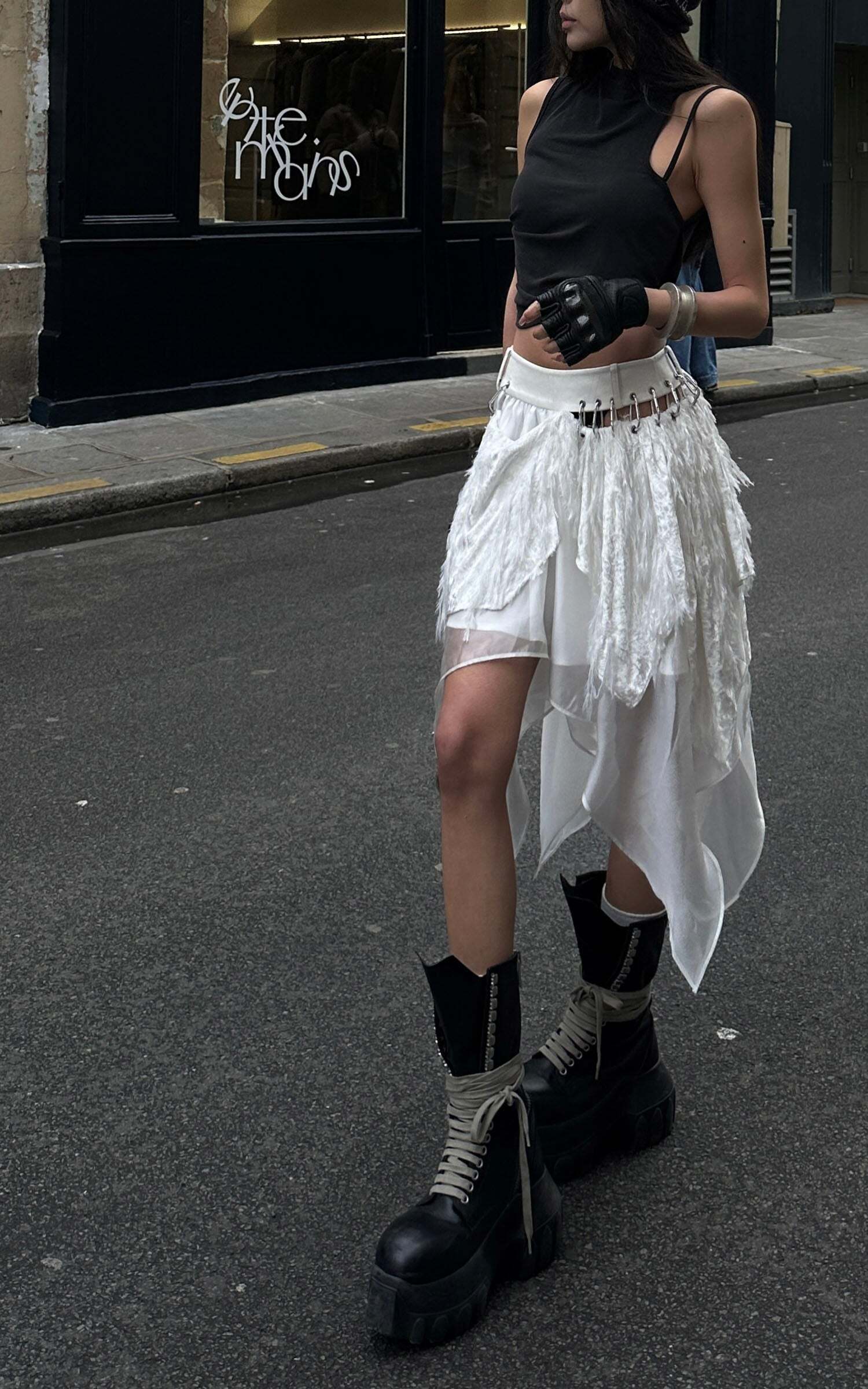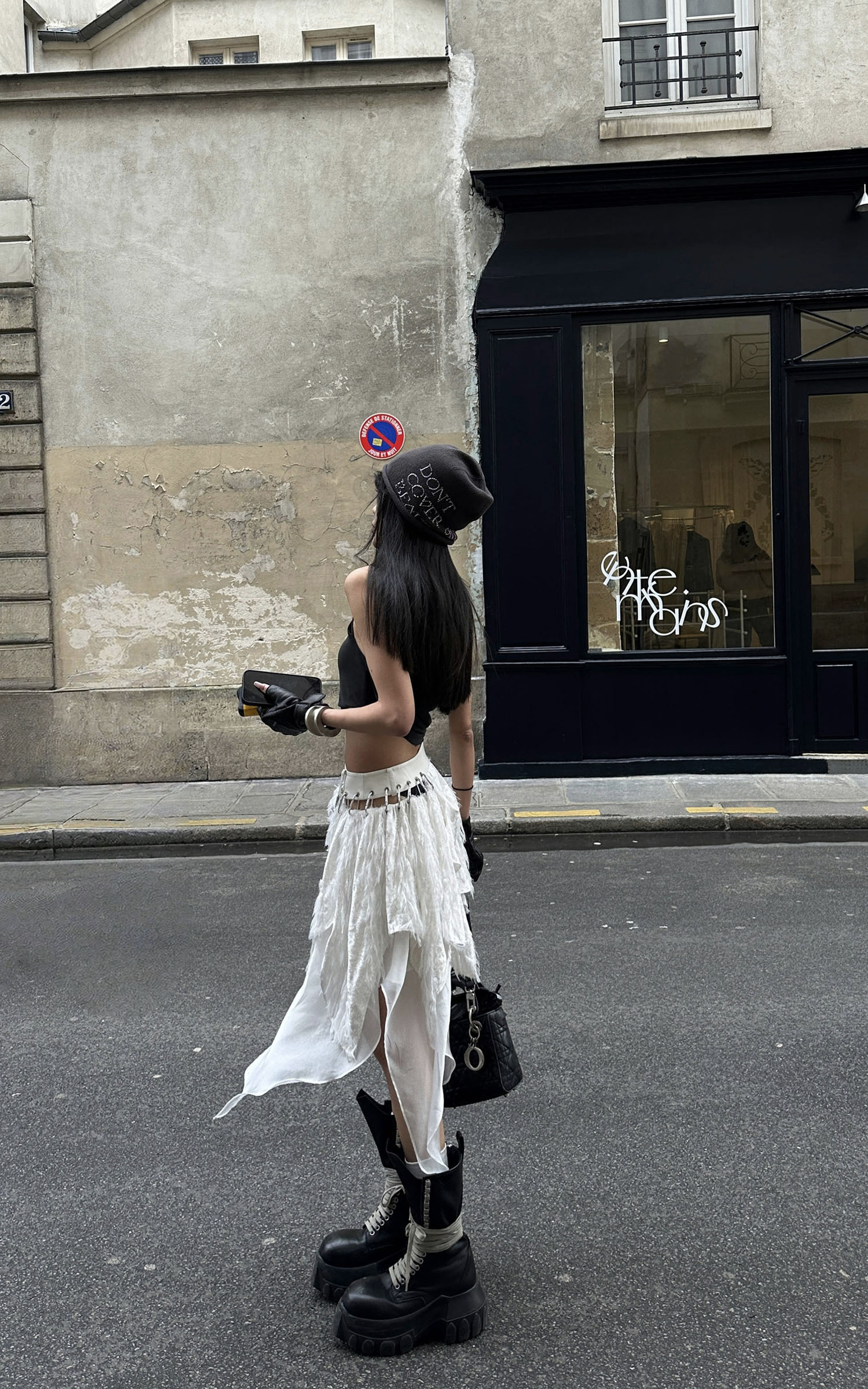 A collision of ethereal texture and industrial tension. This asymmetrical skirt features raw-edged feather-like panels clashing with sheer drapes, suspended from a grommeted waistband with oversized hardware. The silhouette flows with movement, yet disrupts symmetry—built for those who resist structure, yet own the street. Pair it with boots or layer it up—there are no rules.
