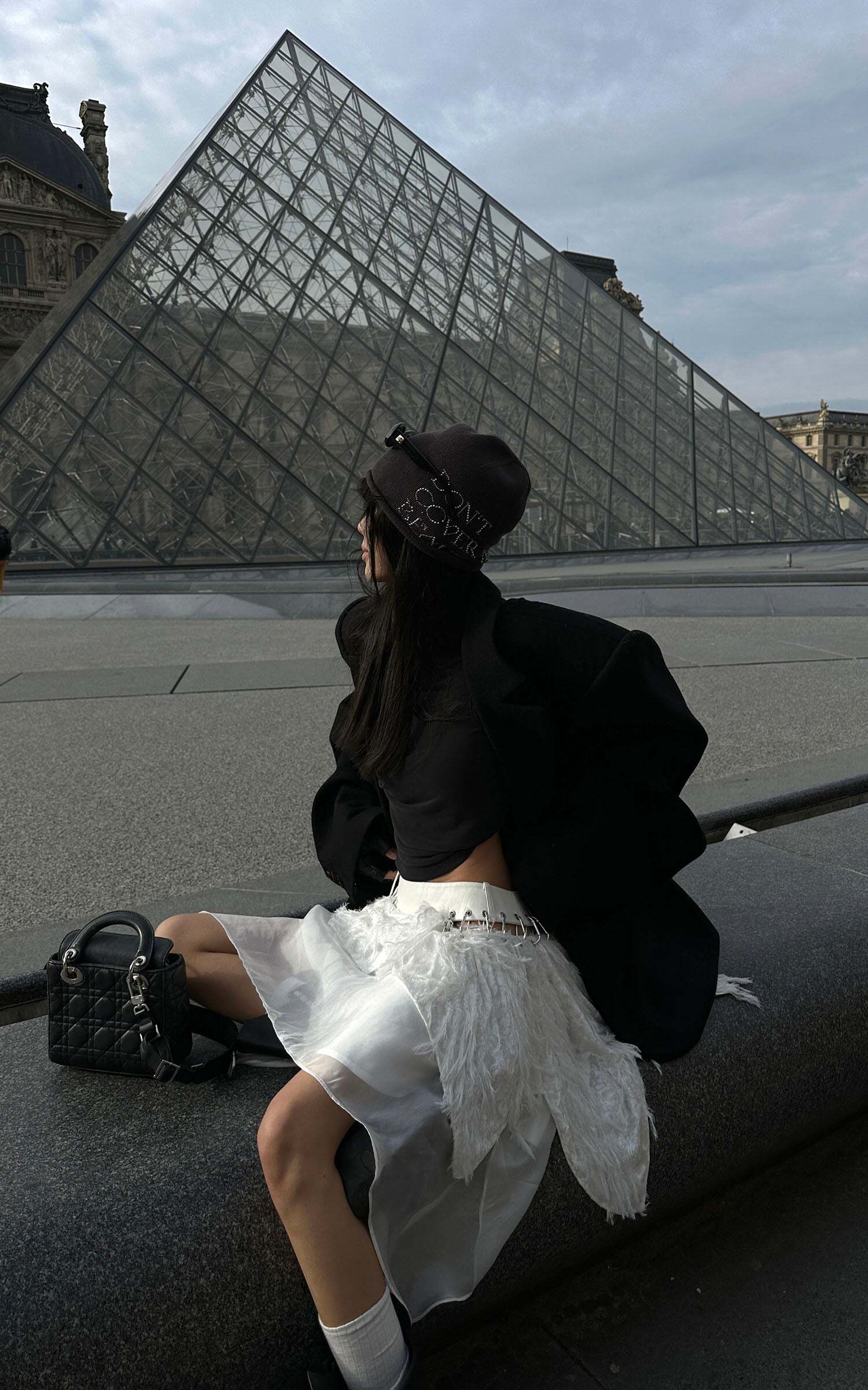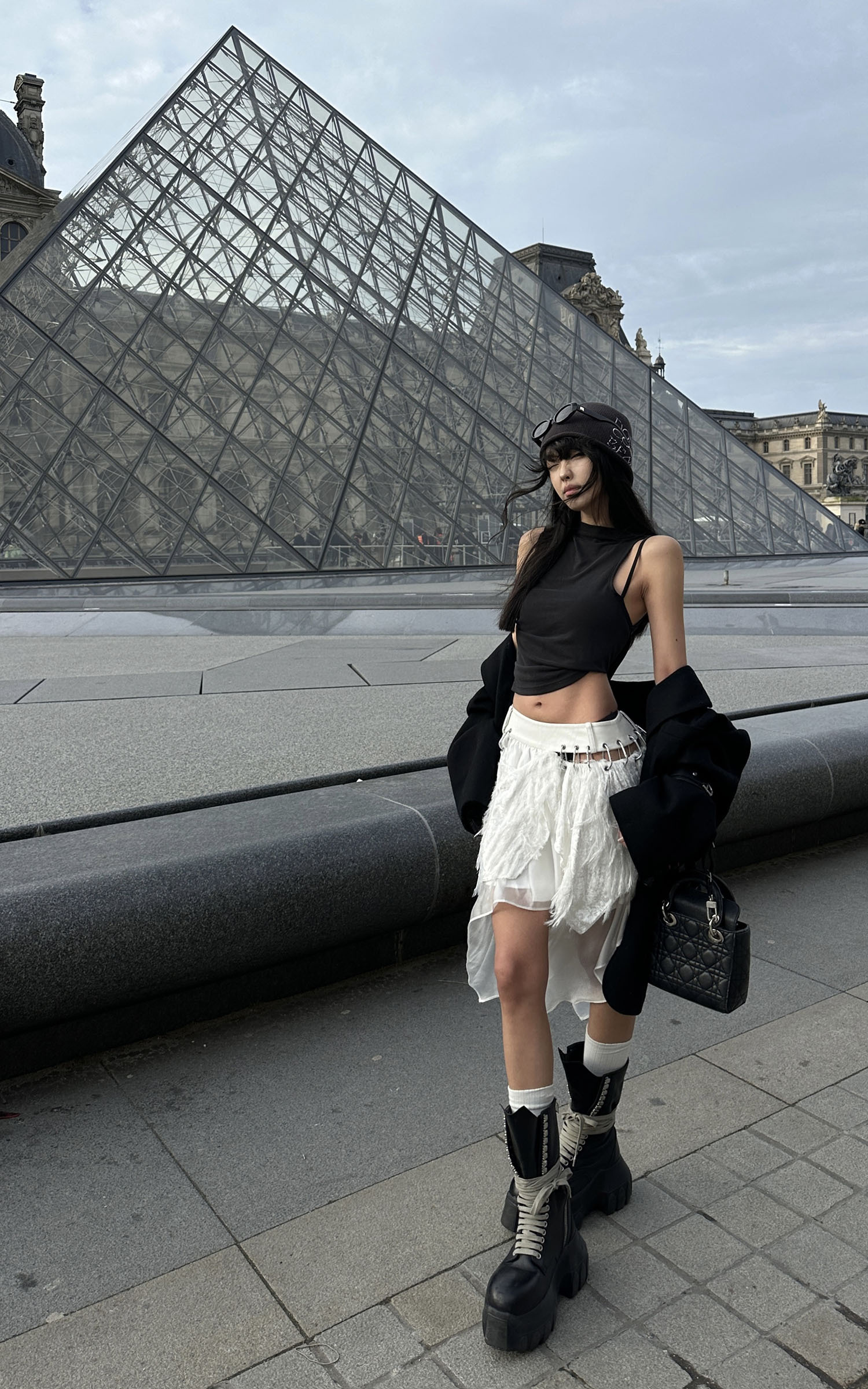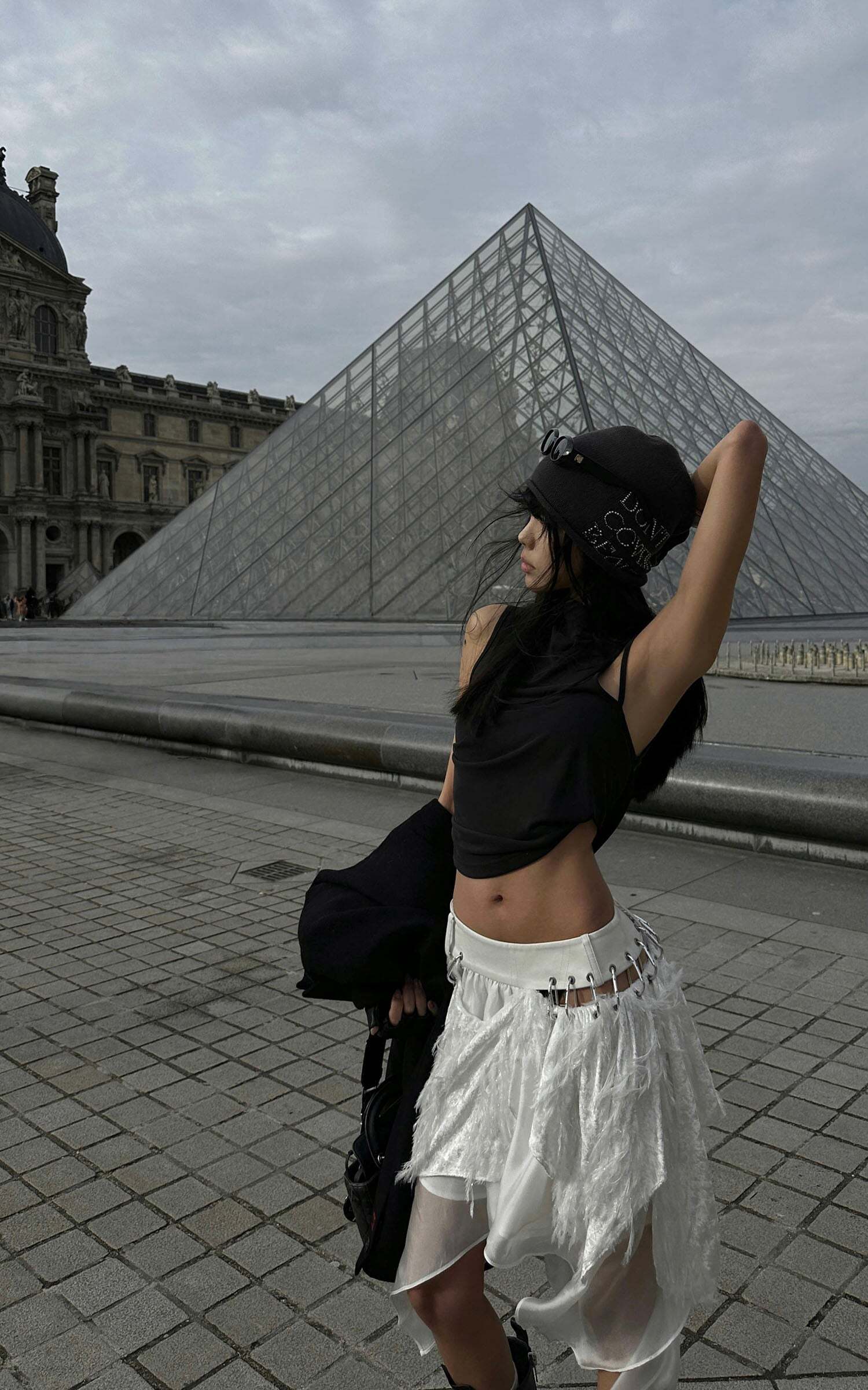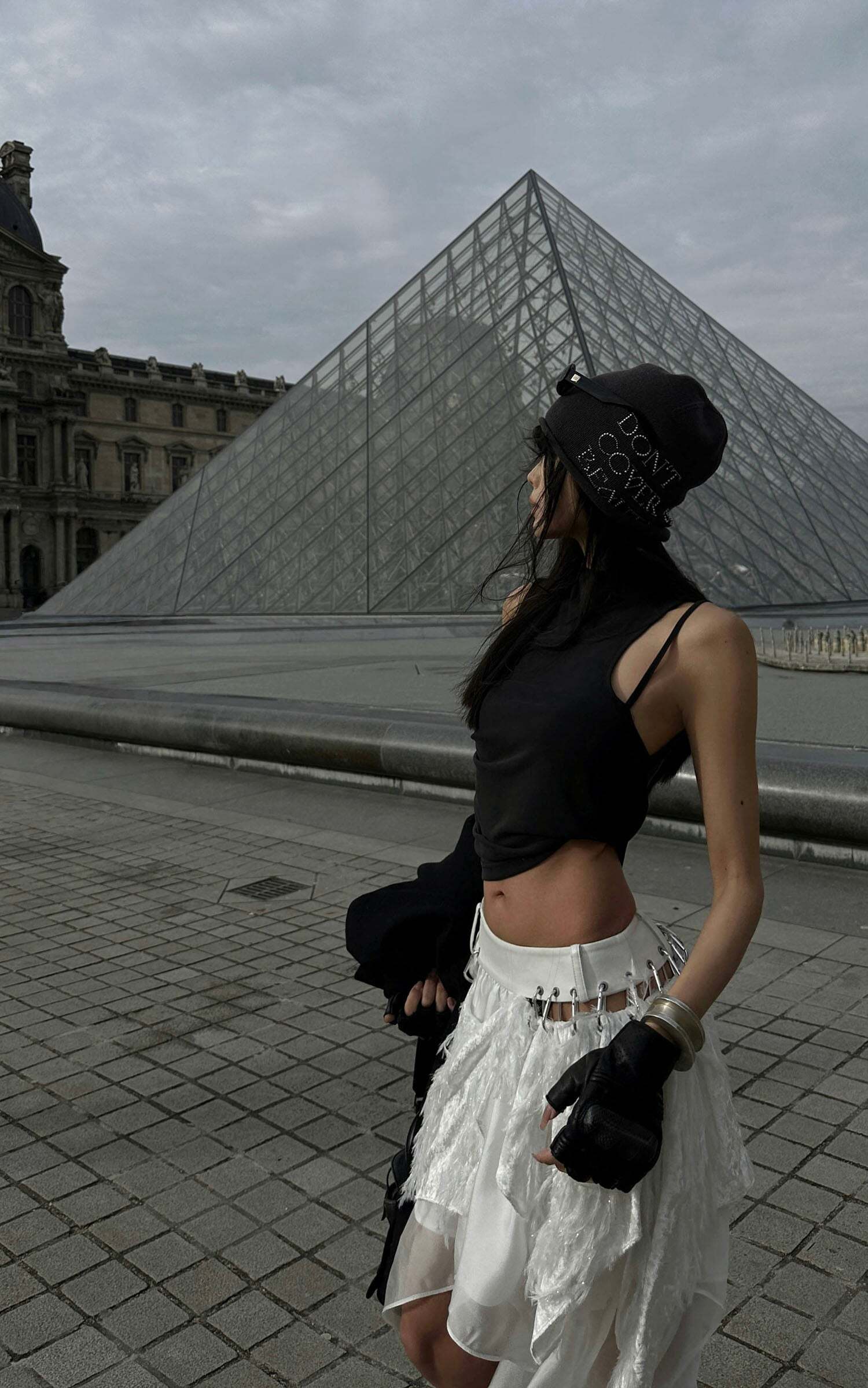 A collision of ethereal texture and industrial tension. This asymmetrical skirt features raw-edged feather-like panels clashing with sheer drapes, suspended from a grommeted waistband with oversized hardware. The silhouette flows with movement, yet disrupts symmetry—built for those who resist structure, yet own the street. Pair it with boots or layer it up—there are no rules.