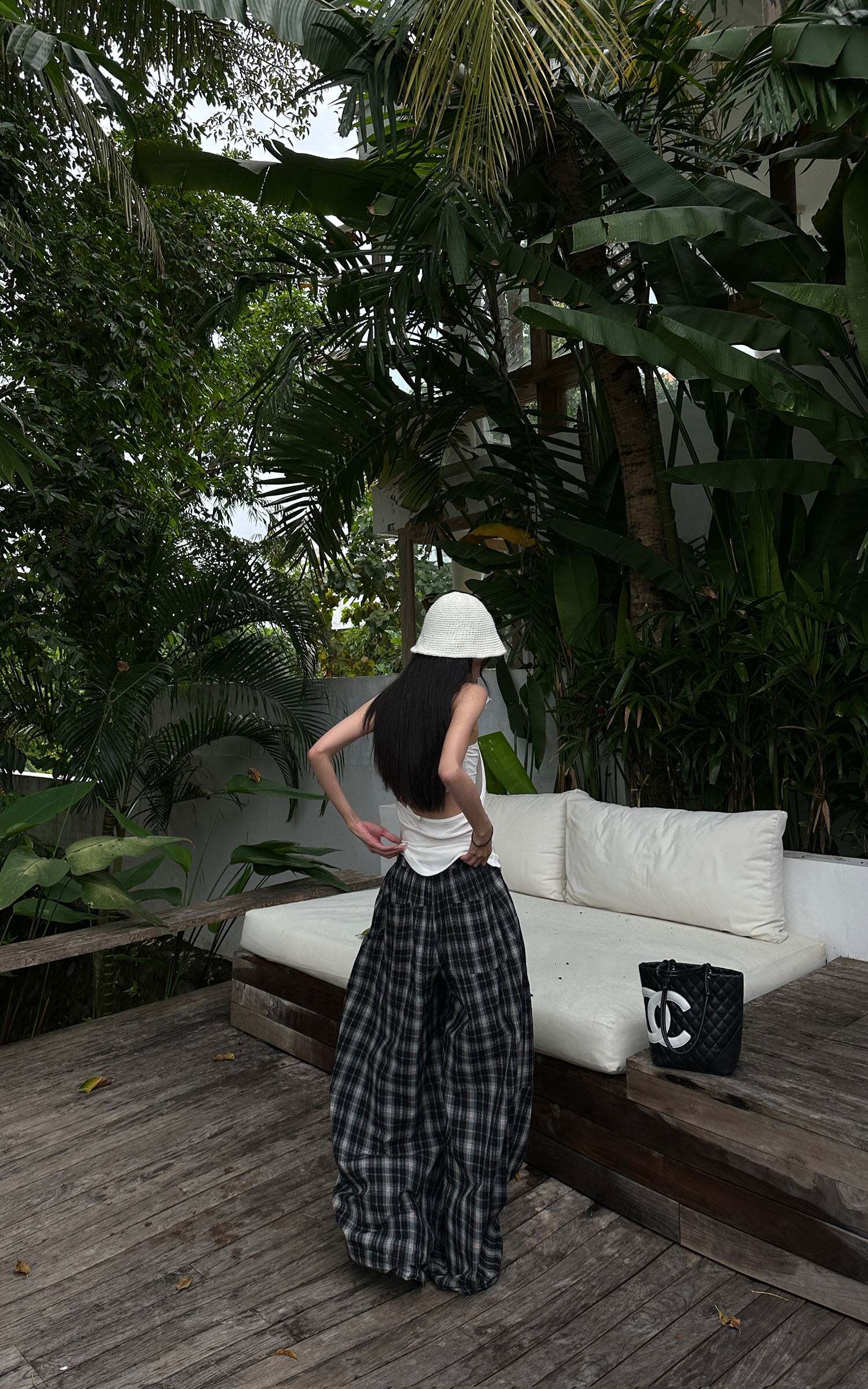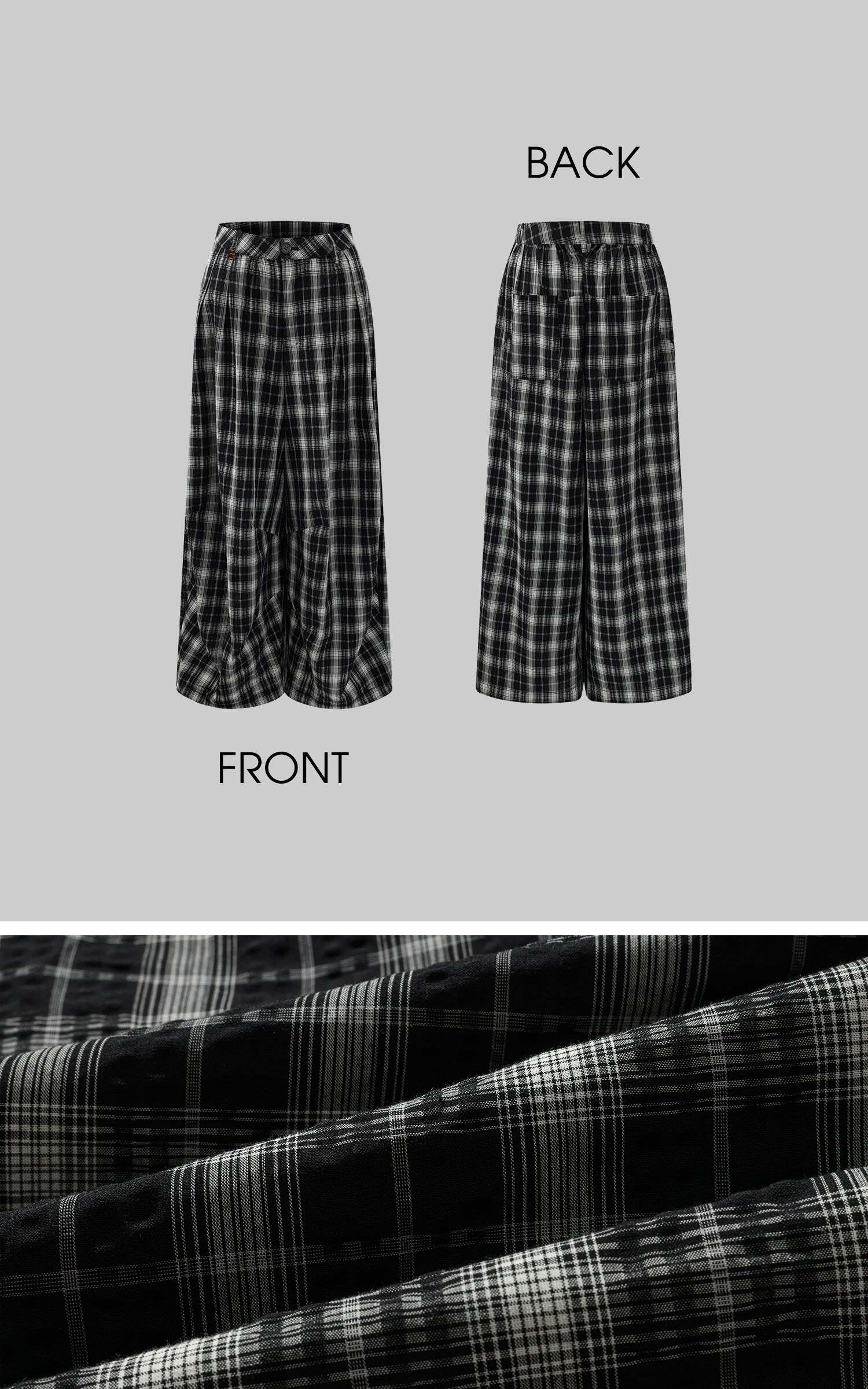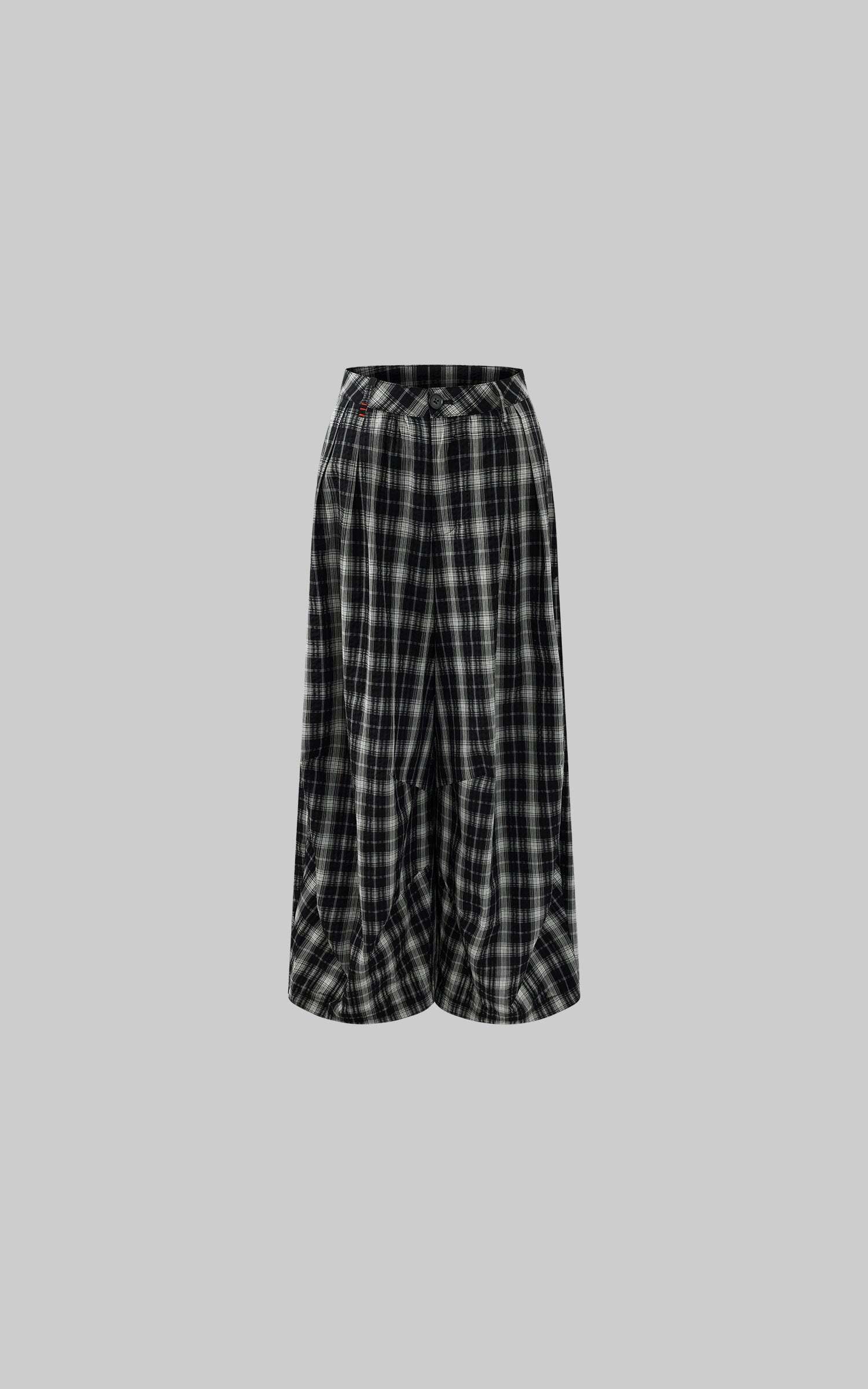 A rebellion against clean lines—these trousers twist tradition with calculated imbalance. Cut from a soft plaid fabric with a broken symmetry, the ultra-wide legs drape with unexpected volume. Subtle pleating and a slightly dropped crotch soften the structure, while the cinched high waist holds the silhouette in tension. Static in print, fluid in motion. For those who reshape the frame.