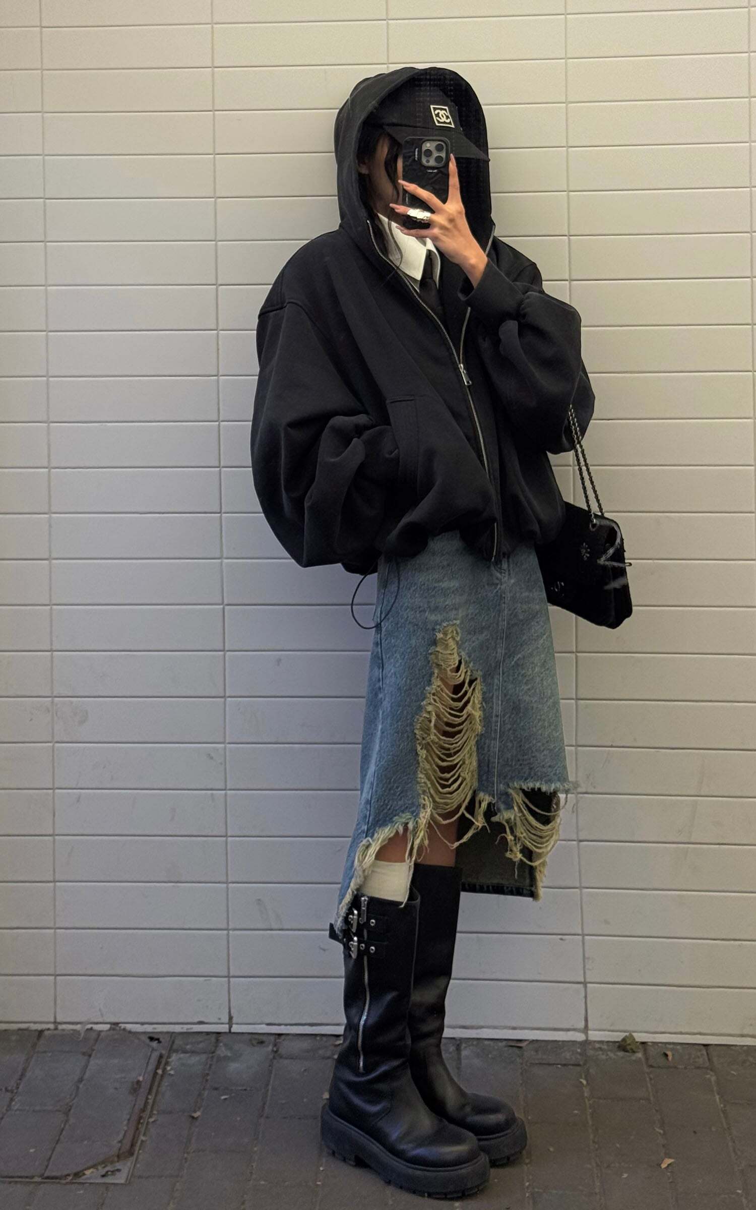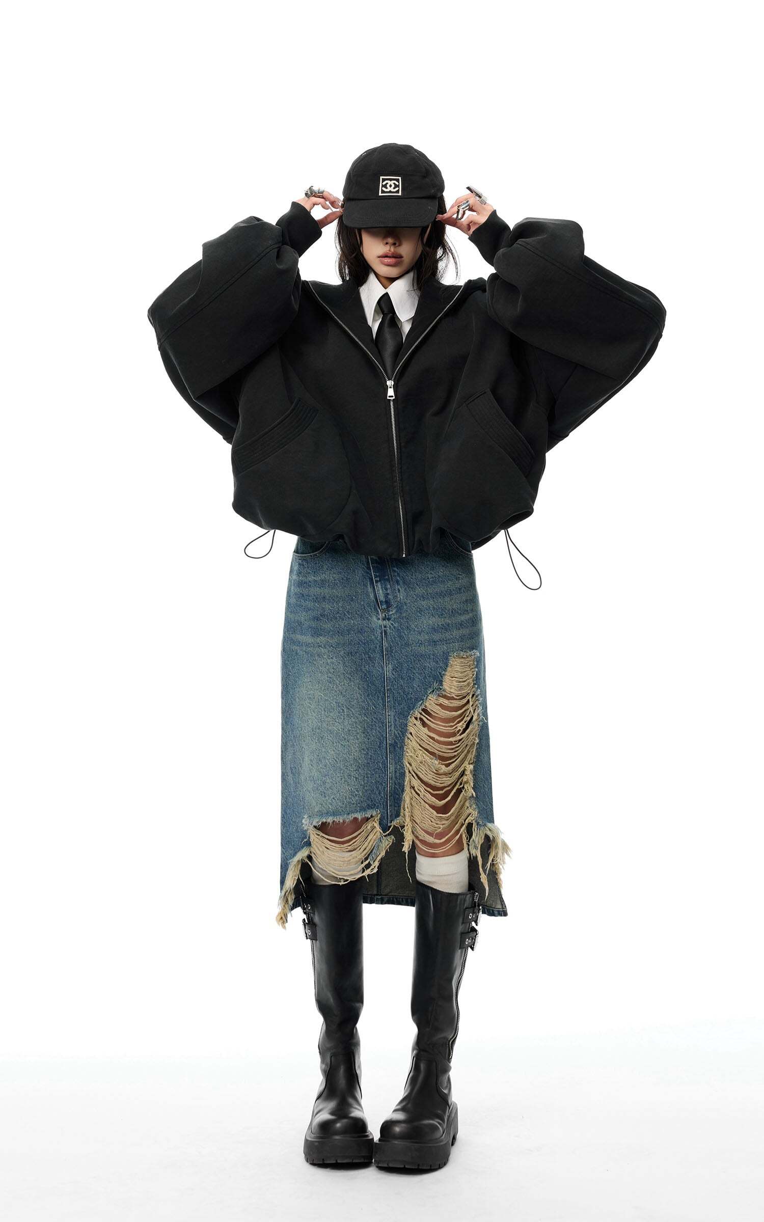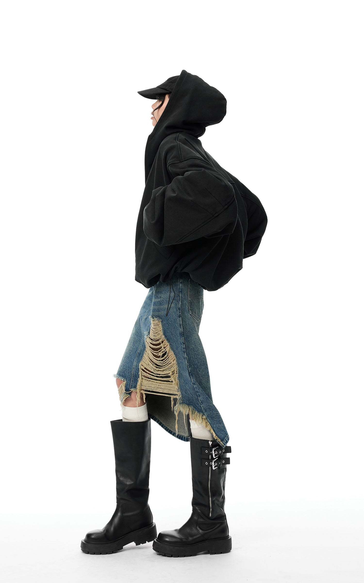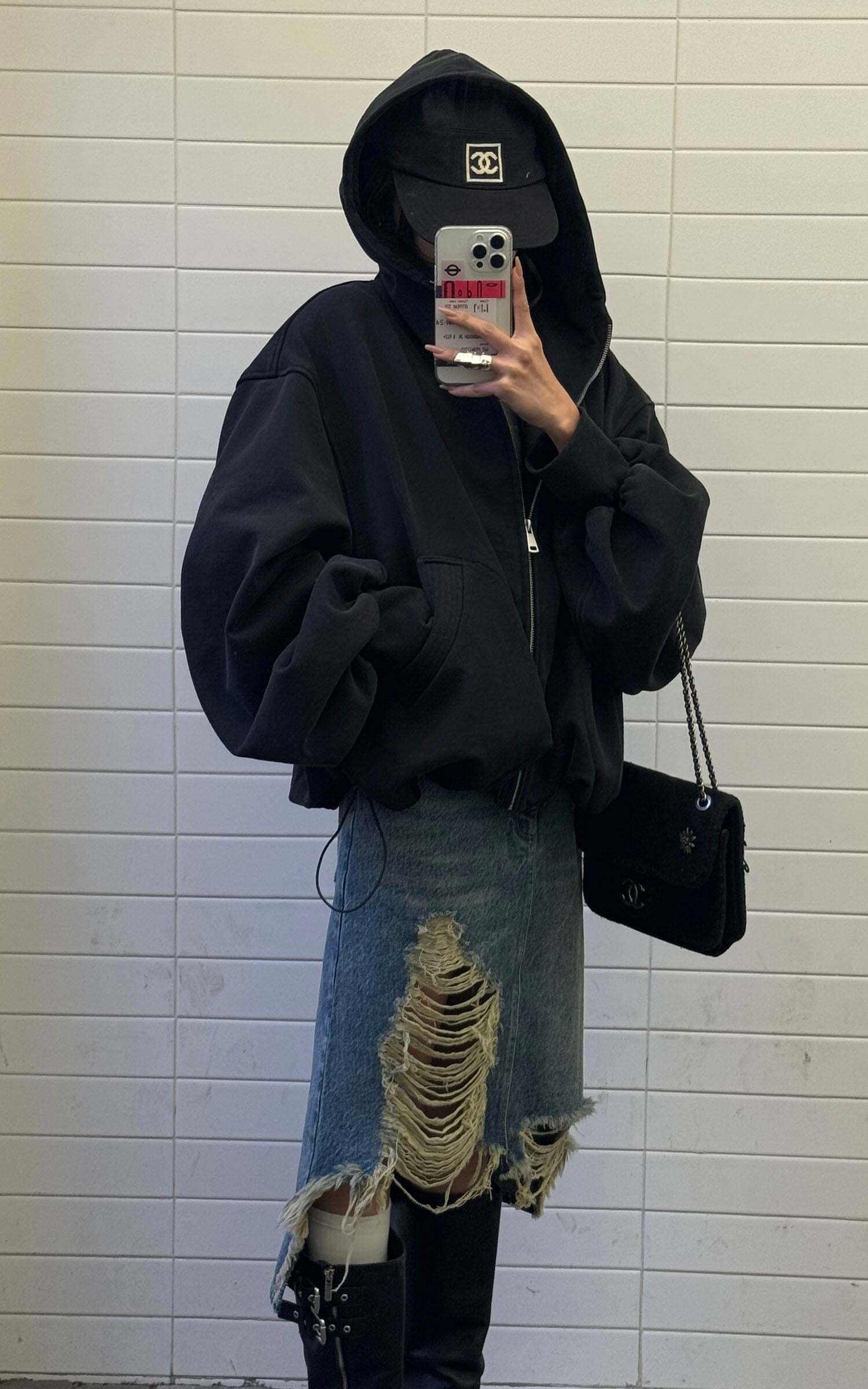 A bold reinterpretation of classic denim, this distressed midi skirt disrupts convention with raw-edge deconstruction and an asymmetrical hem. The frayed, ripped detailing adds an effortlessly rebellious streetwear vibe, while the structured washed denim fabric ensures durability and style. Its mid-length silhouette offers versatility—pair it with chunky boots for an edgy statement or sneakers for a laid-back urban look.