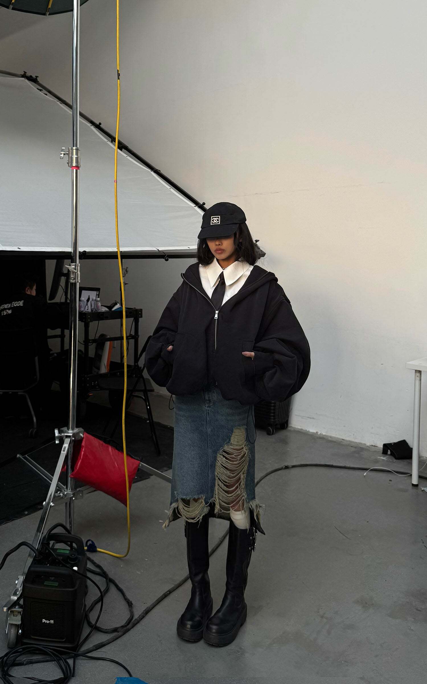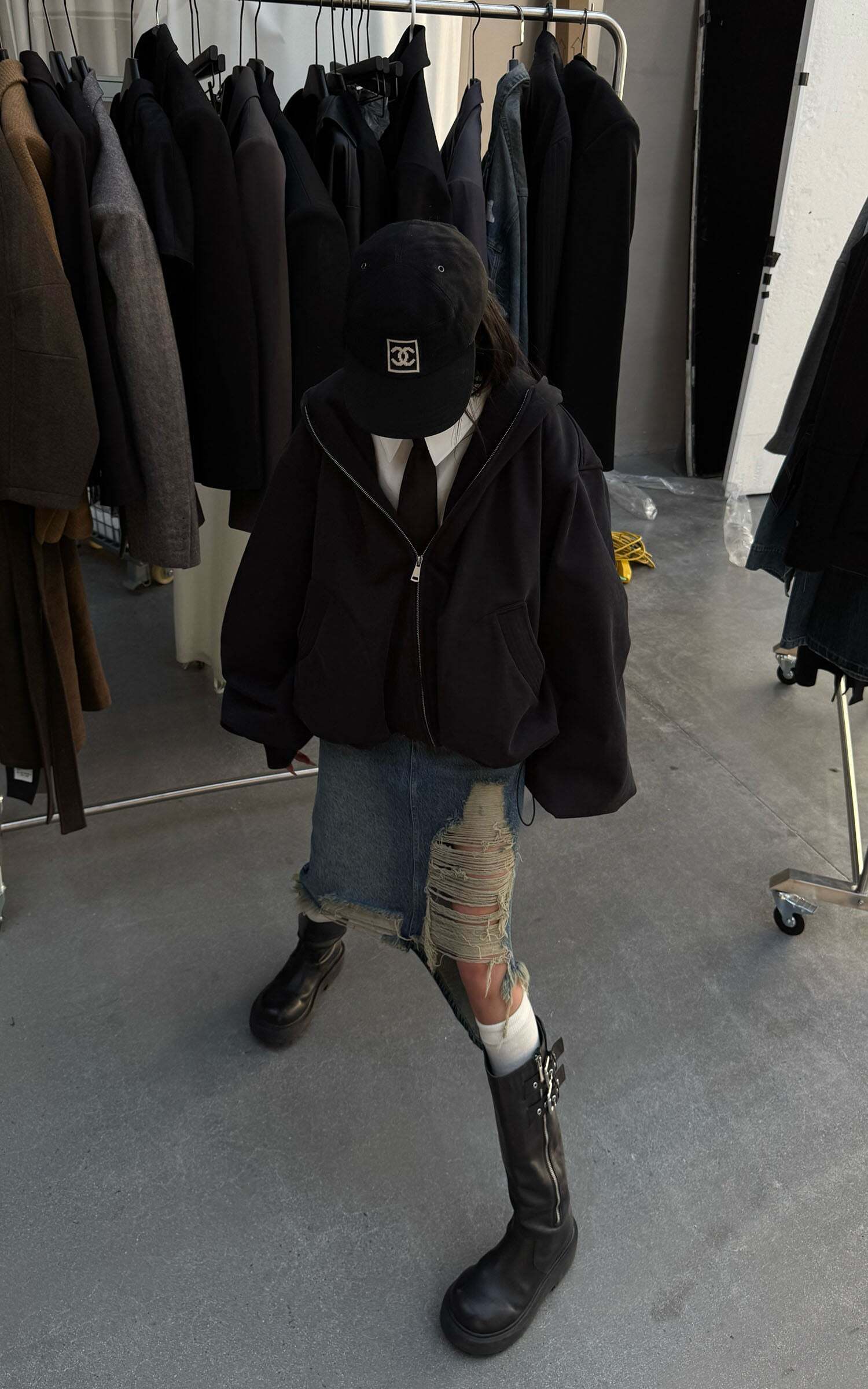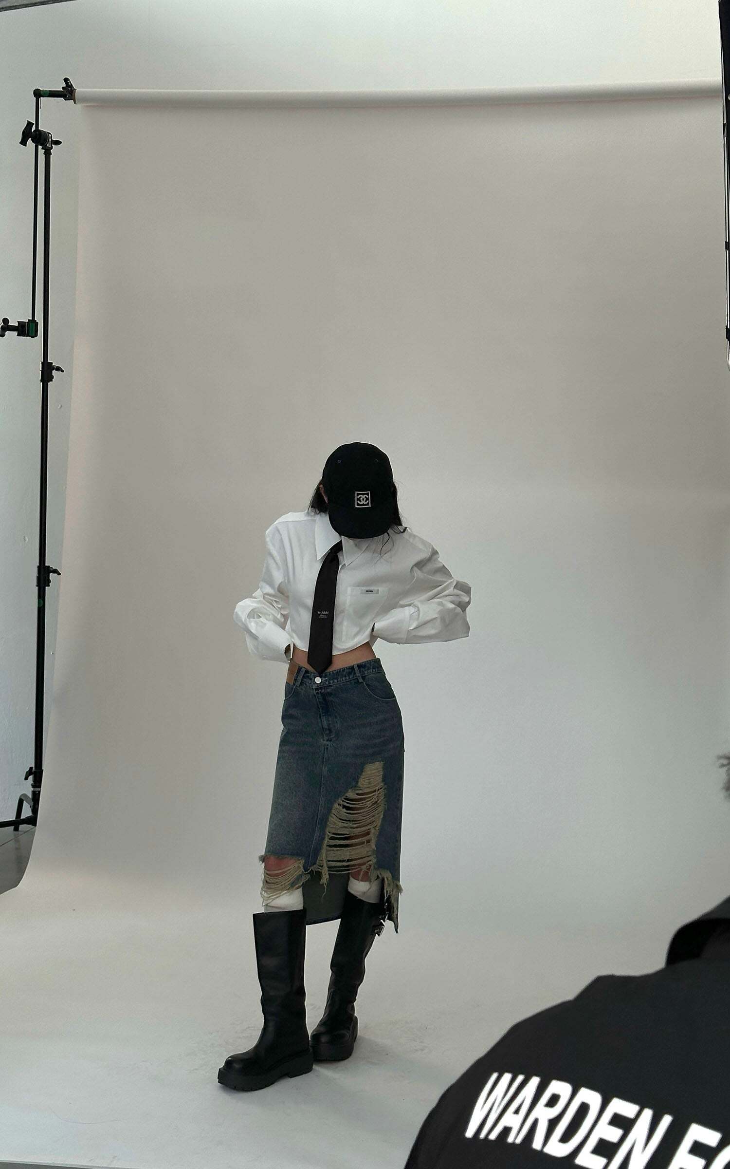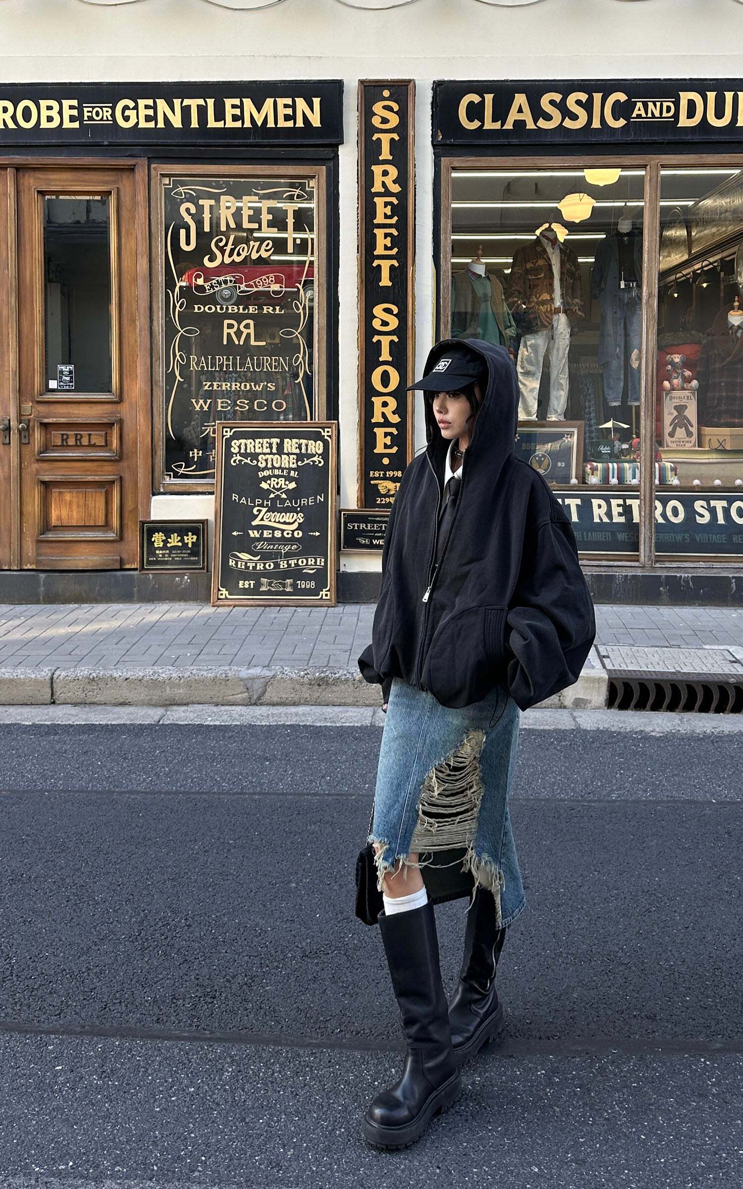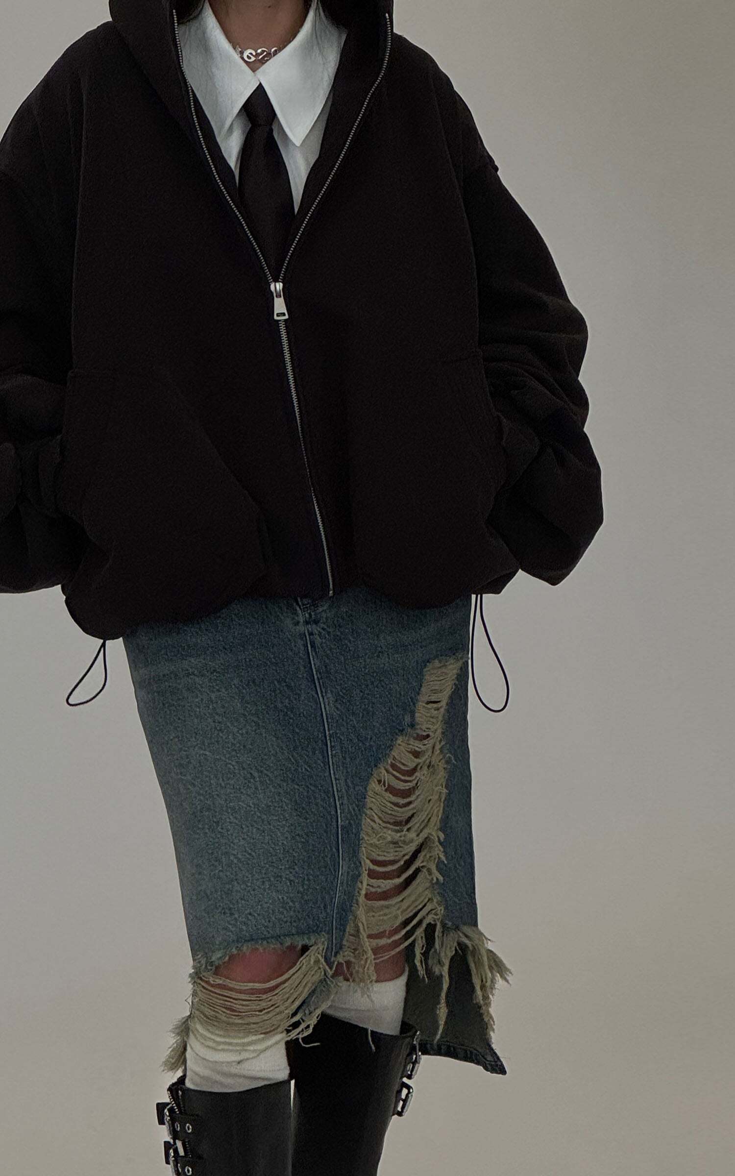 A bold reinterpretation of classic denim, this distressed midi skirt disrupts convention with raw-edge deconstruction and an asymmetrical hem. The frayed, ripped detailing adds an effortlessly rebellious streetwear vibe, while the structured washed denim fabric ensures durability and style. Its mid-length silhouette offers versatility—pair it with chunky boots for an edgy statement or sneakers for a laid-back urban look.