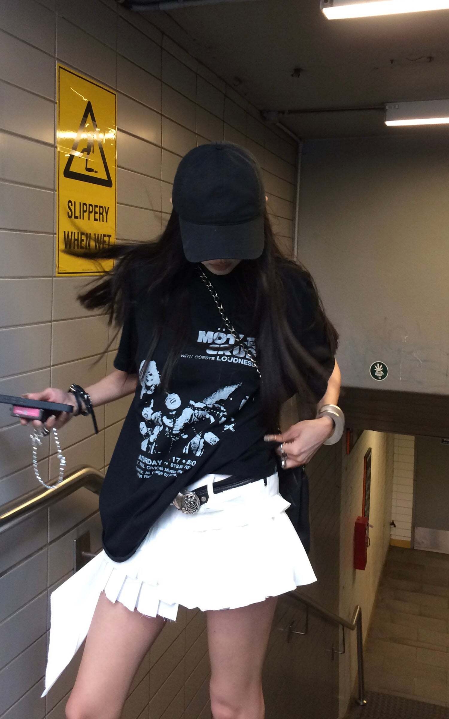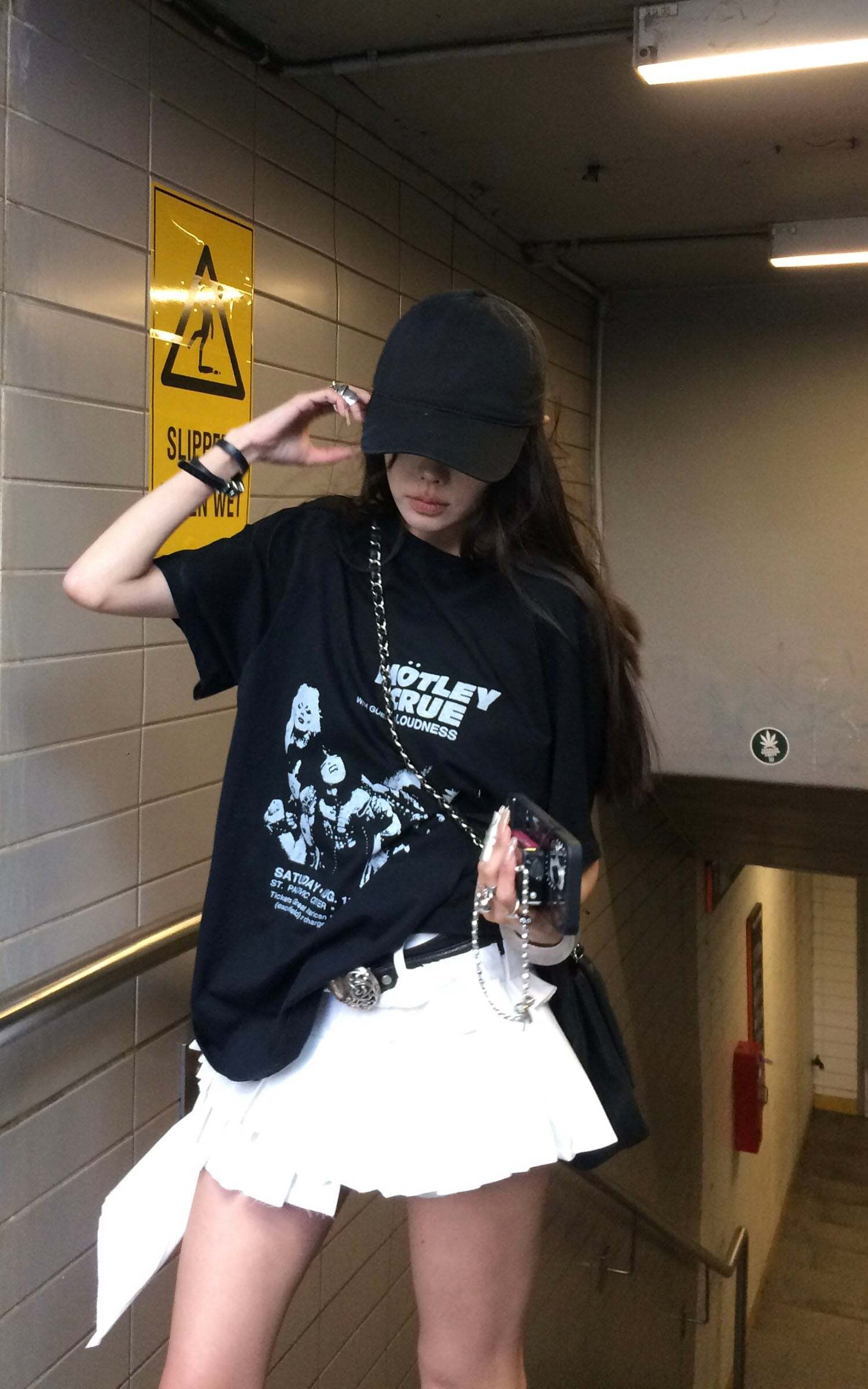 A tribute to the chaos and charisma of ’80s metal legends, this oversized black tee features a distressed monochrome graphic from a Mötley Crüe x Loudness tour night. The cracked print effect echoes vintage bootleg aesthetics, evoking the raw energy of underground shows. Cut from heavyweight cotton with a dry hand feel, the boxy silhouette and dropped shoulders give it a street-aligned attitude. Whether layered over a pleated mini or paired with combat boots, it’s an anthem for those who dress loud.