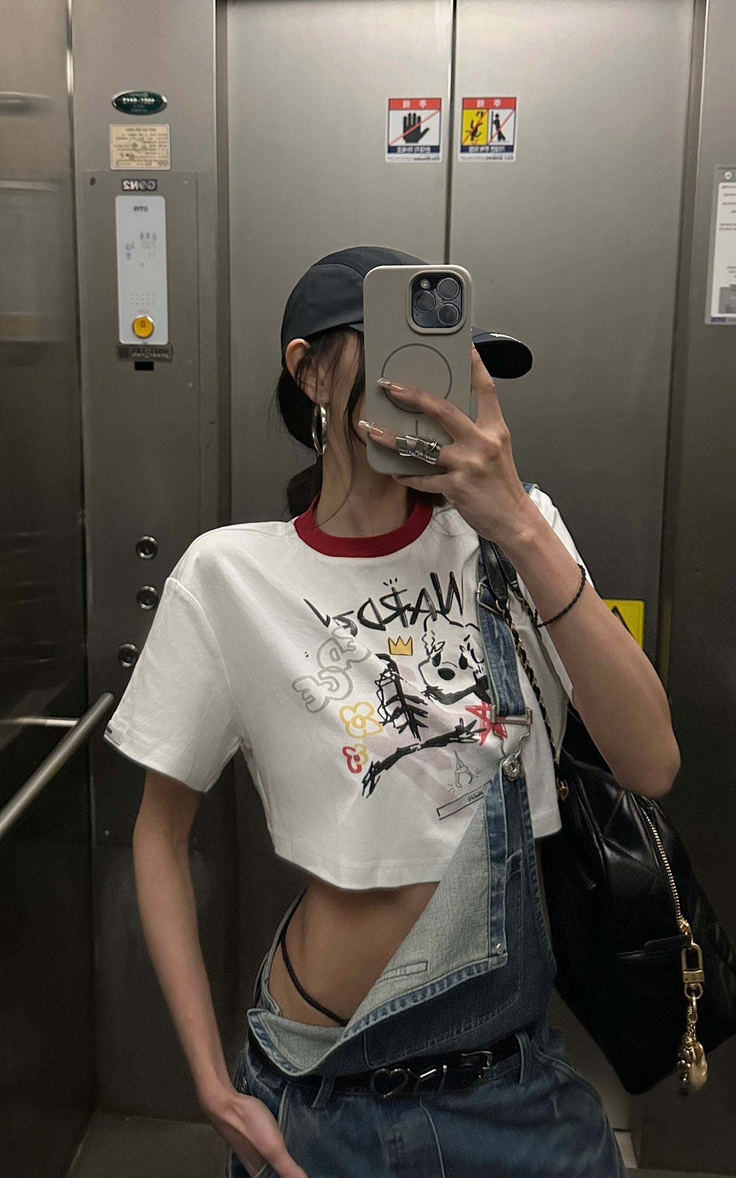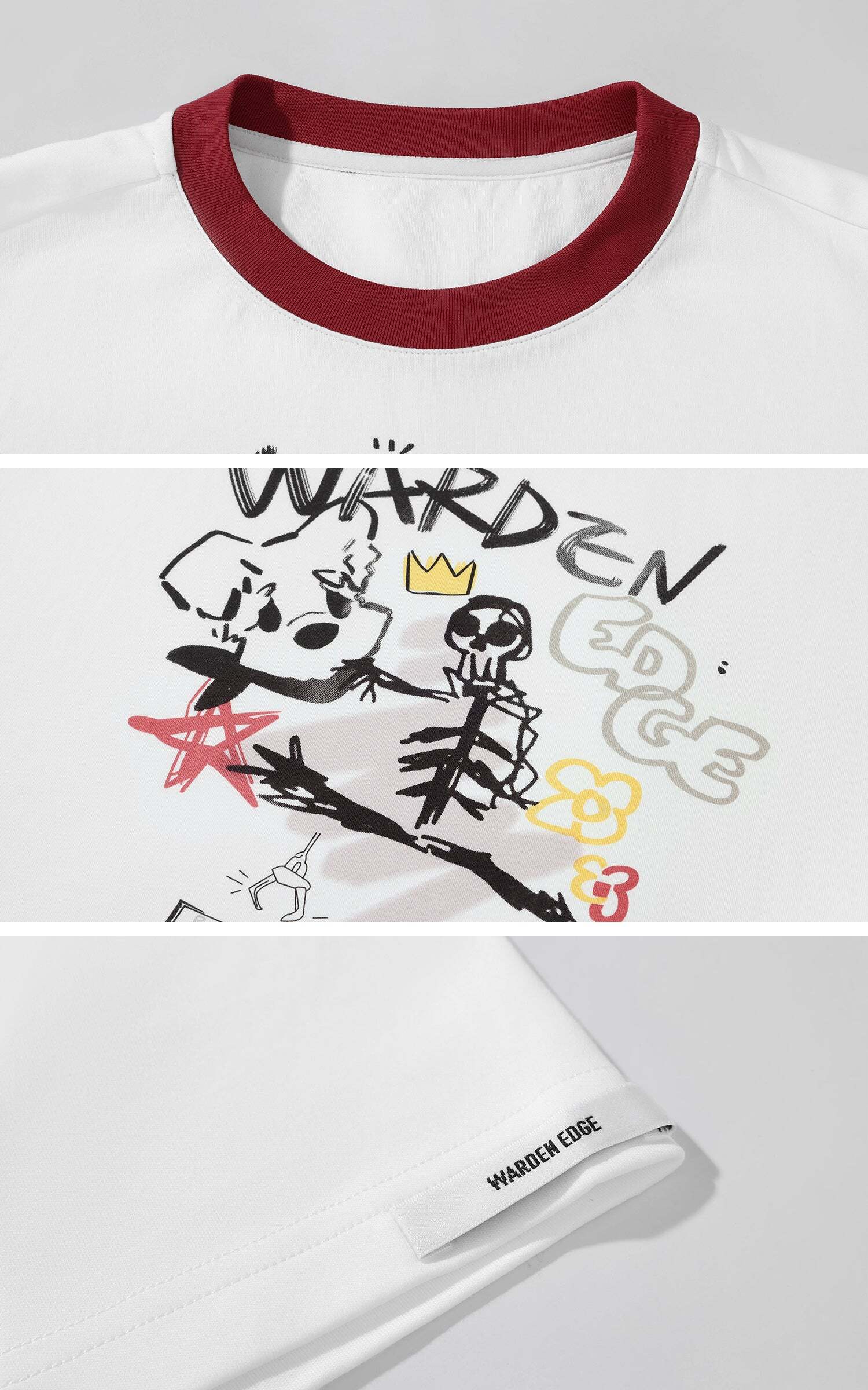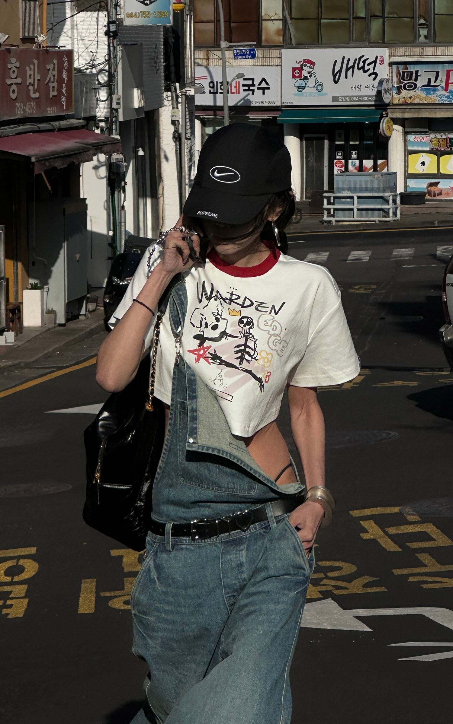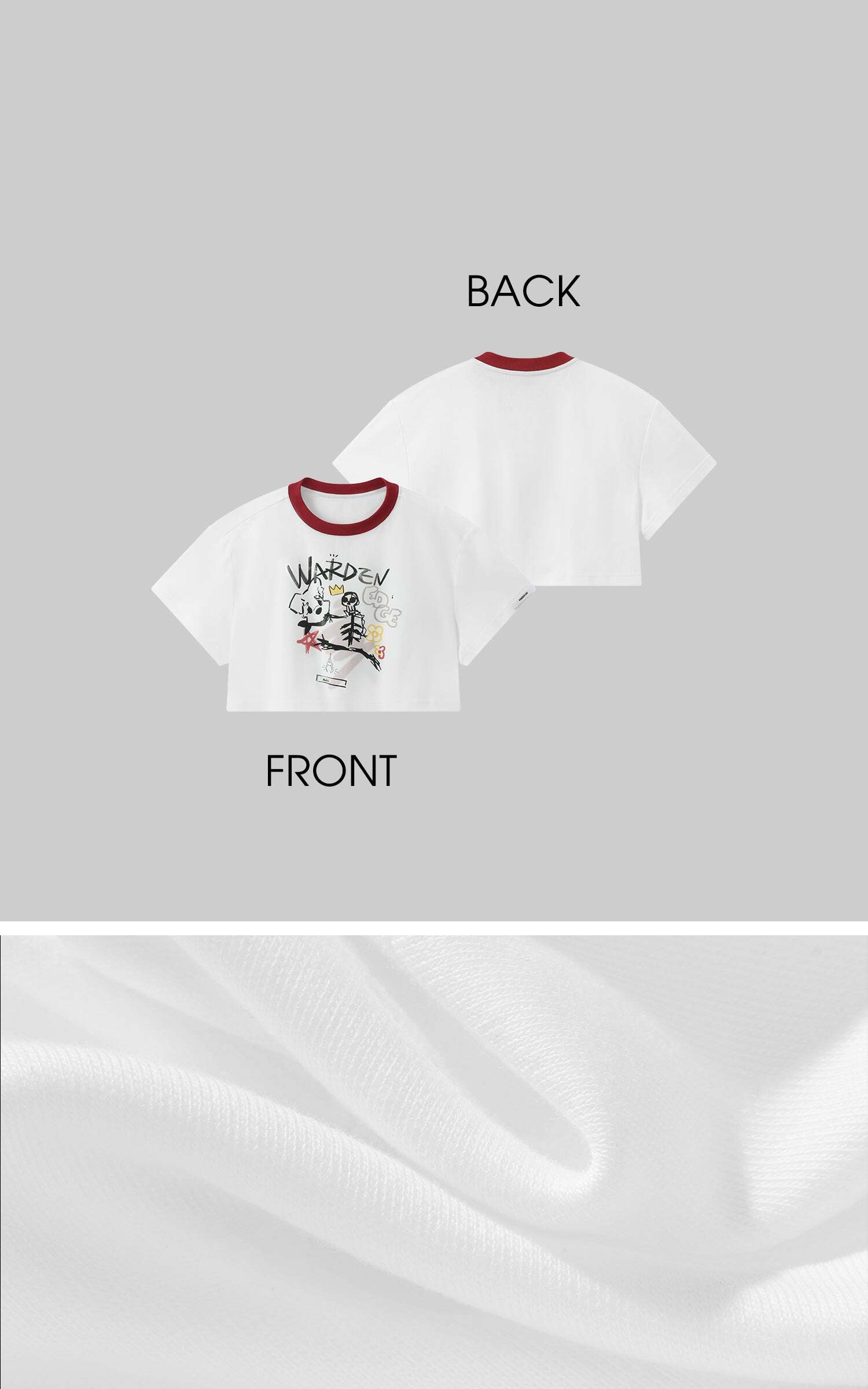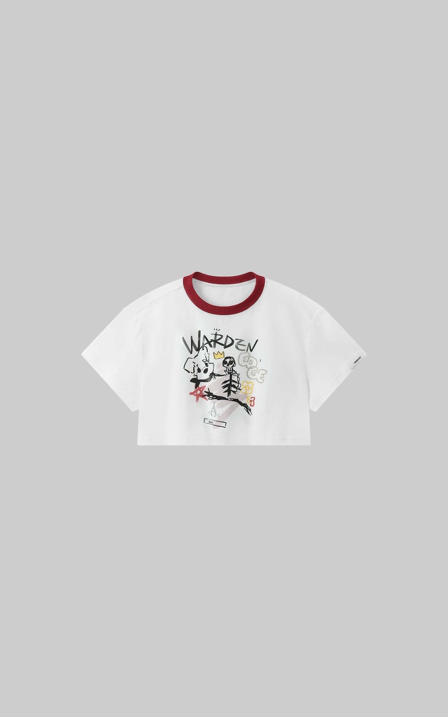 A bold cropped silhouette meets gritty street attitude. This boxy tee features a striking graffiti-inspired graphic with a mischievous puppy clutching a skeleton, layered with hand-drawn doodles, a crown, and a rebellious star. The deep burgundy ribbed neckline adds a punch of contrast against the crisp white base, while the cropped cut plays into early 2000s nostalgia and current underground codes. Crafted from soft yet structured cotton jersey, it hits just above the waist—made to pair with oversized denim, low-rise cuts, or layered beneath utility overalls. It’s more than just a tee—it’s a snapshot of chaos and charm.