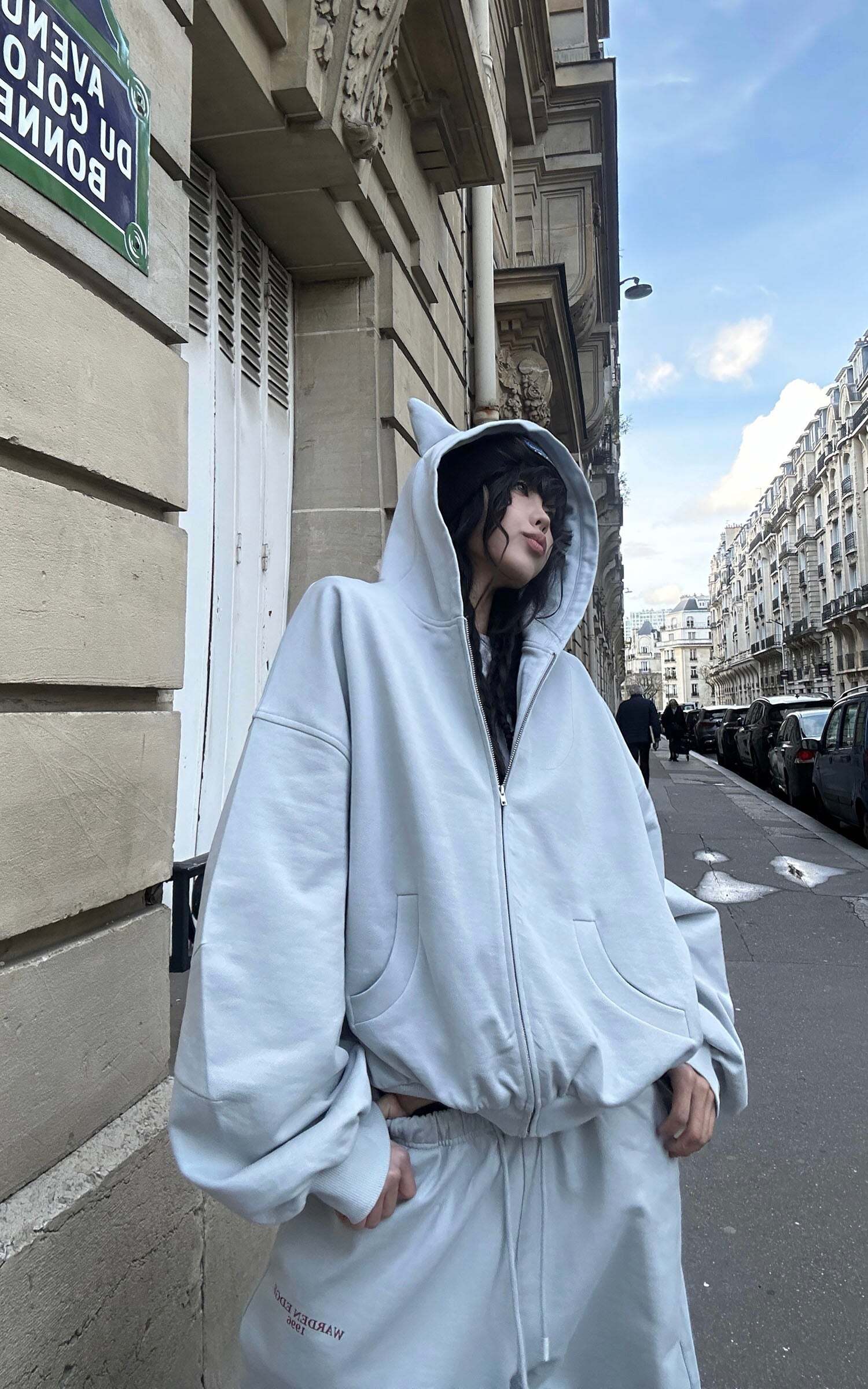 Relaxed, yet ready. A hoodie and wide-leg sweatpants set that redefines effortless citywear. Designed with a fluid silhouette, the sculpted 3D ears on the hood add a touch of playful rebellion. Premium cotton fabric ensures a soft, skin-friendly feel, making it an everyday essential. Featuring a two-way metal zipper for layering versatility and an adjustable waistband for the perfect fit. The oversized cut and draped wide-leg pants create an unrestrained, effortless look—where comfort meets attitude.