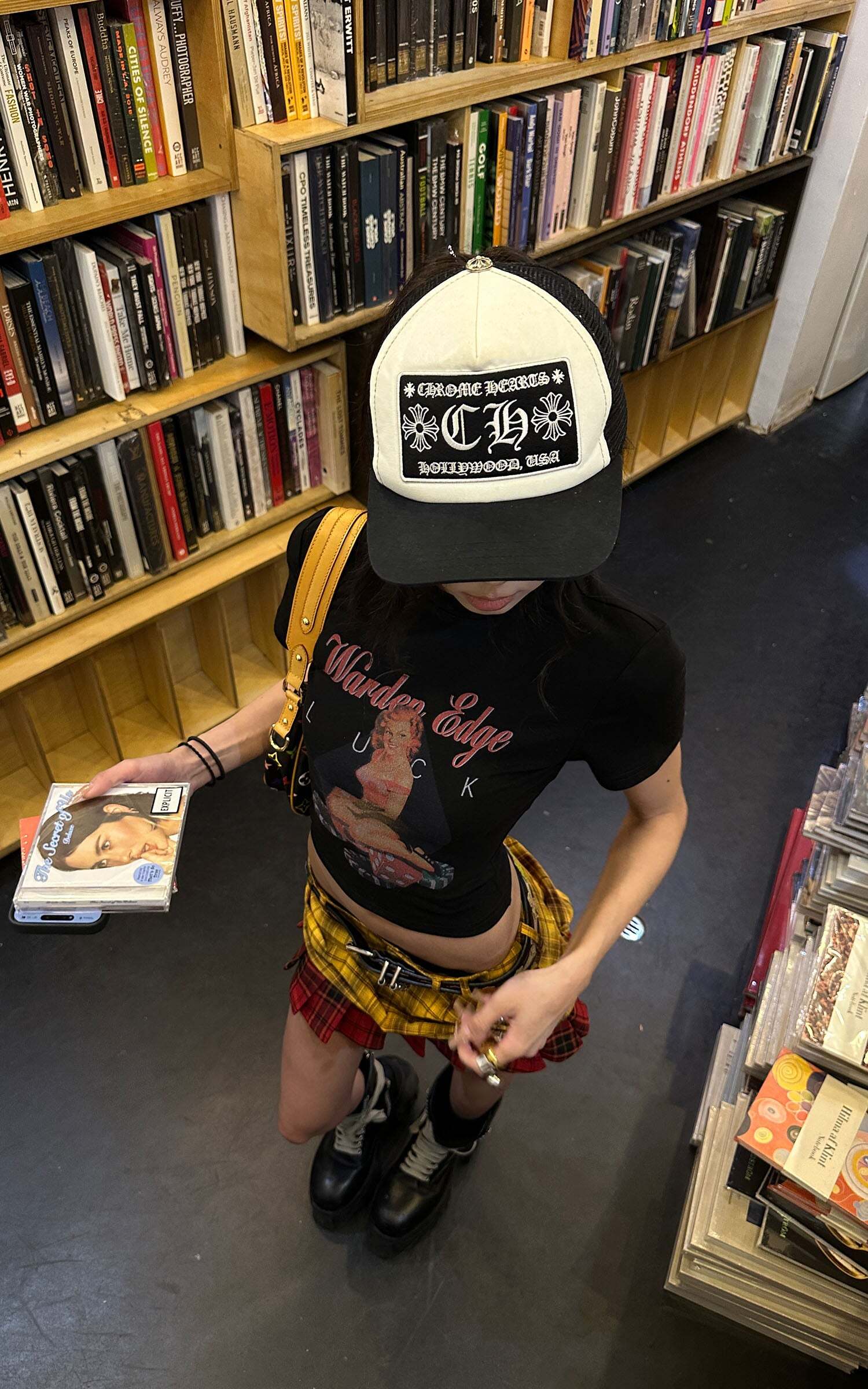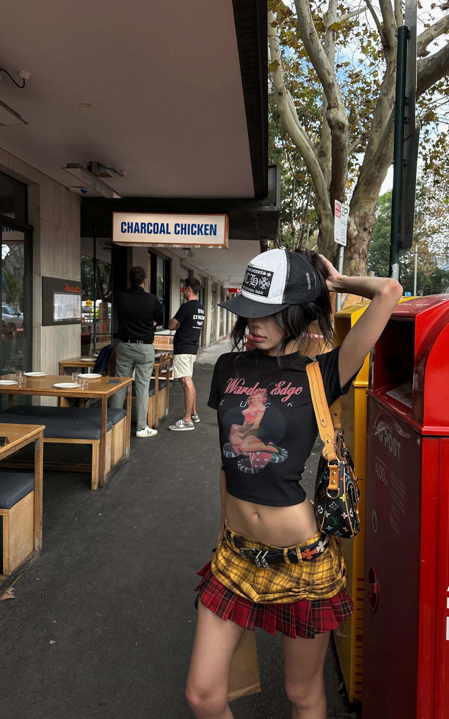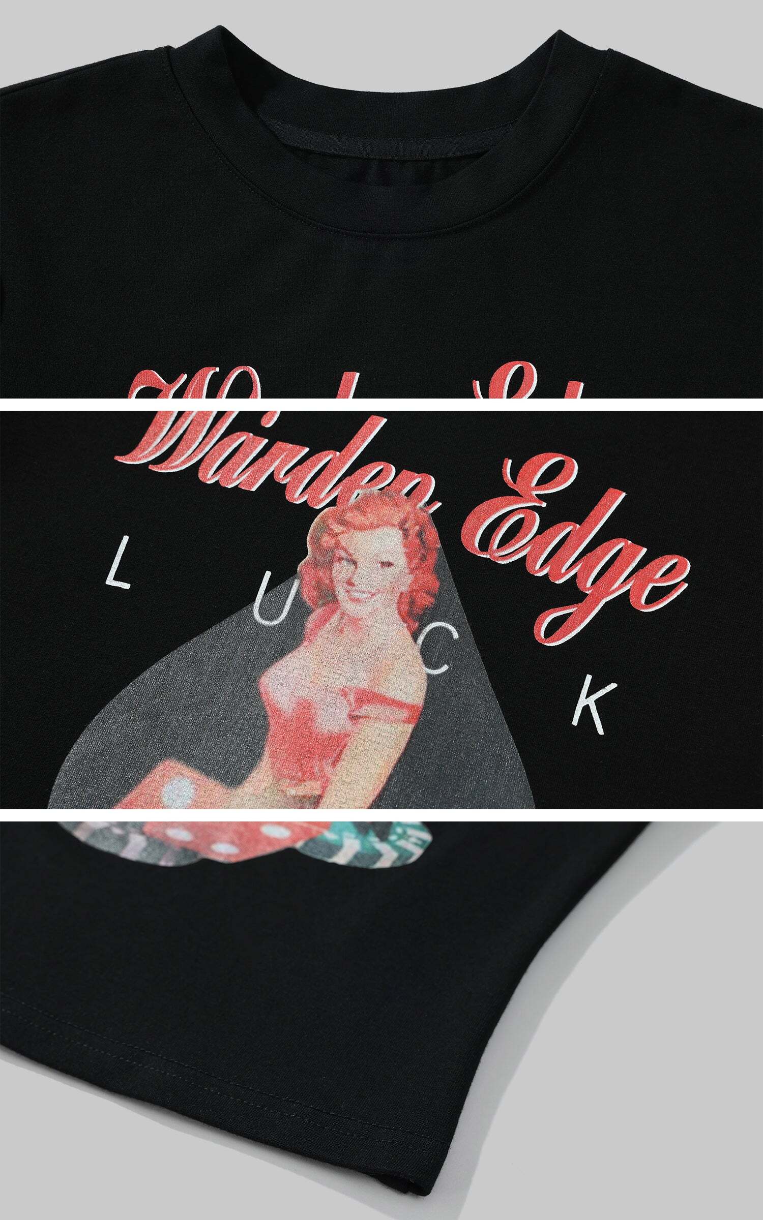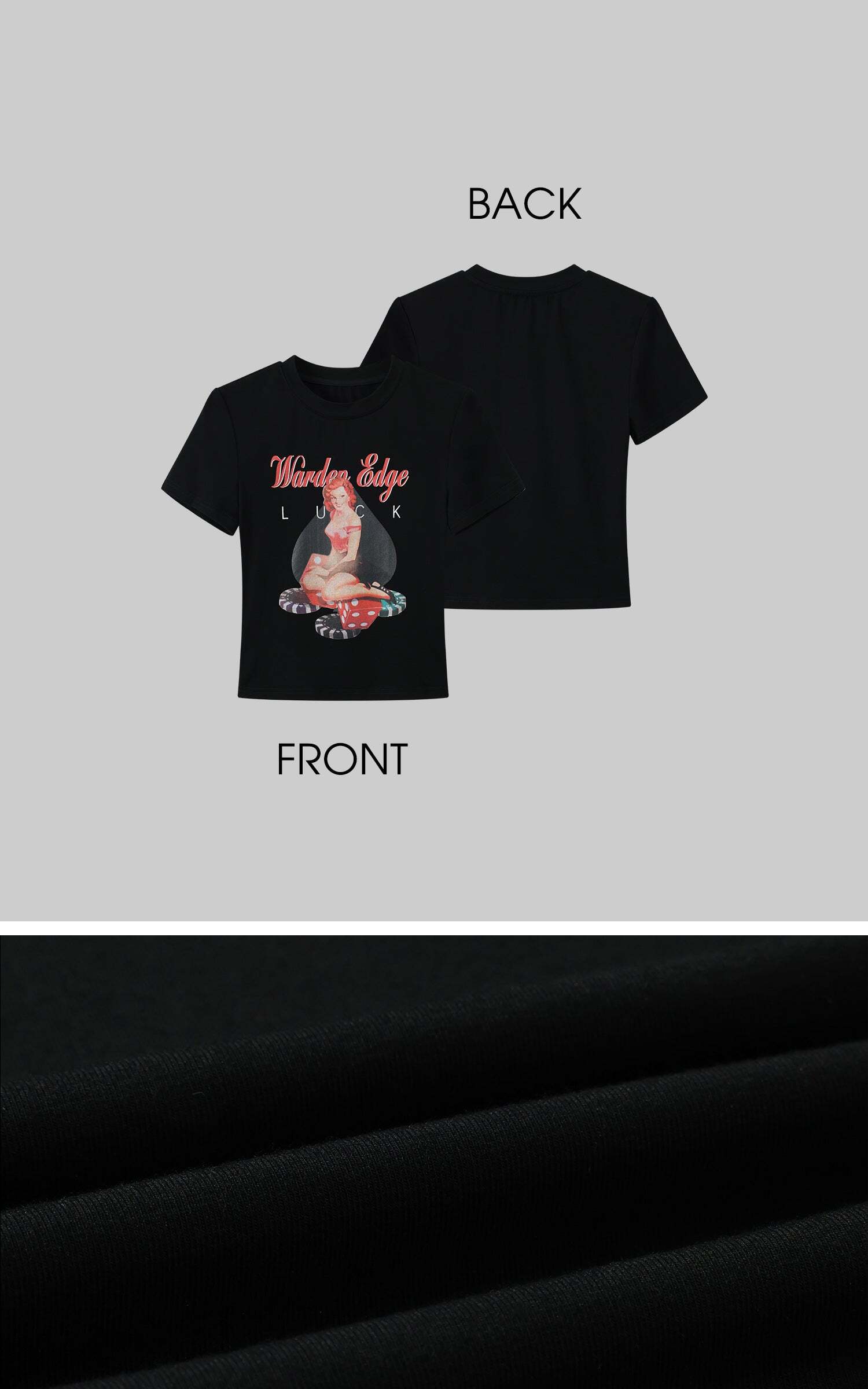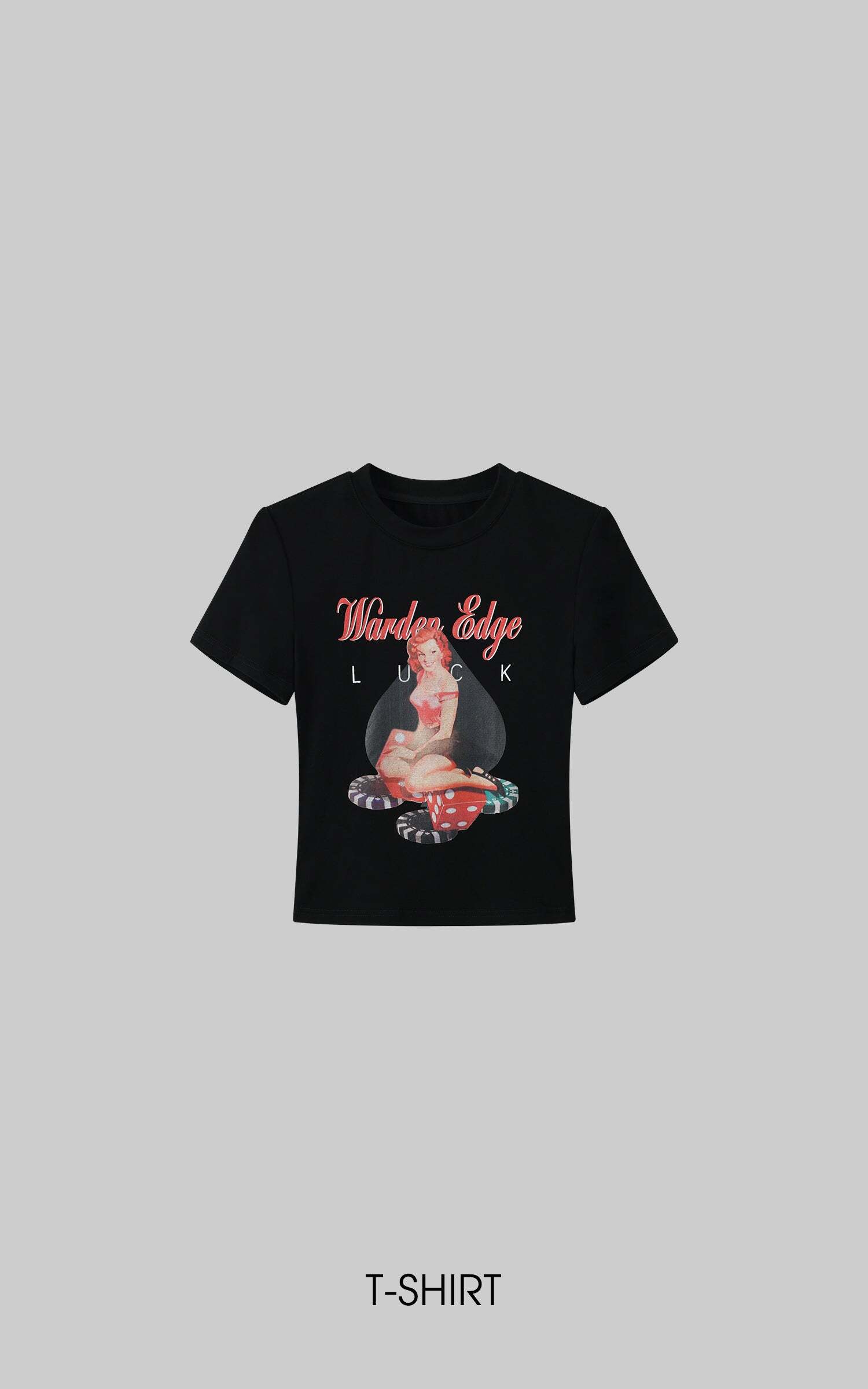 This cropped baby tee taps into retro Americana with a rebellious twist. A sultry pin-up girl lounges over a stack of poker chips, framed by a bold spade motif and nostalgic type. The ultra-fitted silhouette and mid-weight stretch cotton make it the go-to piece for low-rise styling, adding instant attitude. Whether you’re playing your hand or just dressing the part, this tee deals the perfect mix of irony and sex appeal.