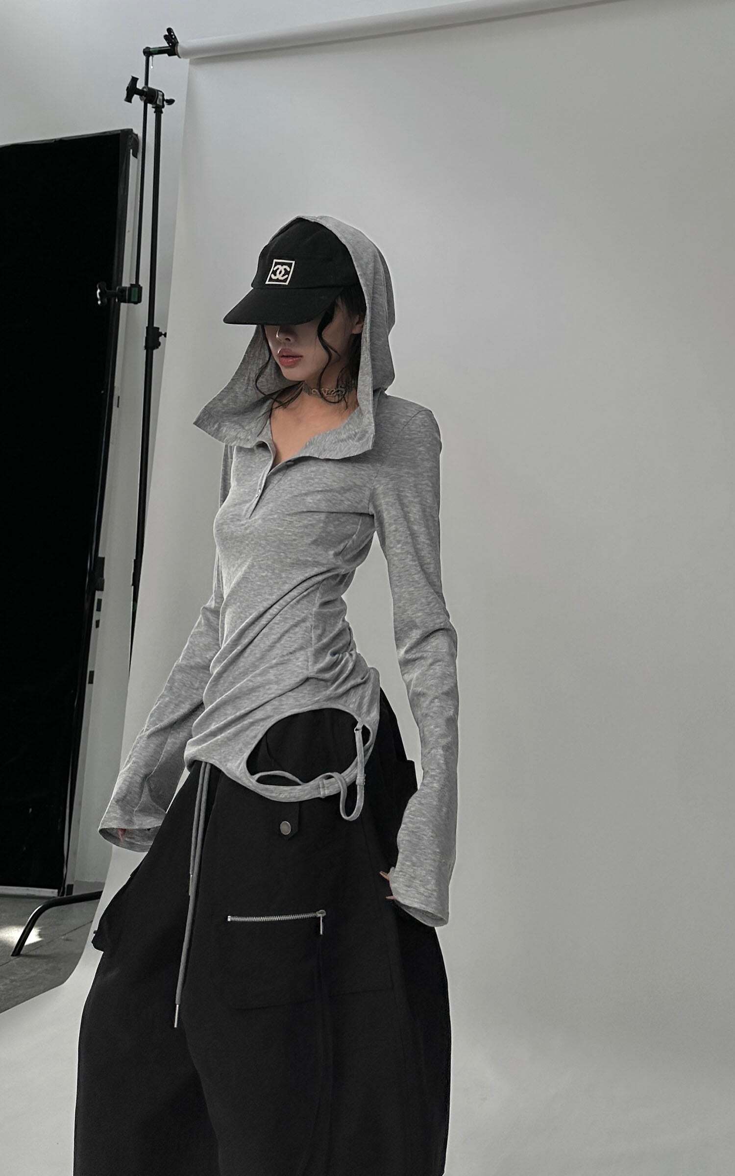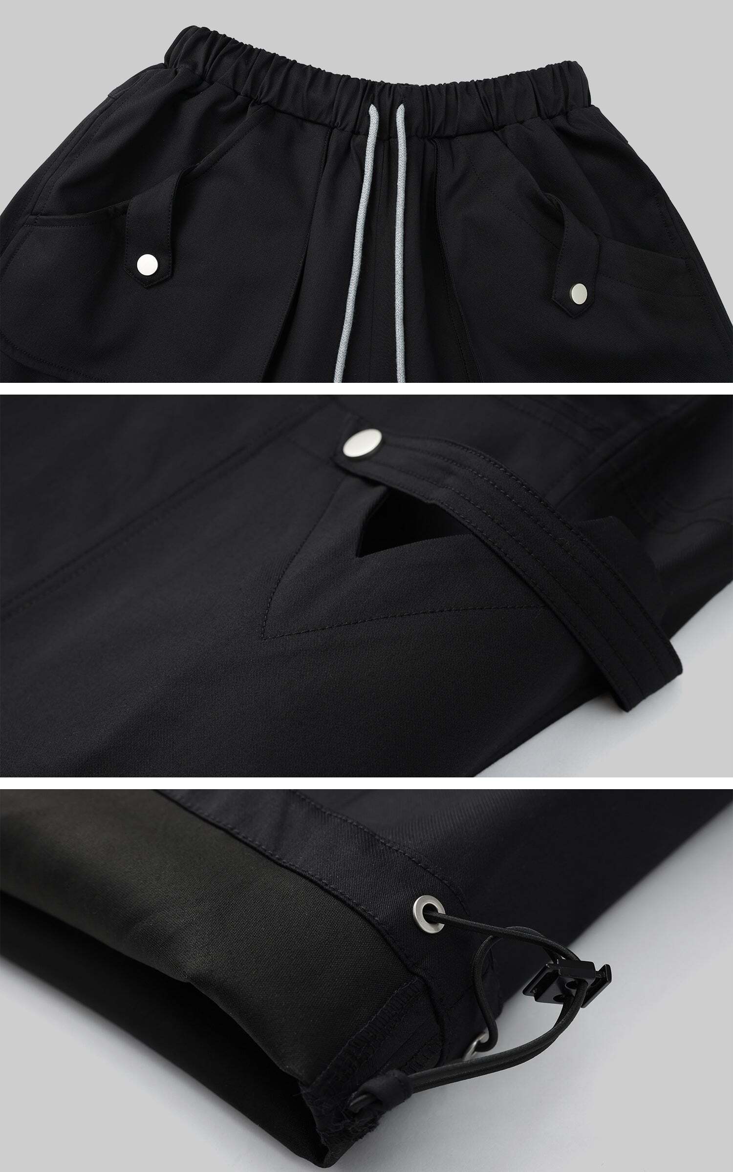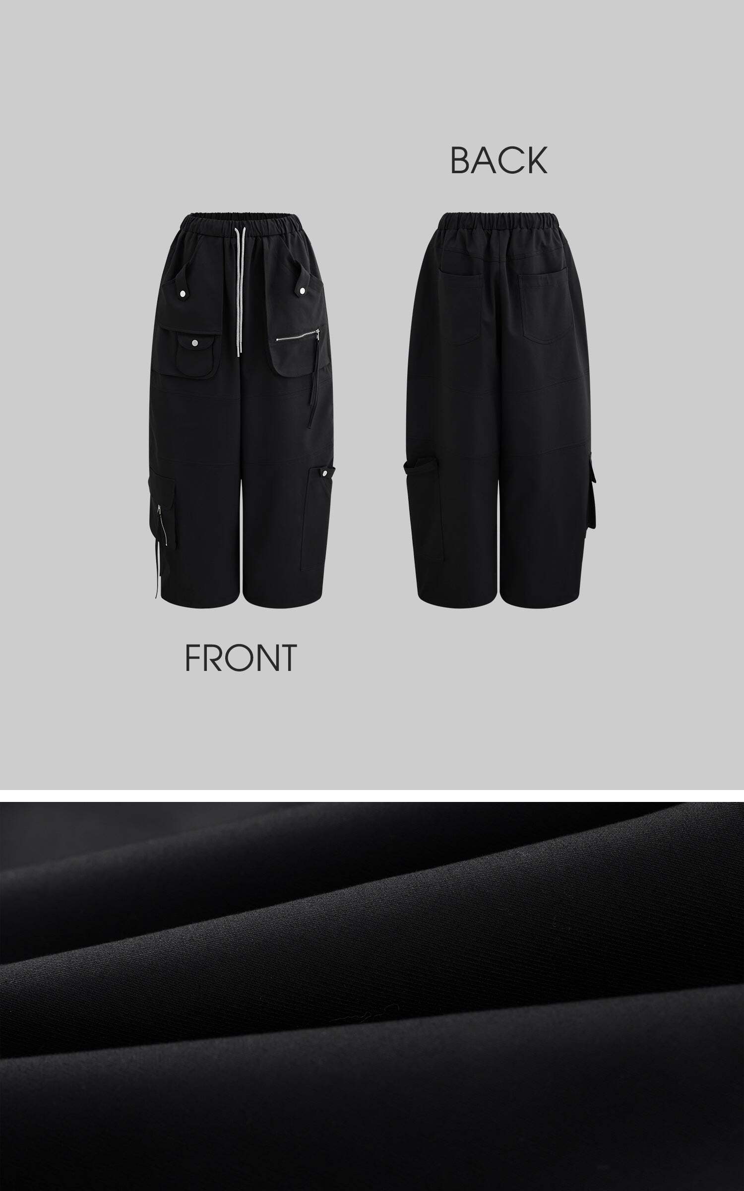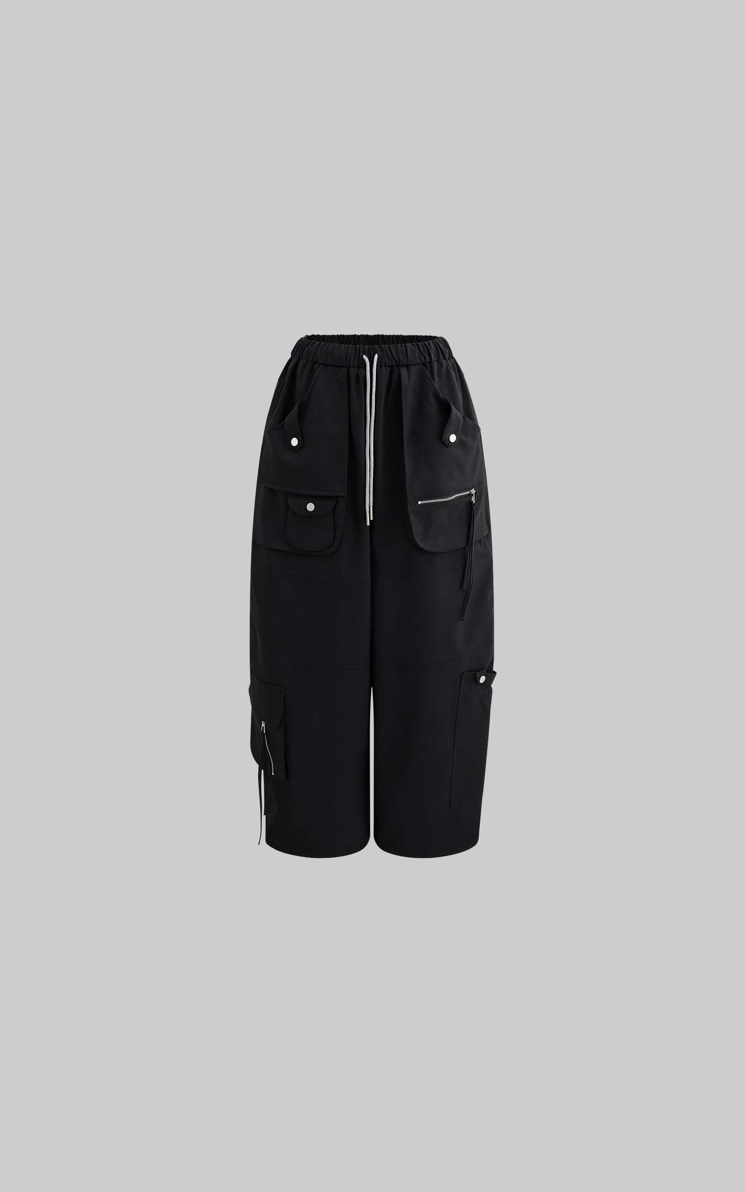 A new interpretation of utilitarian aesthetics, these high-waisted wide-leg cargo pants fuse a fluid silhouette with a structured, functional edge. The elasticated waistband with drawstrings ensures a customizable fit, while the multi-pocket design adds both depth and practicality. Adjustable drawstrings at the sides and hem allow for a personalized styling approach, offering versatility in movement and form. The crisp fabric lends a sculptural quality to the design, making it a statement piece for both everyday wear and urban exploration.
