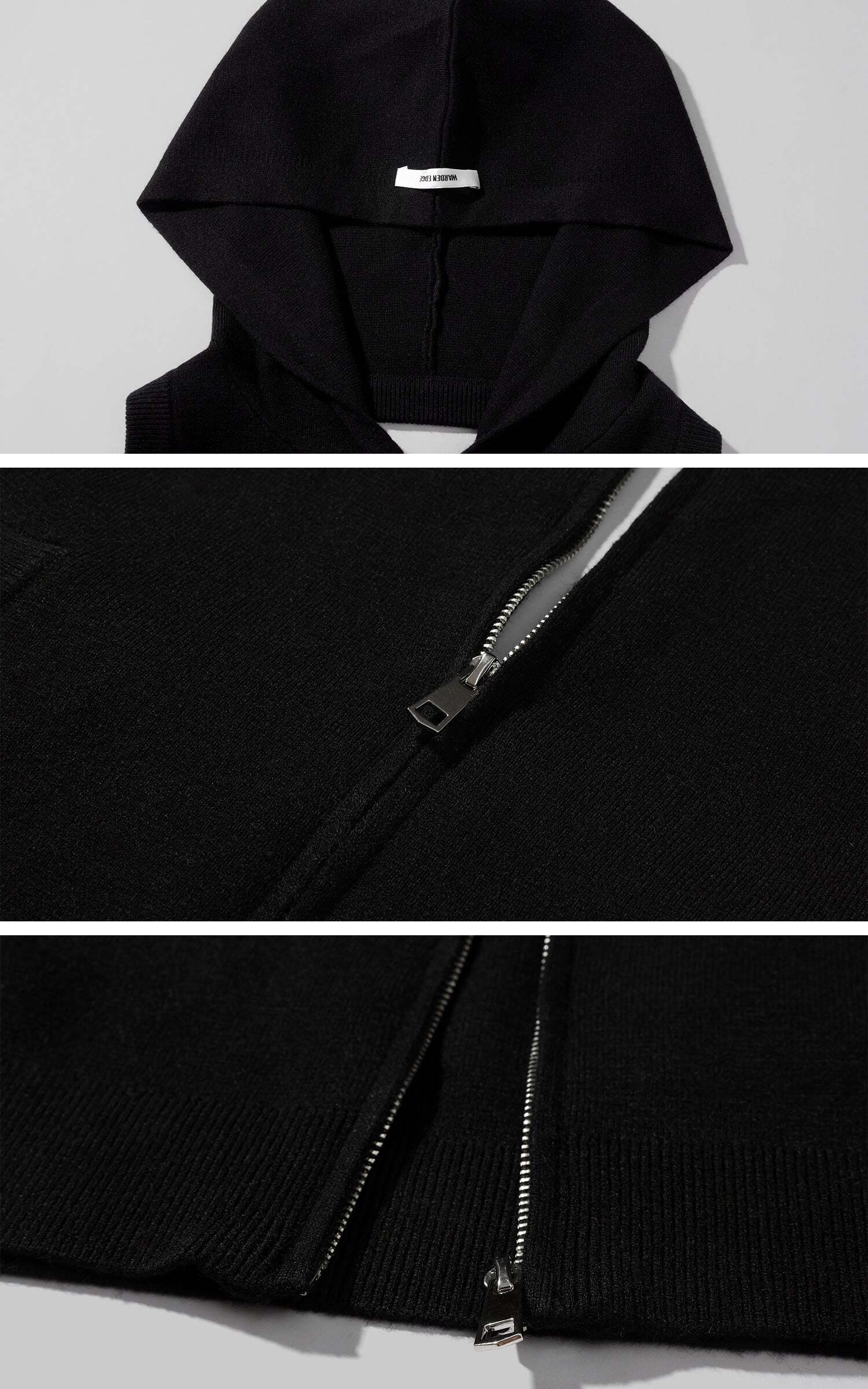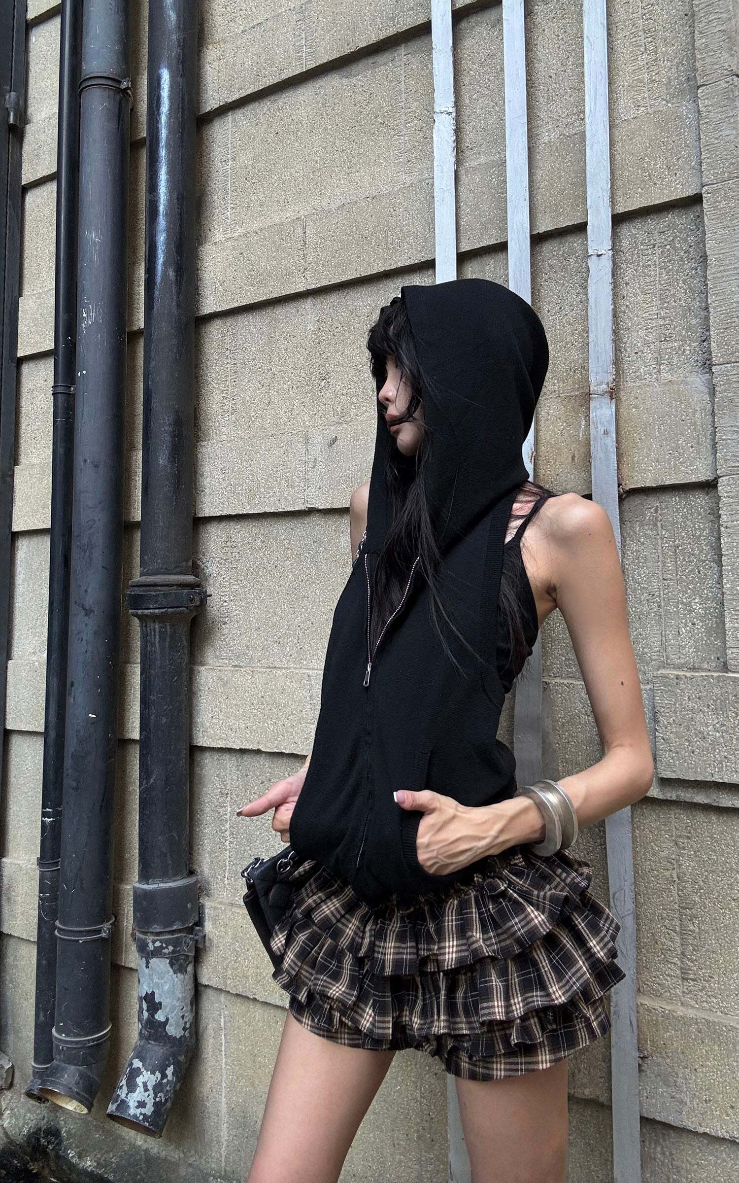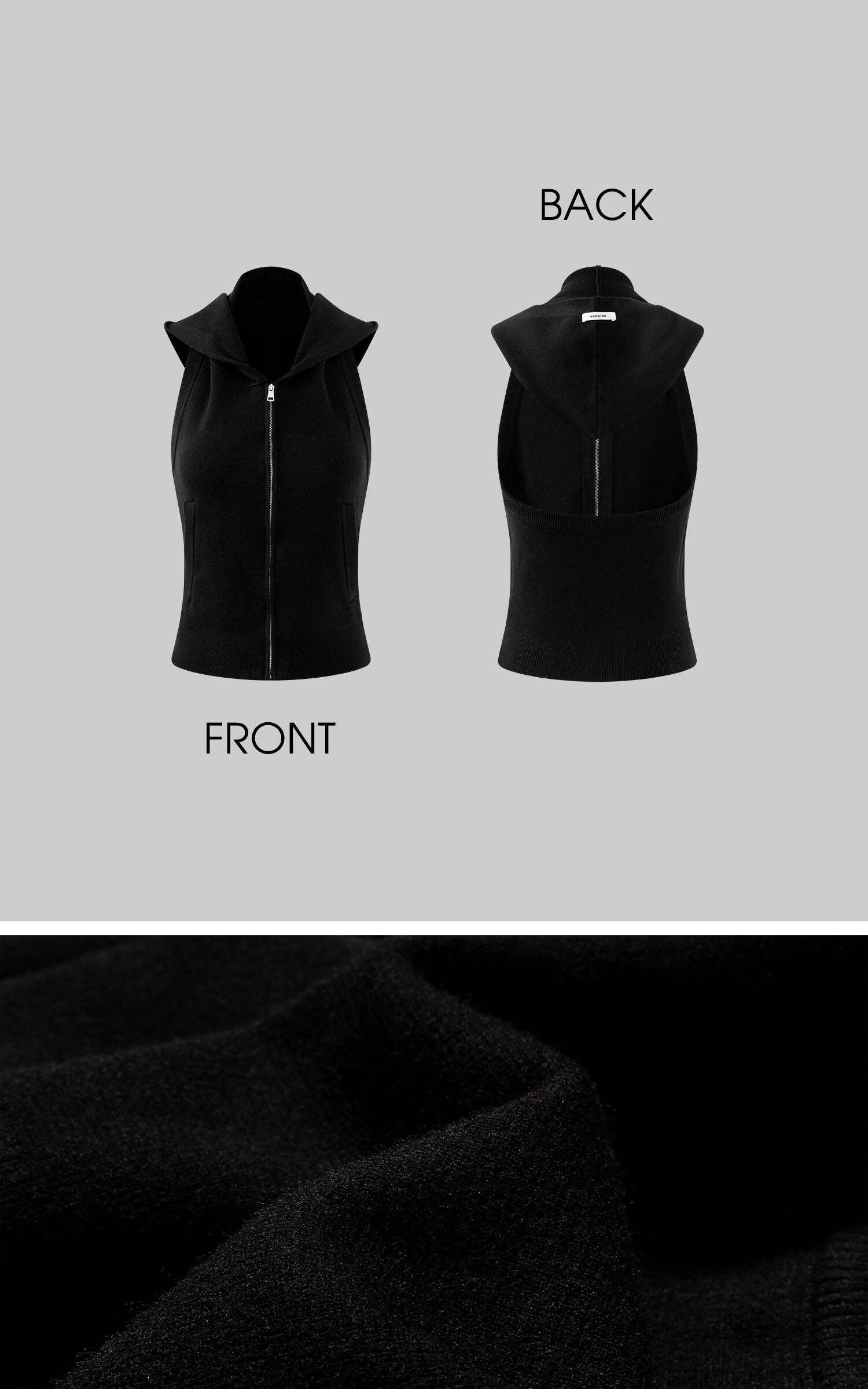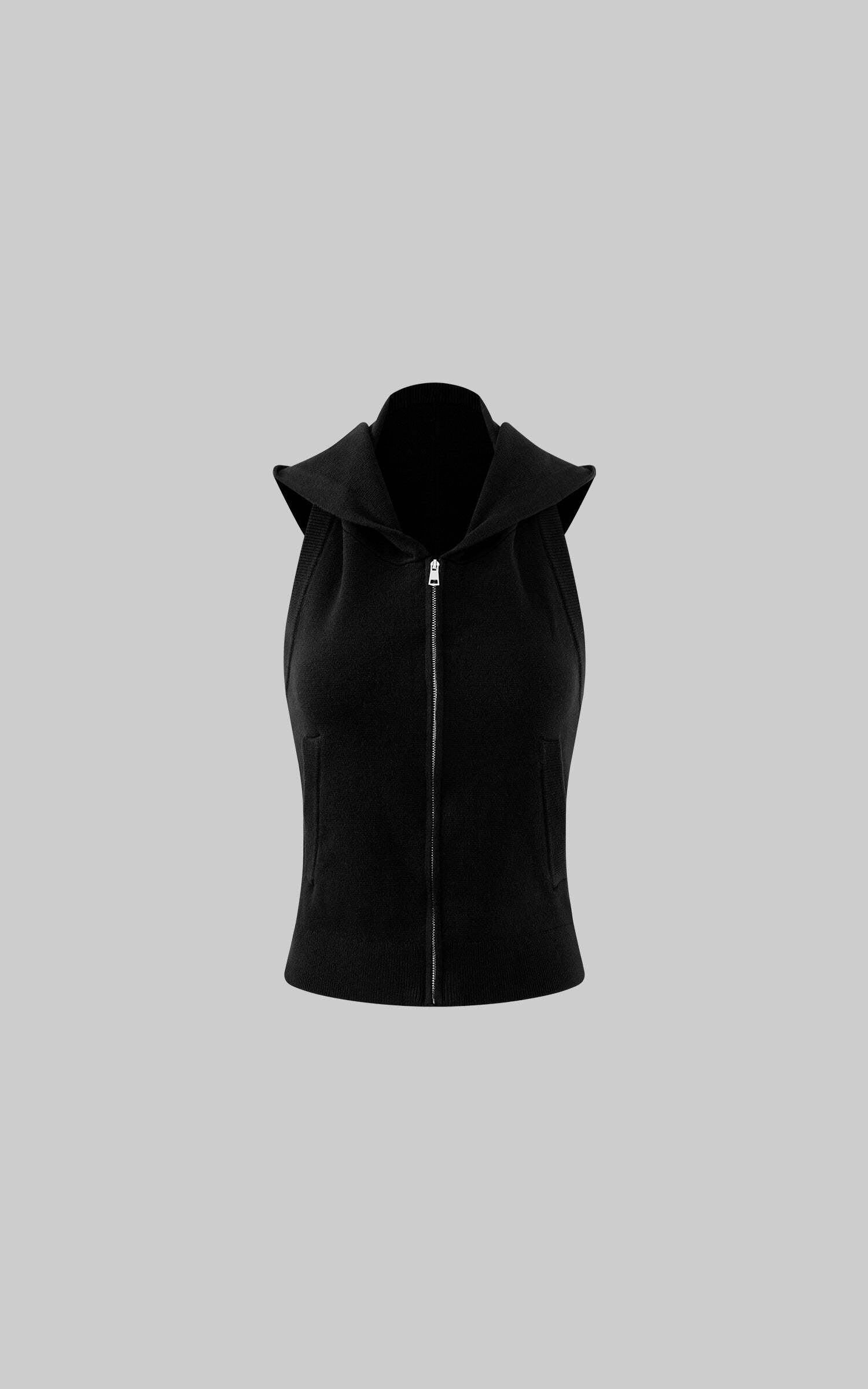 A sleeveless knit vest built with sharp minimalism. Featuring a structured hood, front metal zip, and subtle pocket details, it merges utility with edge. The resilient knit fabric molds to the body, delivering a balance of comfort and attitude. Designed to be layered or worn alone, it captures a raw, urban spirit with effortless cool.