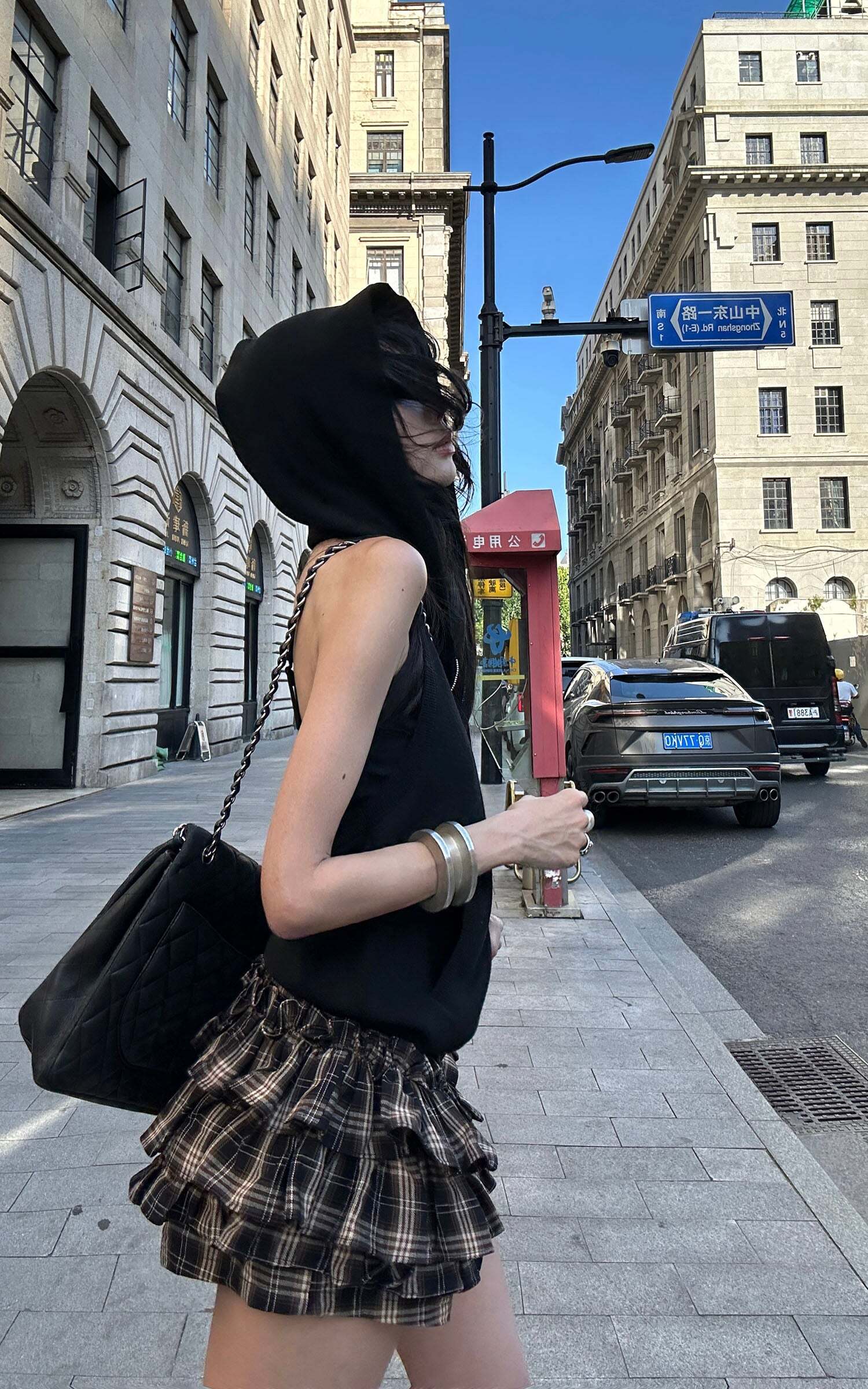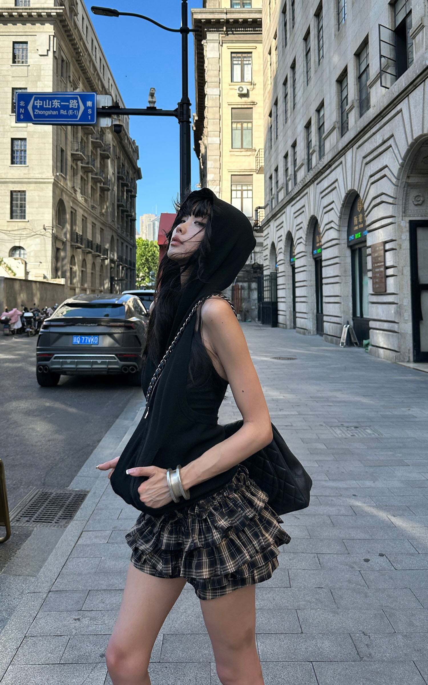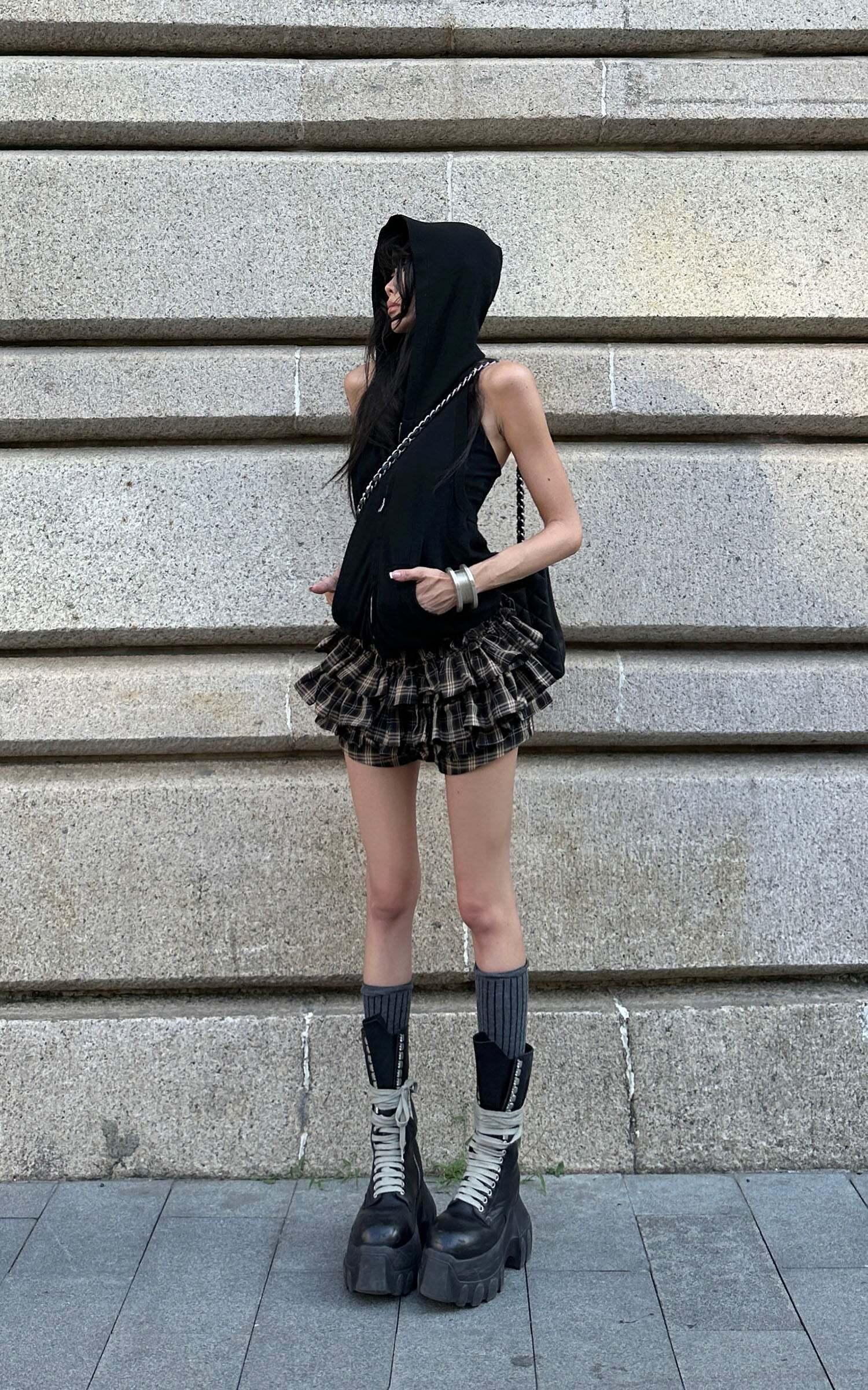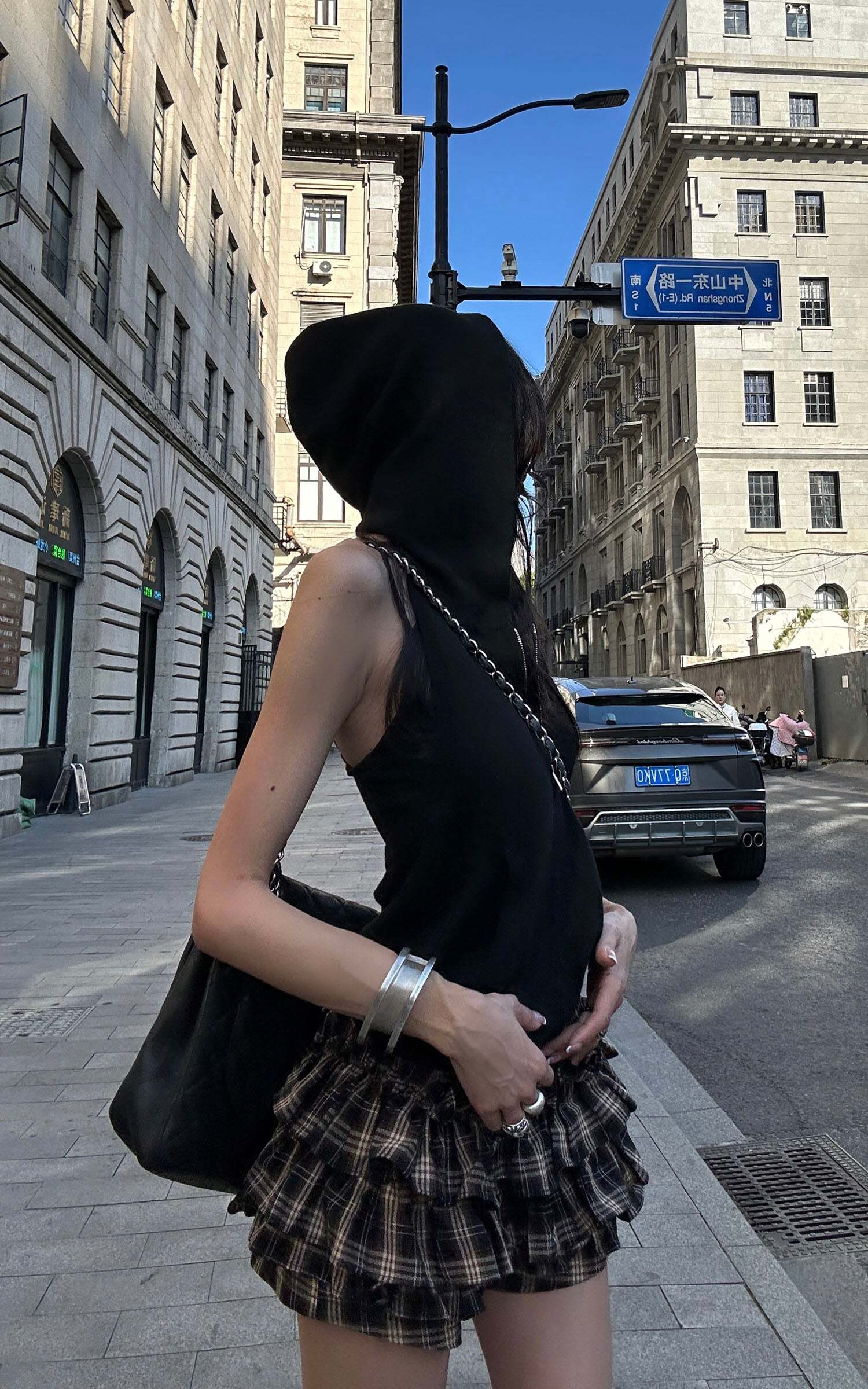 A sleeveless knit vest built with sharp minimalism. Featuring a structured hood, front metal zip, and subtle pocket details, it merges utility with edge. The resilient knit fabric molds to the body, delivering a balance of comfort and attitude. Designed to be layered or worn alone, it captures a raw, urban spirit with effortless cool.