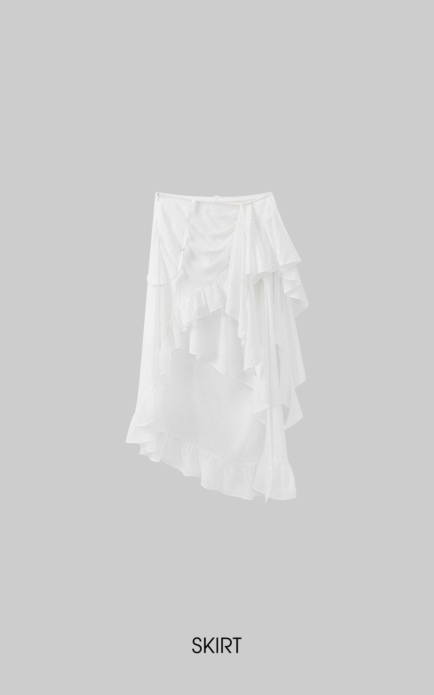 This midi skirt deconstructs the ordinary with asymmetric ruffles, layered sheers, and raw elegance. Combining broderie anglaise with soft chiffon and jersey trims, it wraps around the body like a fragmented memory of romance and resistance. Unbalanced by design, this piece reshapes softness into strength—flowing with intention, cut to provoke.
