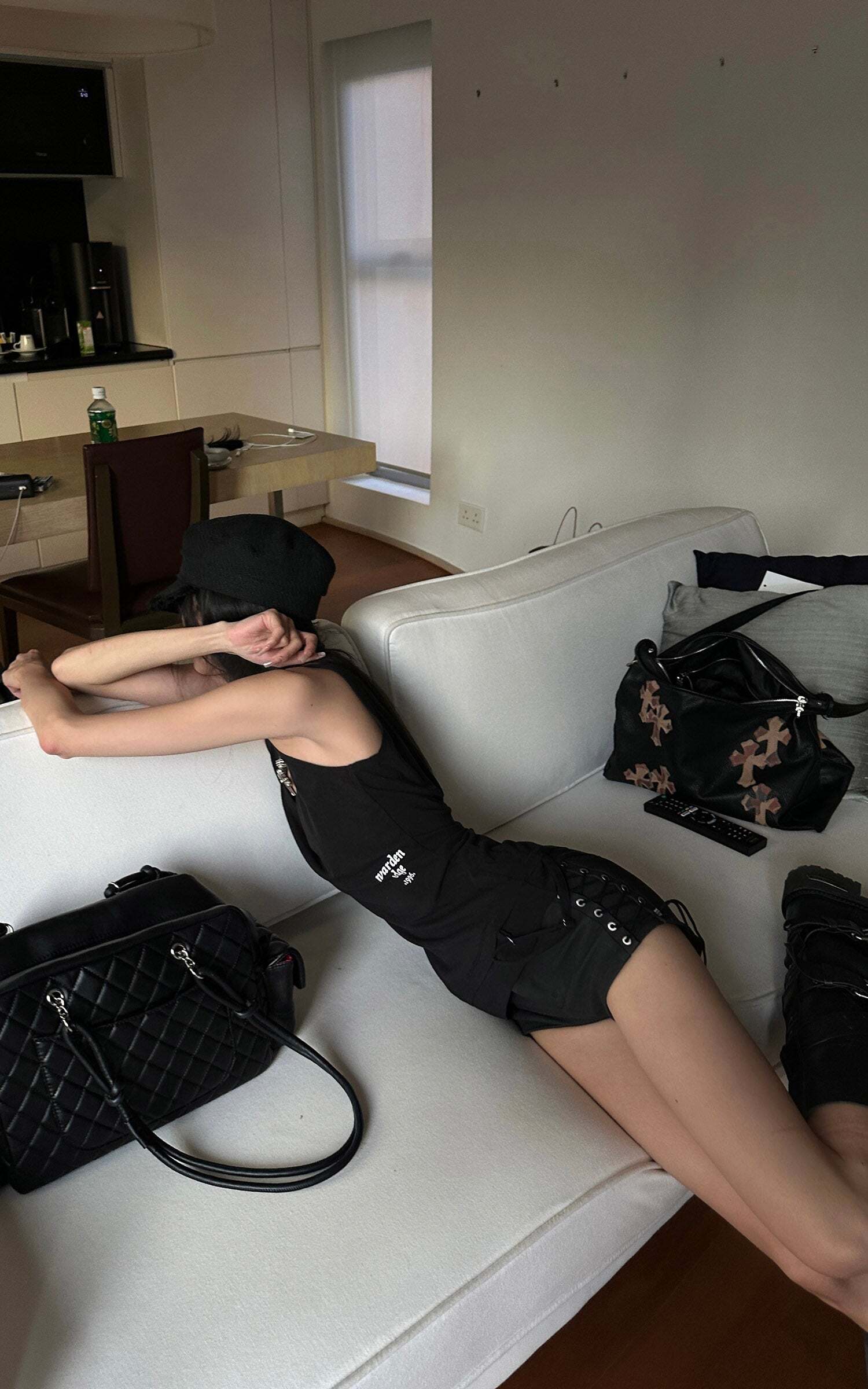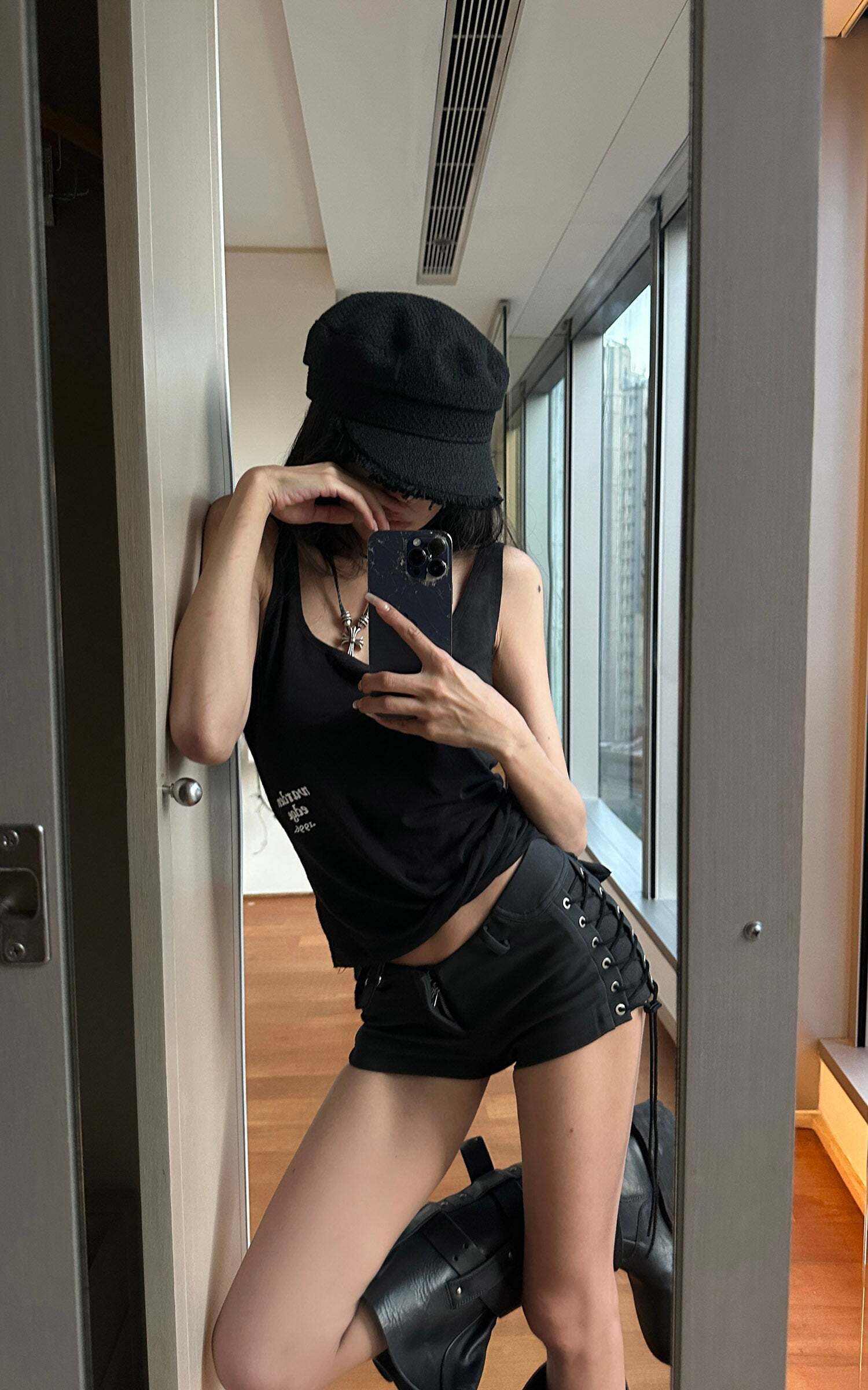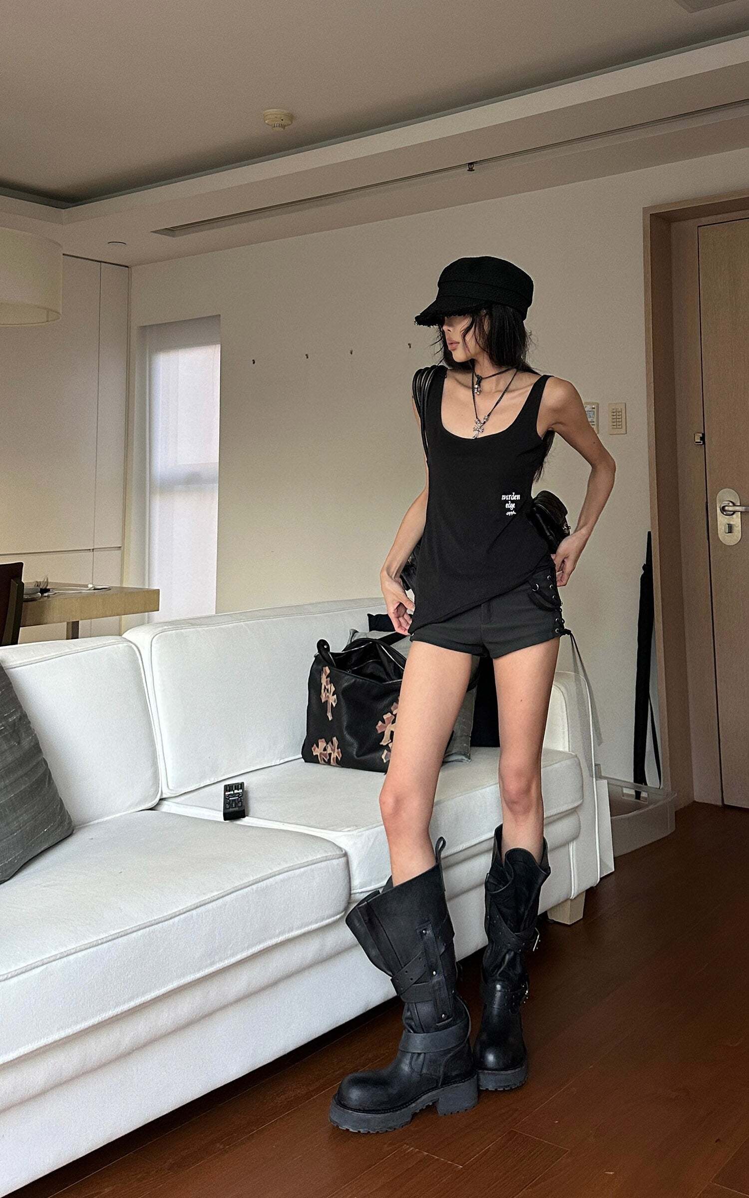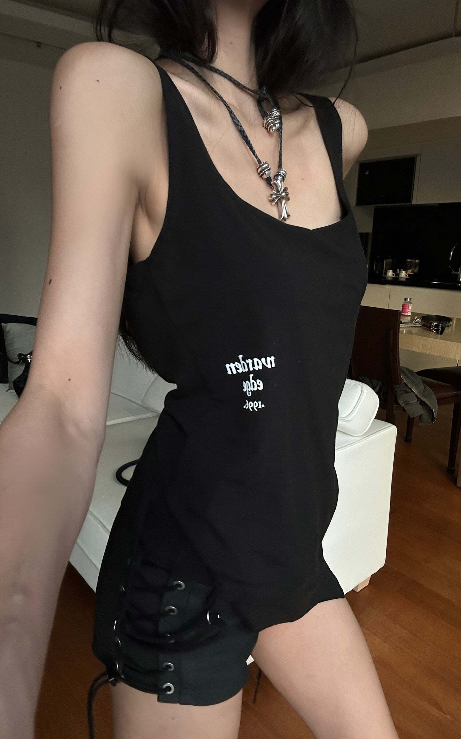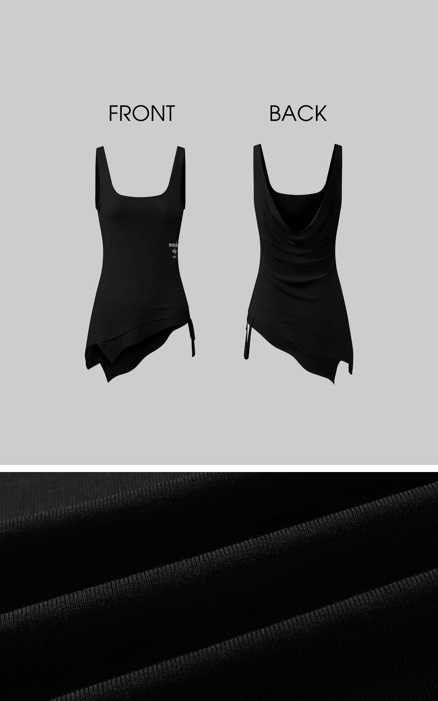 Built with attitude and subversion, this asymmetrical tank features a draped back and double-layer hem that breaks from symmetry. The ribbed stretch cotton hugs close, while a functional side strap adds edge and utility. Meant to pair with nothing but confidence—or low-rise leather and lace-up boots.