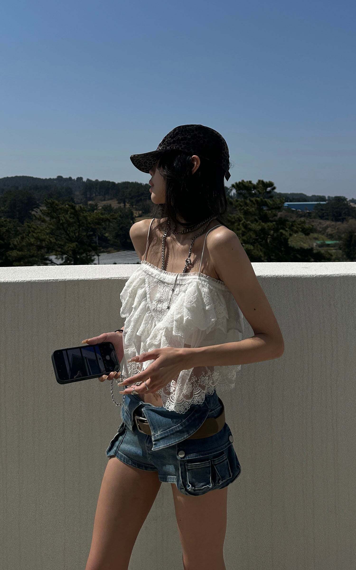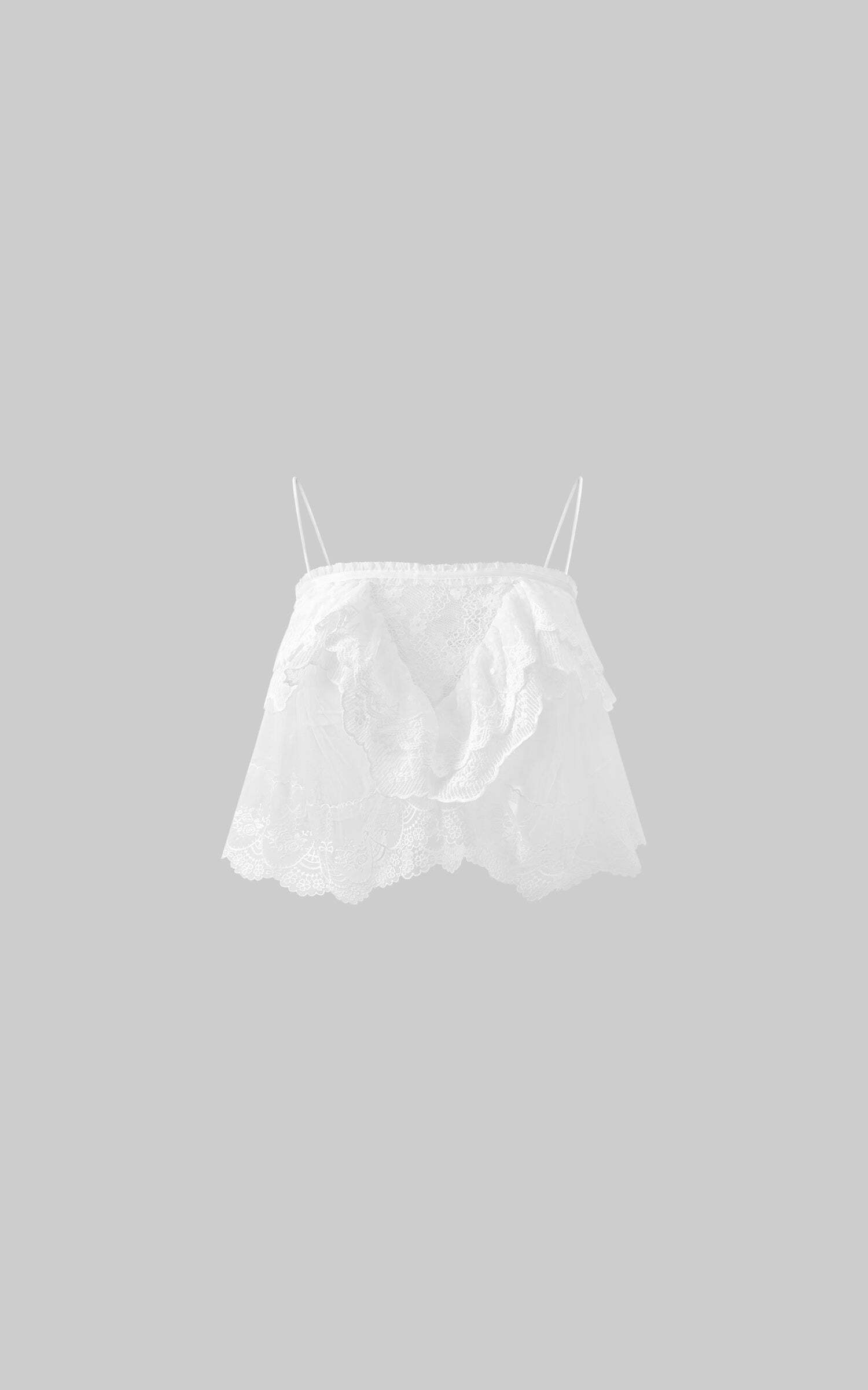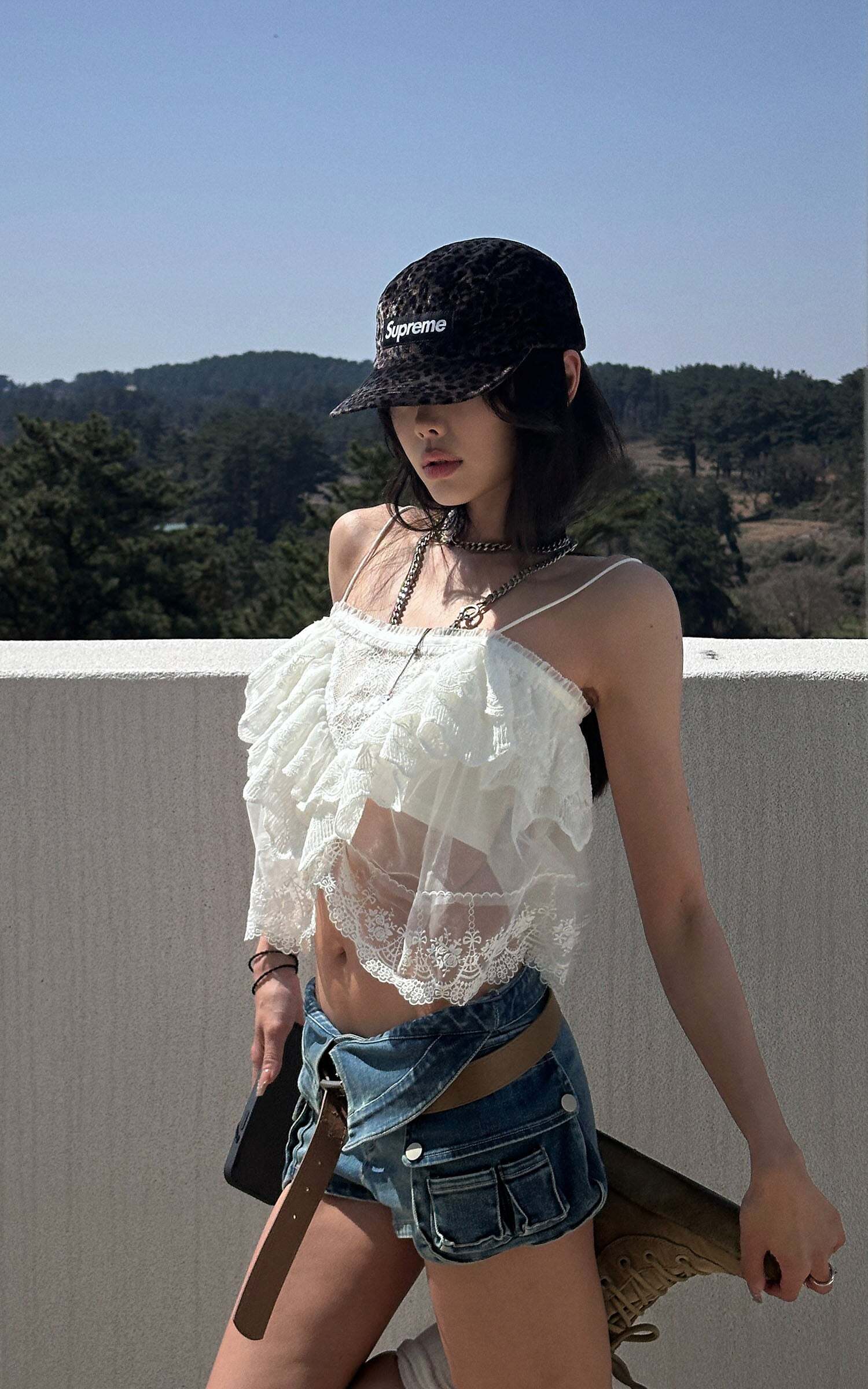 A whisper of rebellion wrapped in innocence. This sheer cami top reimagines romantic codes with a streetwise lens—featuring cascading lace ruffles, a sharp V-shaped insert, and a soft inner bandeau for structure and comfort. The asymmetric scalloped hem floats just above the waist, designed to move with you. Best worn under the sun with low-rise denim and attitude.