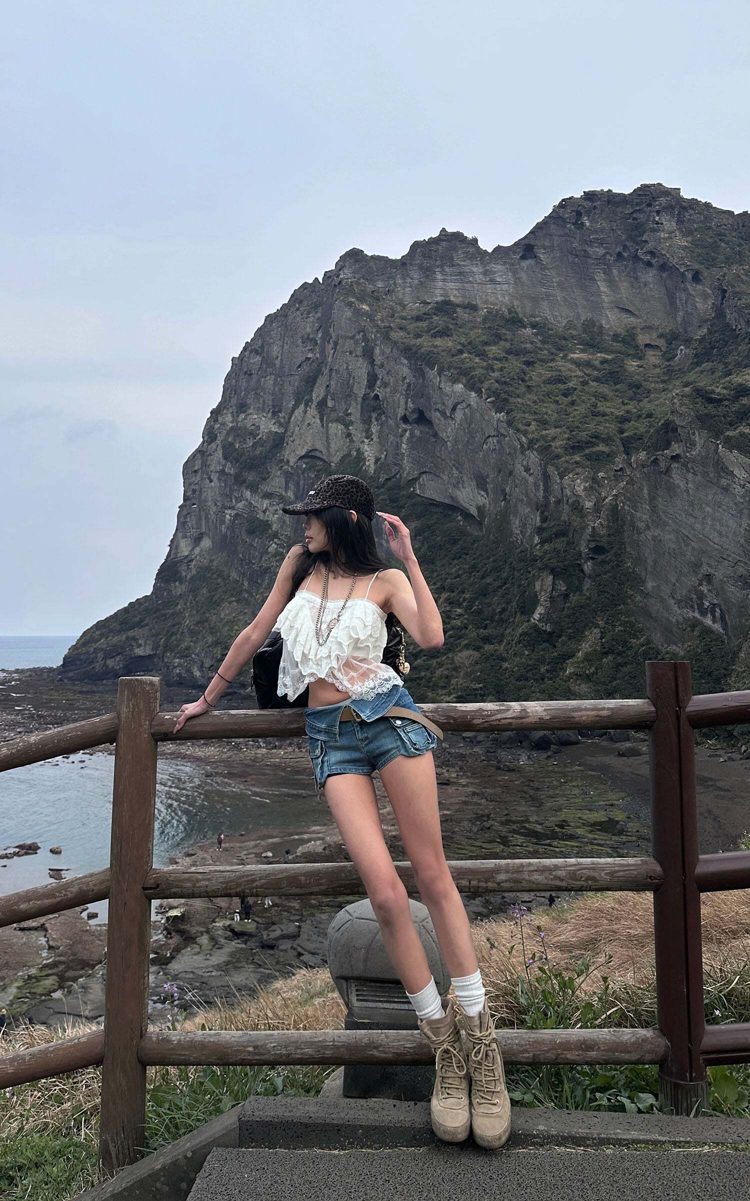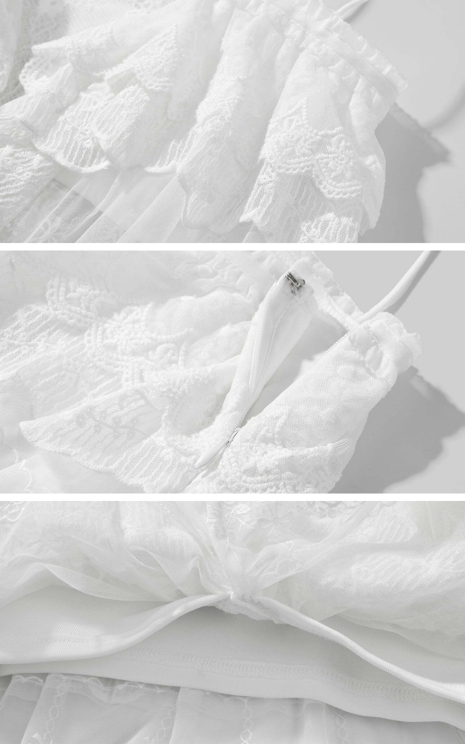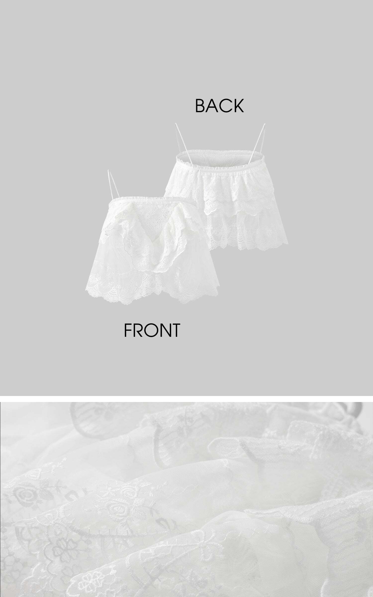 A whisper of rebellion wrapped in innocence. This sheer cami top reimagines romantic codes with a streetwise lens—featuring cascading lace ruffles, a sharp V-shaped insert, and a soft inner bandeau for structure and comfort. The asymmetric scalloped hem floats just above the waist, designed to move with you. Best worn under the sun with low-rise denim and attitude.
