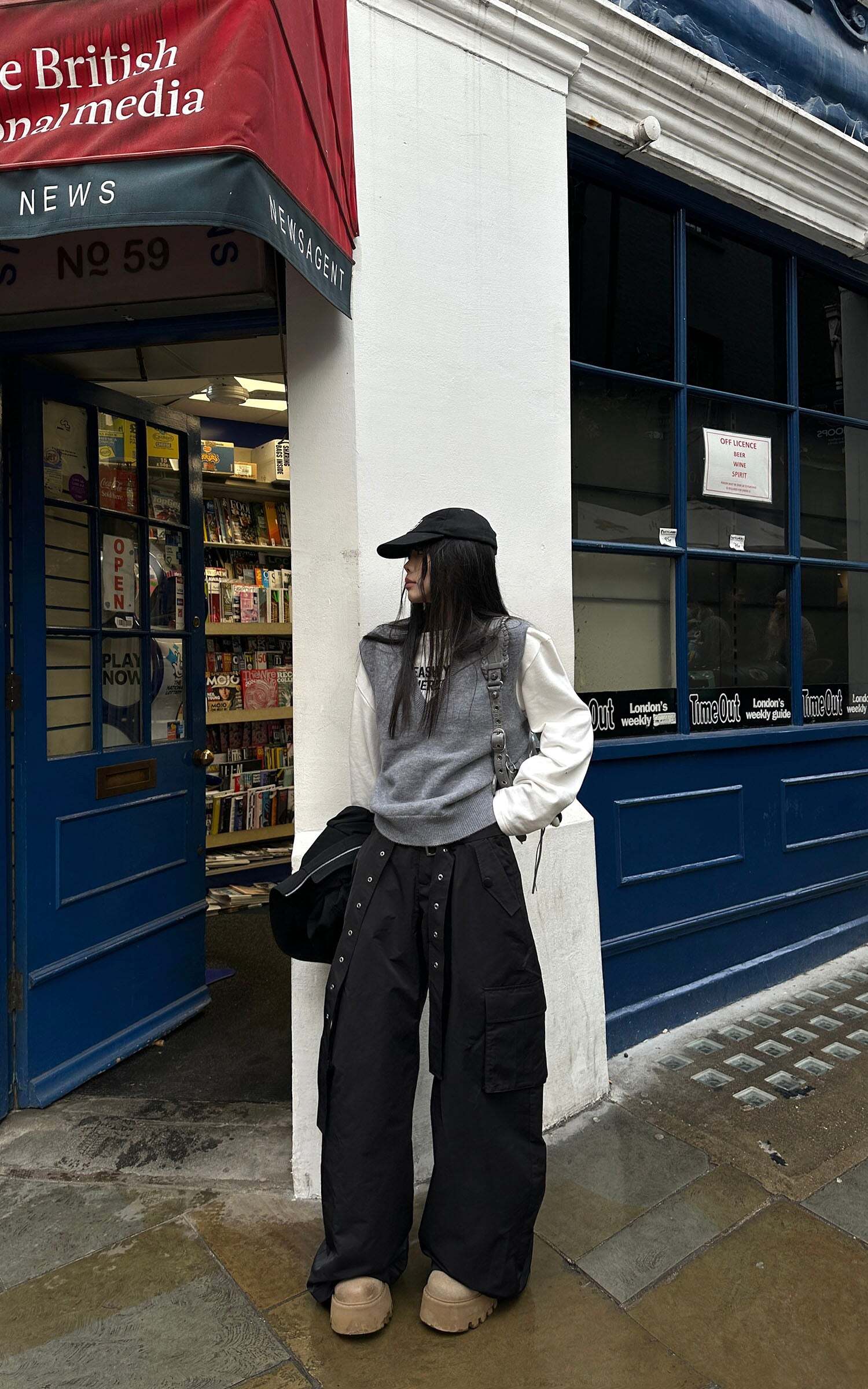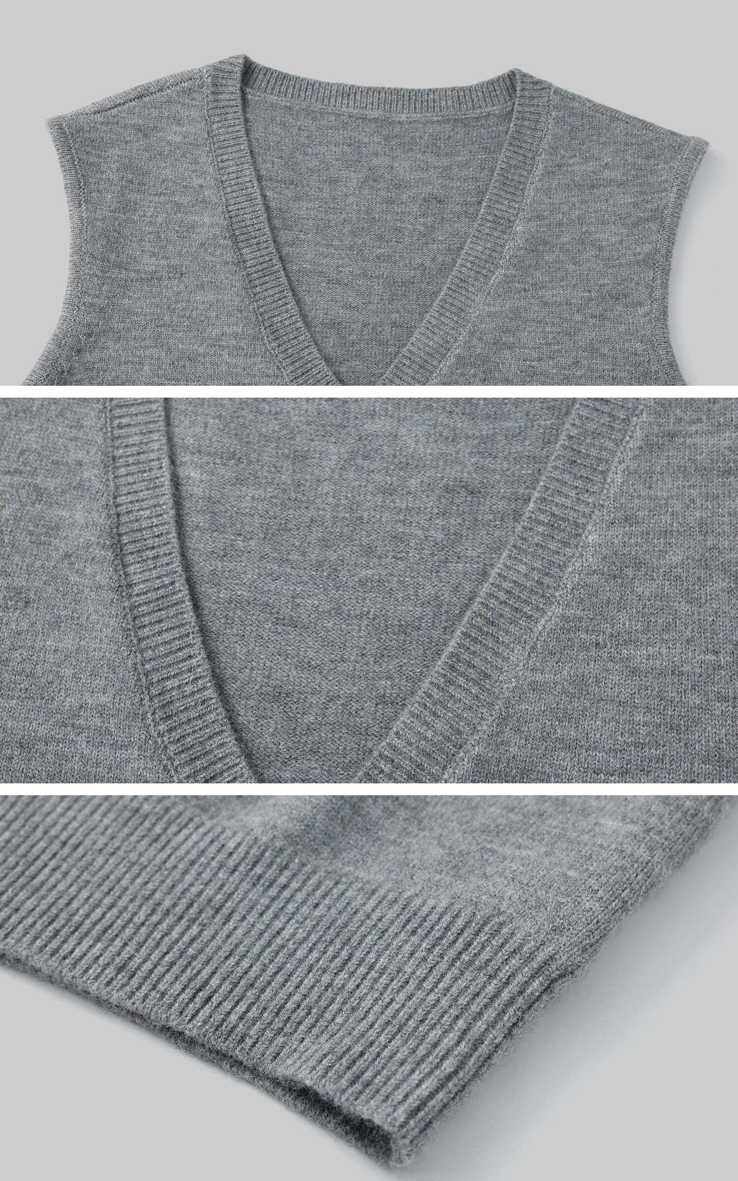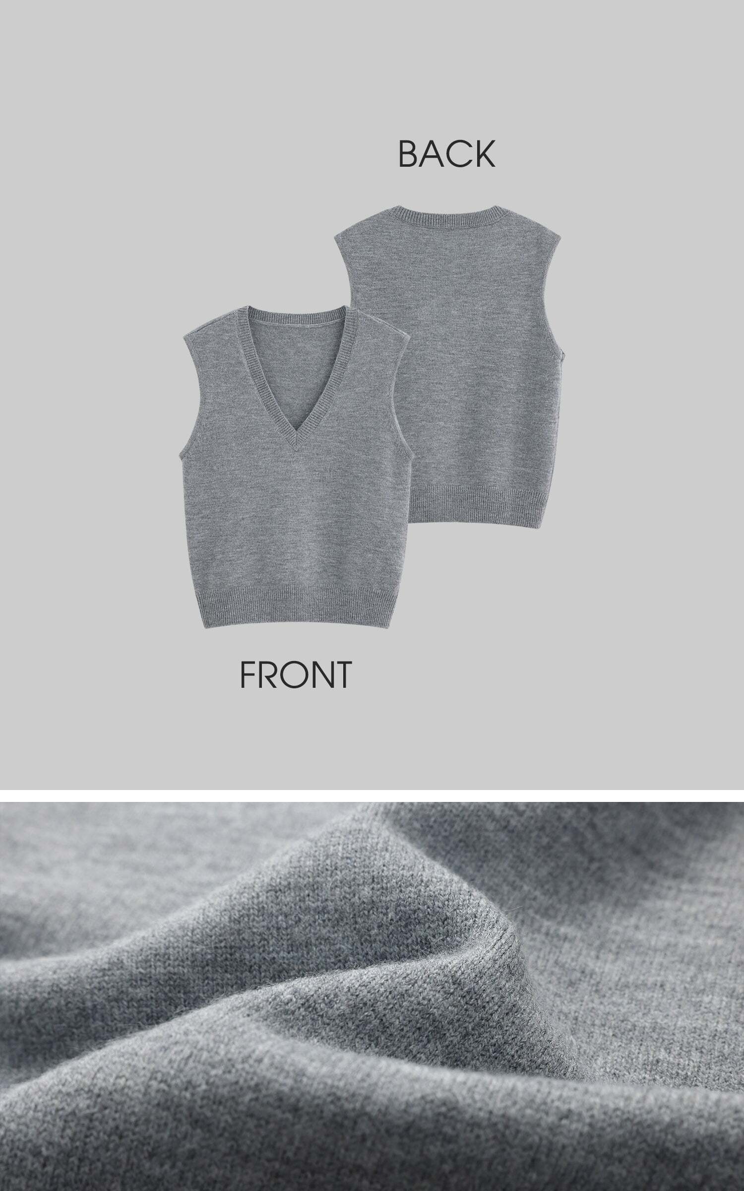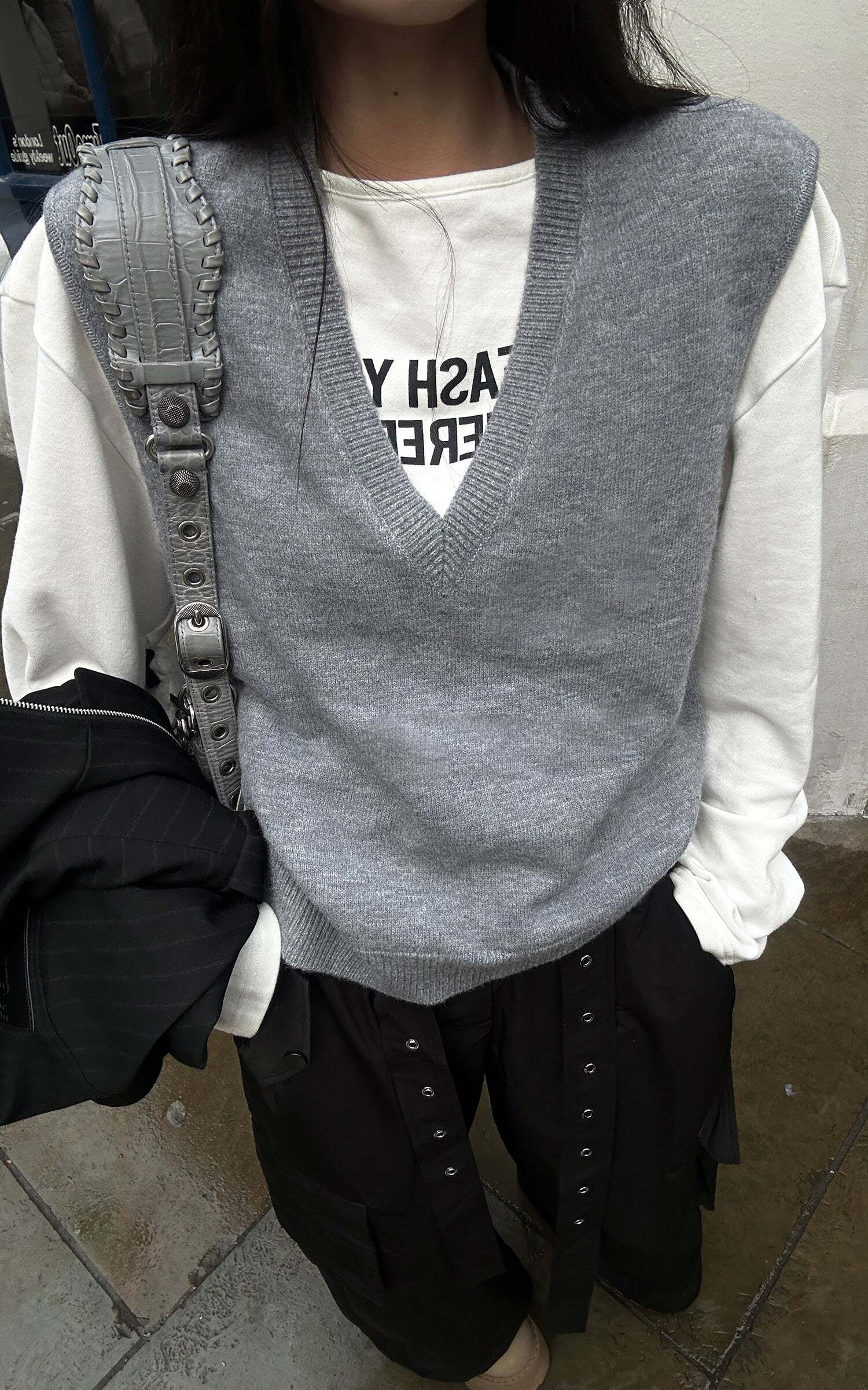 The grey knit texture builds a layered aesthetic, with a deep V-neckline that softens its structured presence, crafting a silhouette that is both stark and effortless. The sleeveless cut offers endless layering possibilities—pair it with an oversized shirt or a relaxed long-sleeve top to achieve a look that balances freedom and restraint. Ribbed hem subtly refines the loose silhouette, adding a quiet yet assertive tension to the garment. Designed for those who navigate between nonchalance and a cool, understated sensibility in their daily style.