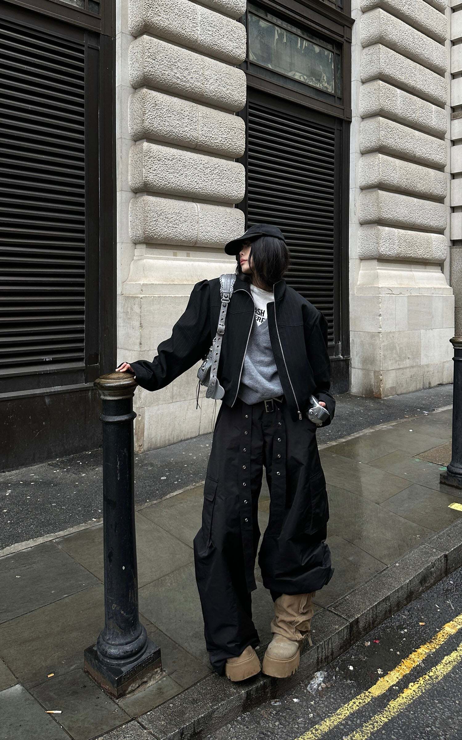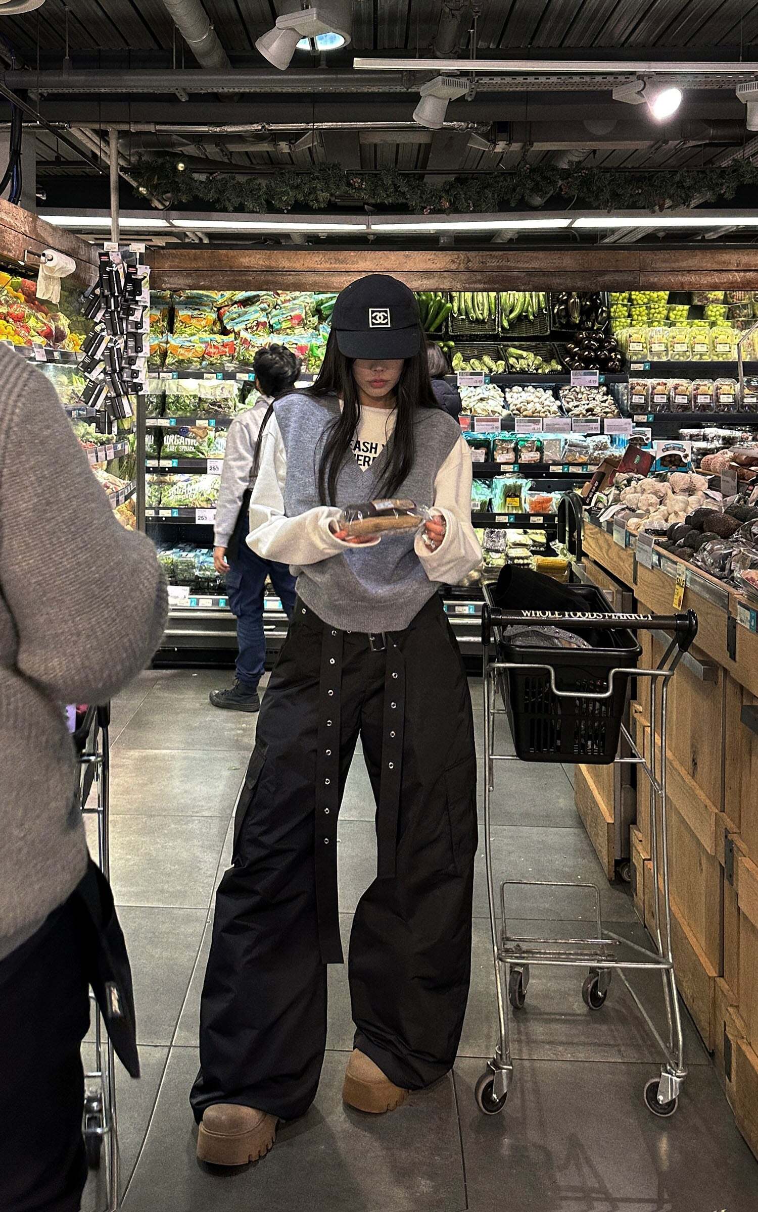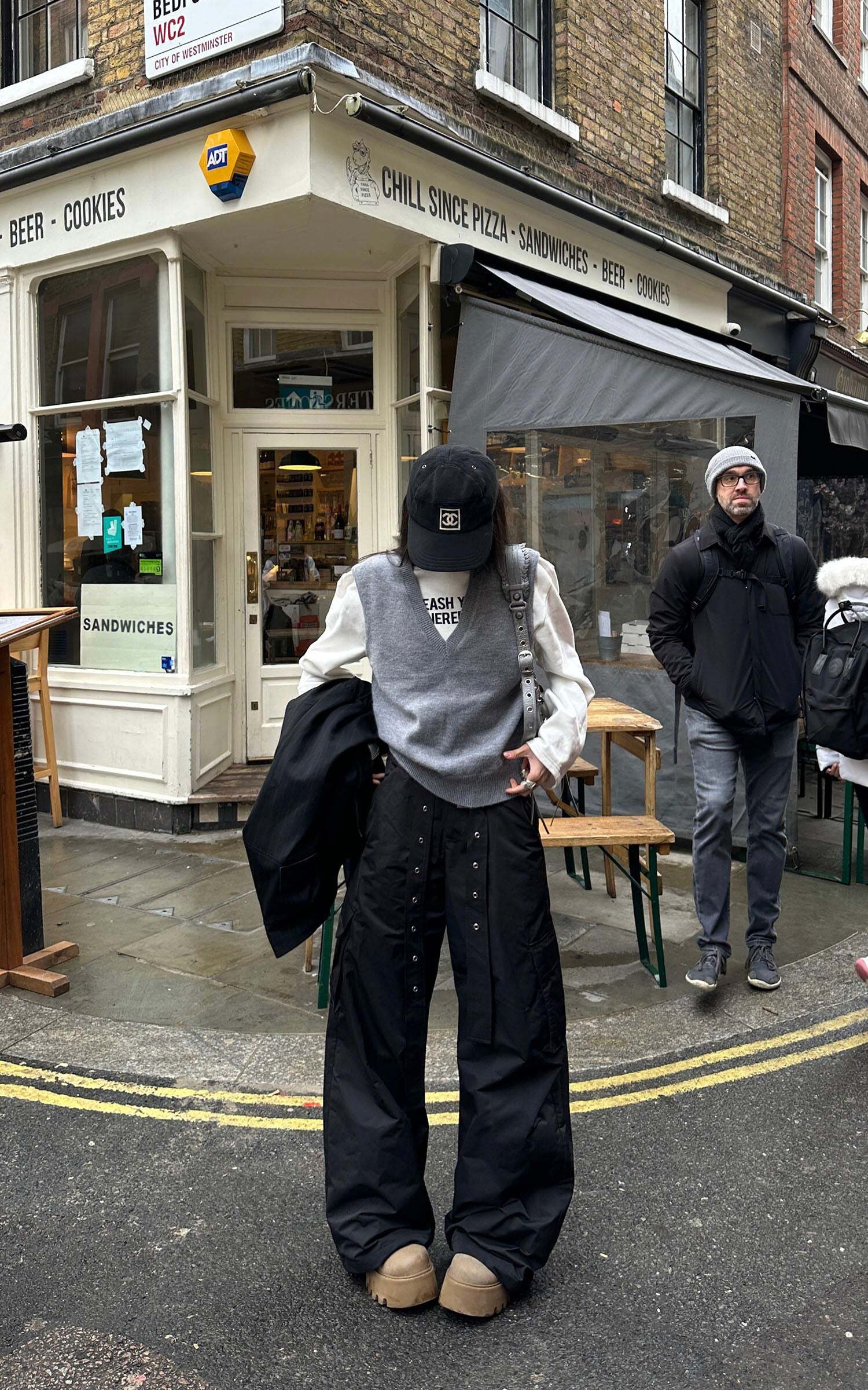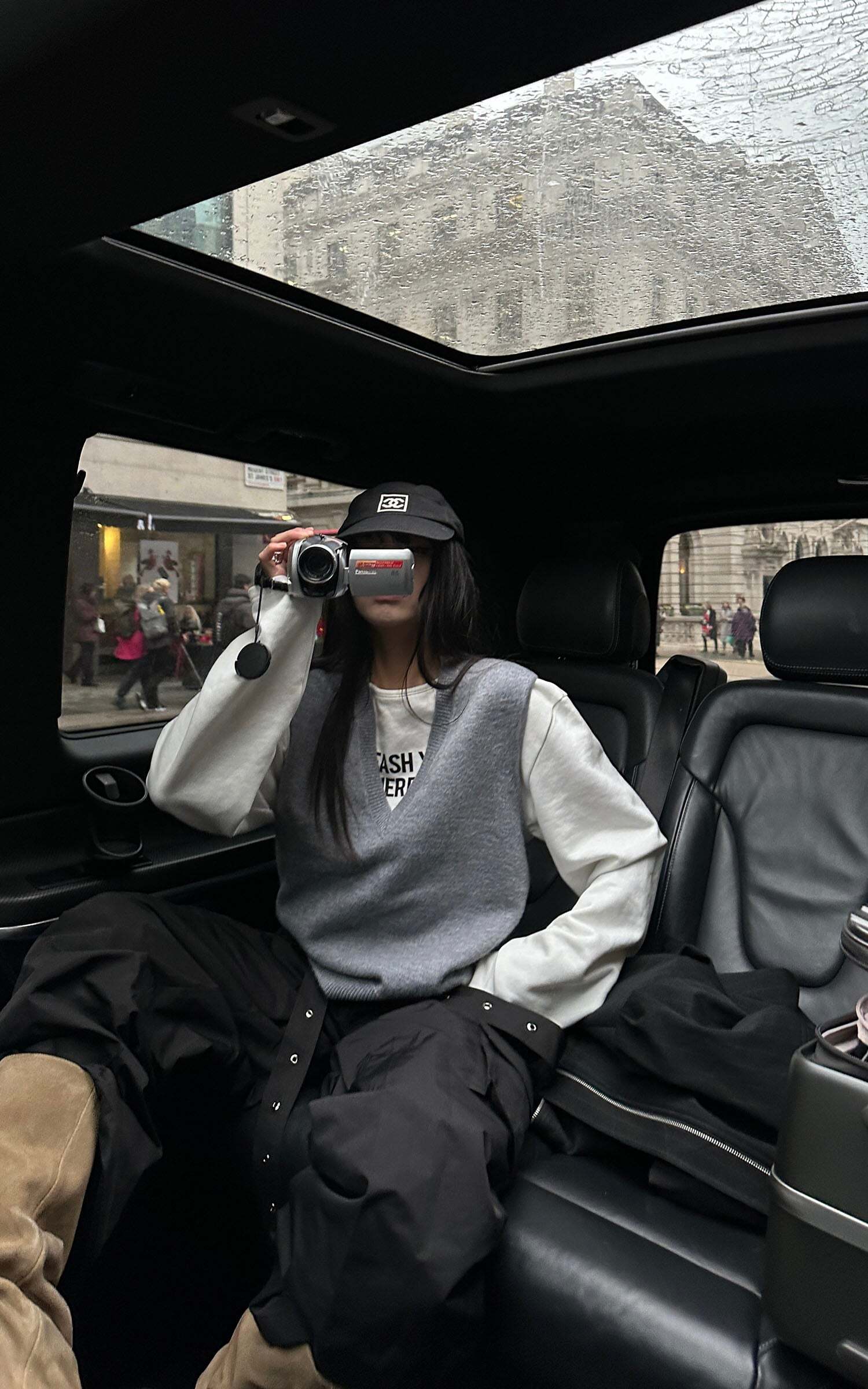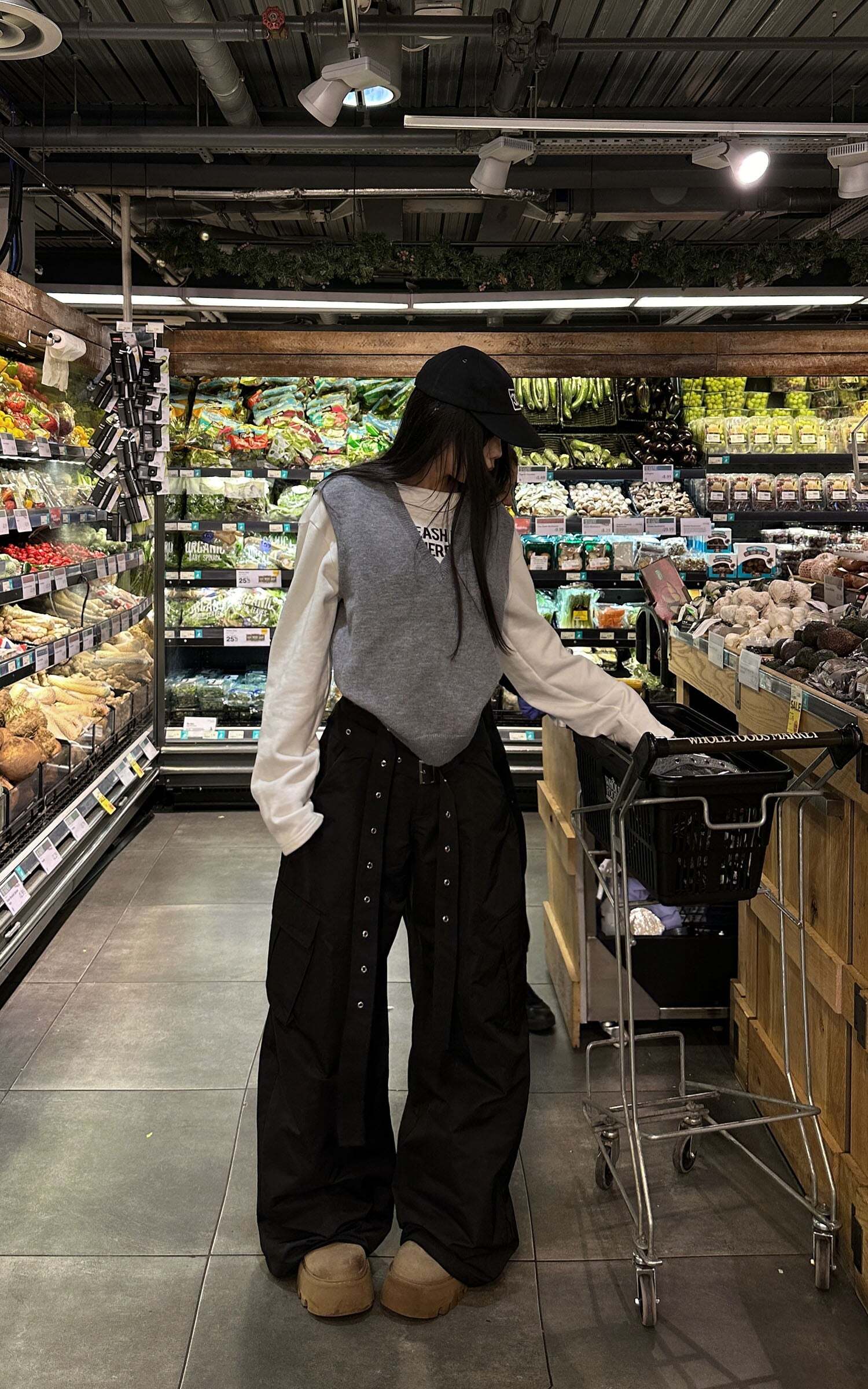 The grey knit texture builds a layered aesthetic, with a deep V-neckline that softens its structured presence, crafting a silhouette that is both stark and effortless. The sleeveless cut offers endless layering possibilities—pair it with an oversized shirt or a relaxed long-sleeve top to achieve a look that balances freedom and restraint. Ribbed hem subtly refines the loose silhouette, adding a quiet yet assertive tension to the garment. Designed for those who navigate between nonchalance and a cool, understated sensibility in their daily style.