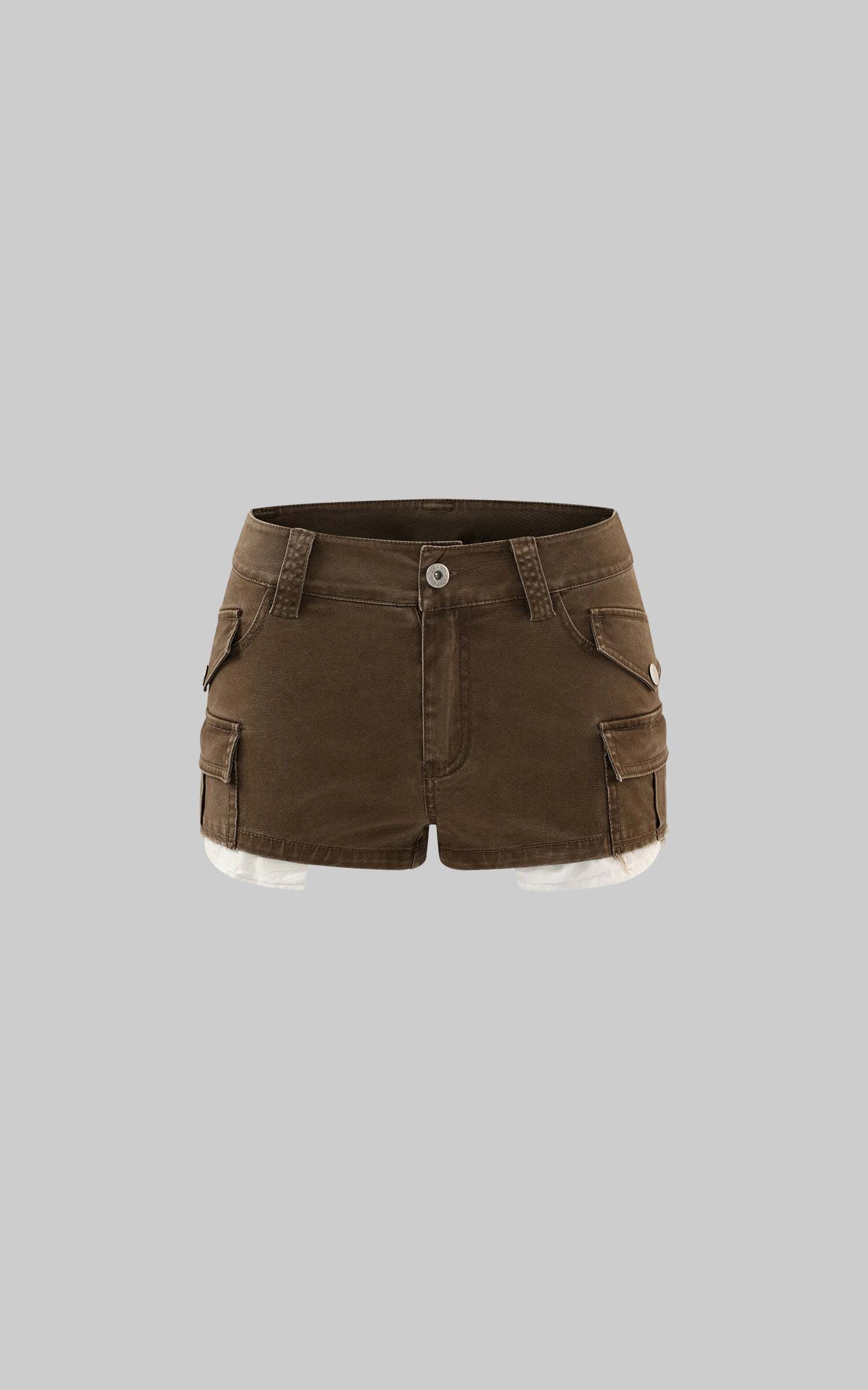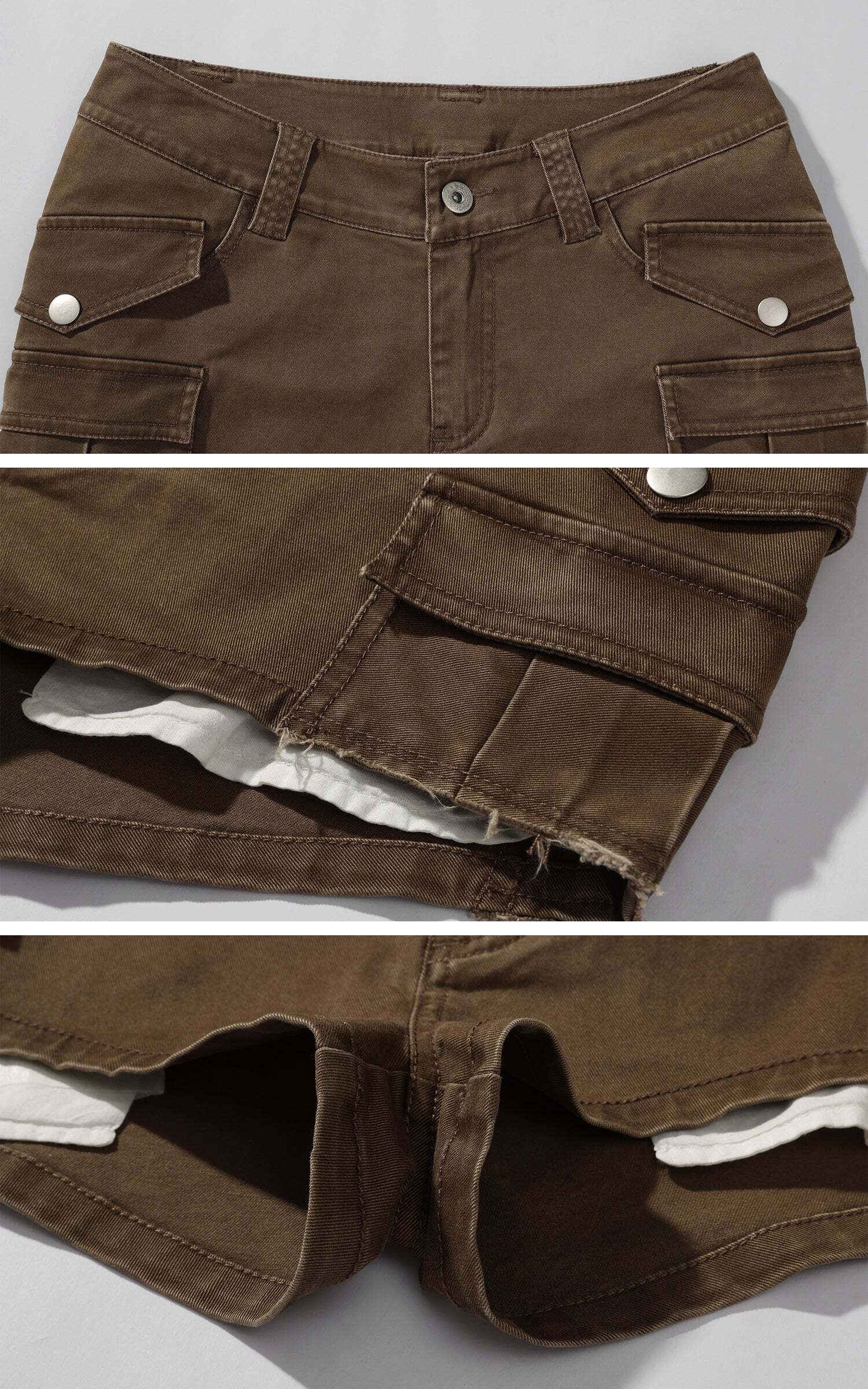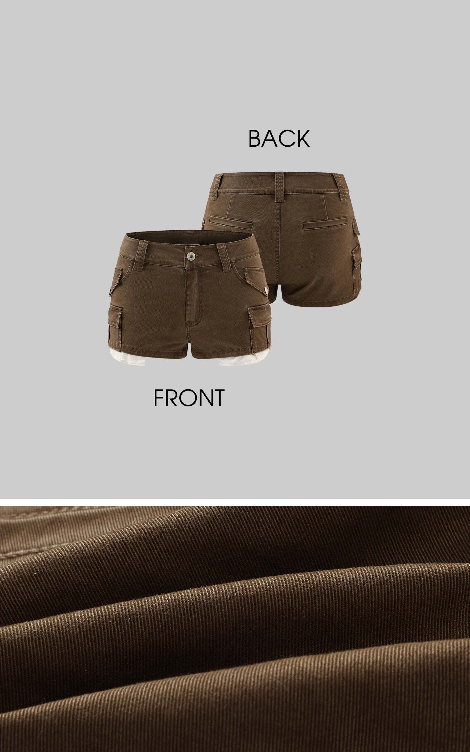 A structured low-rise fit meets utilitarian edge in these washed cargo shorts. Featuring double flap pockets, contrast inner lining, and a raw-cut hem, this piece adds depth and movement to every step. The silhouette clings and releases in all the right places—layer it with oversized knits or sheer tops to contrast its compact structure. Built for city heat, styled for open roads.