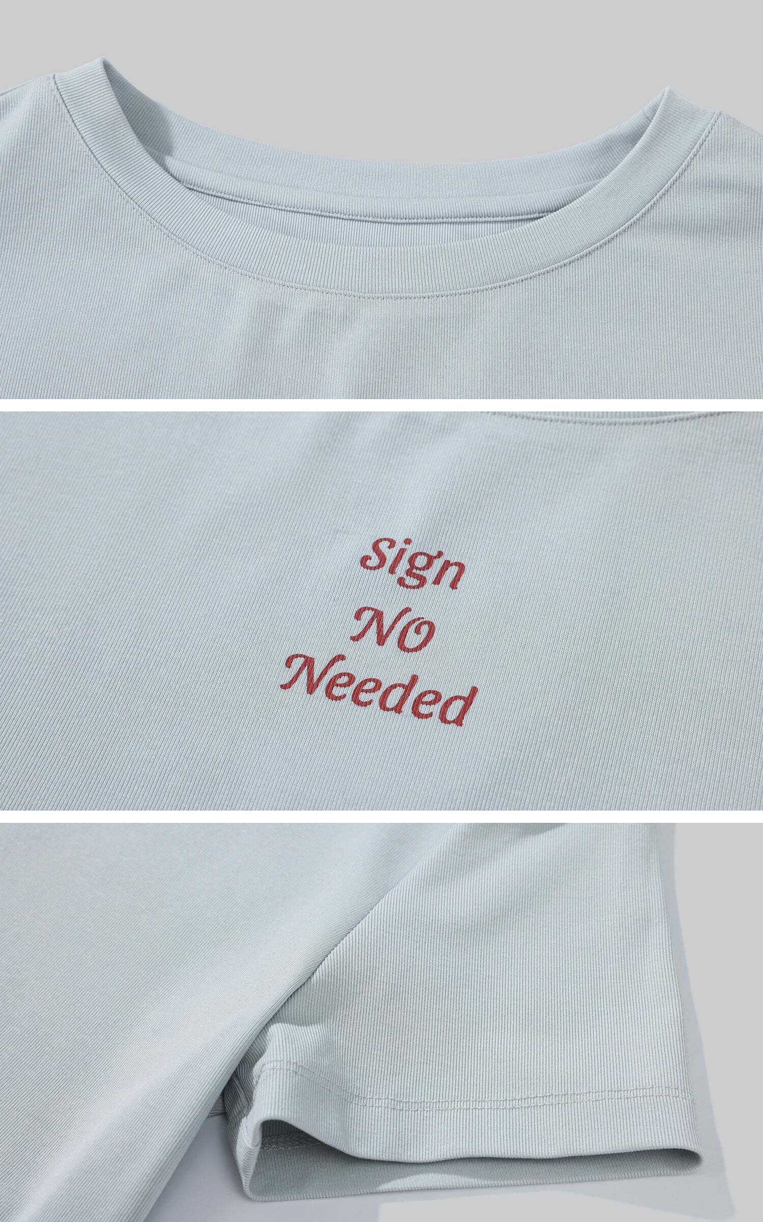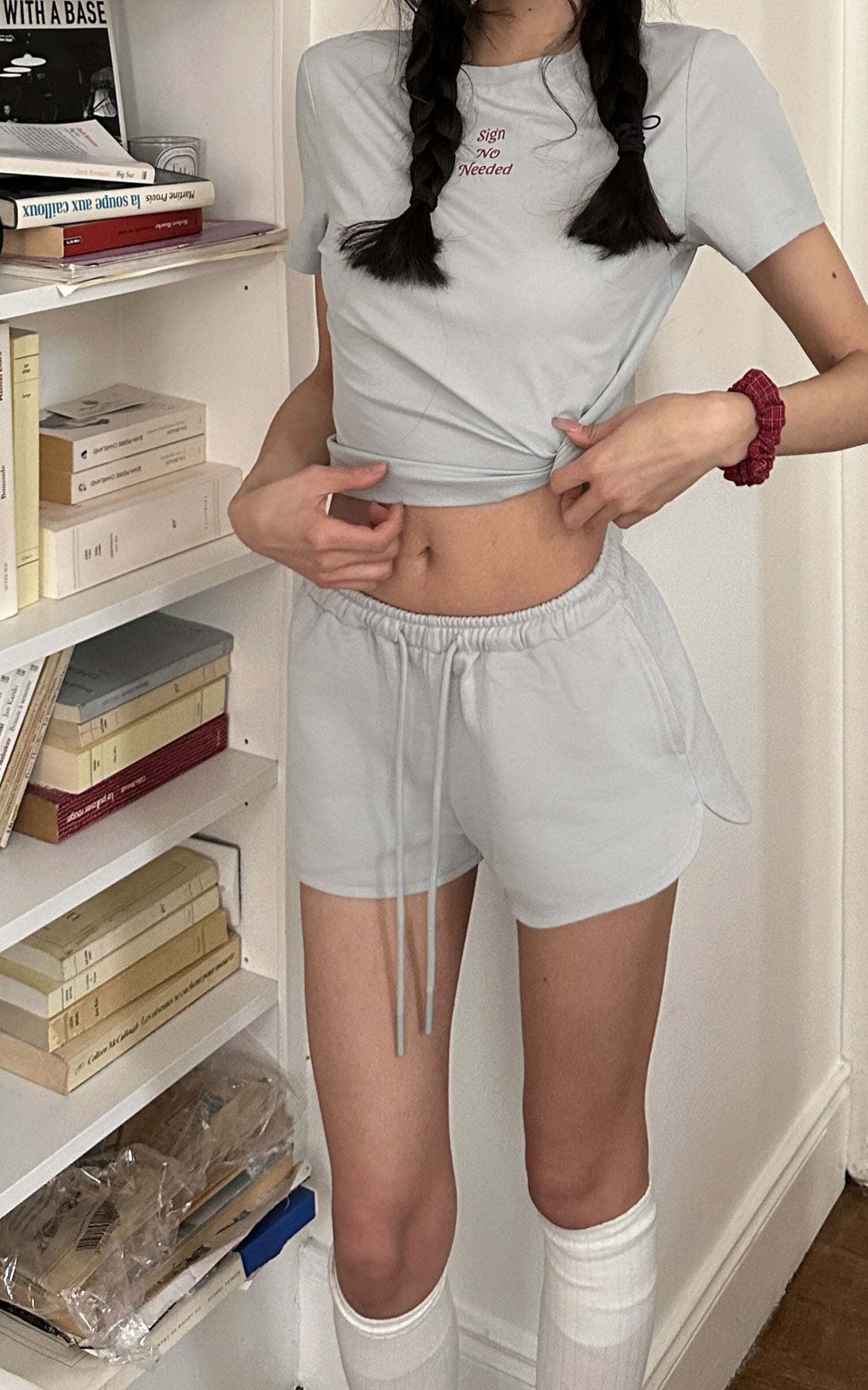 The “SIGN NO NEEDED” tee and shorts set speaks in understatement, with a tight rib-knit texture and minimal silhouette that hugs and moves. The cropped tee is marked only by a red-lettered refusal across the chest. The shorts come with an elasticated waistband and subtle curved hems, nodding to retro gym gear through a post-streetwear lens. Wear it like armor for your off-duty hours — calm, capable, and unsigned.
