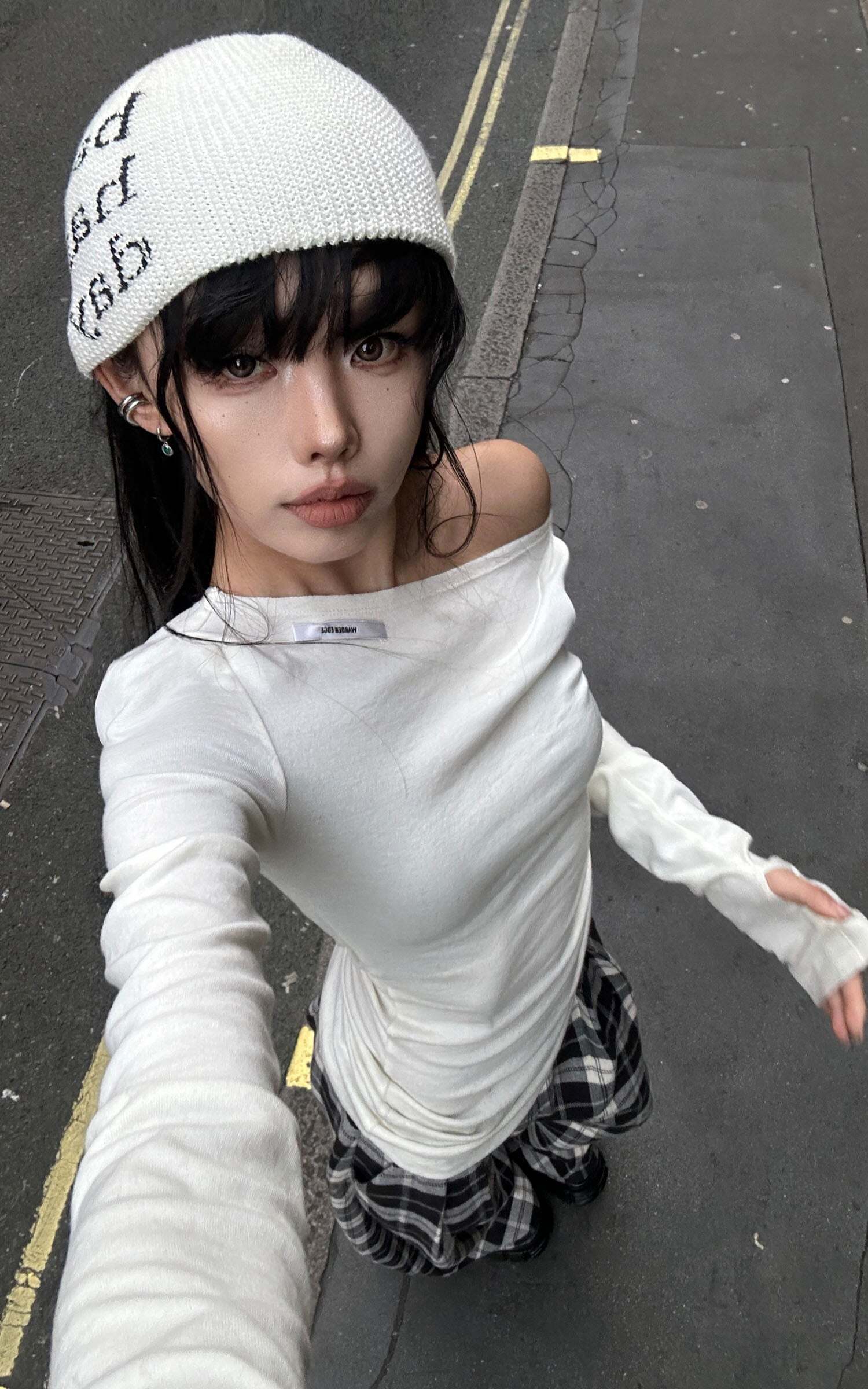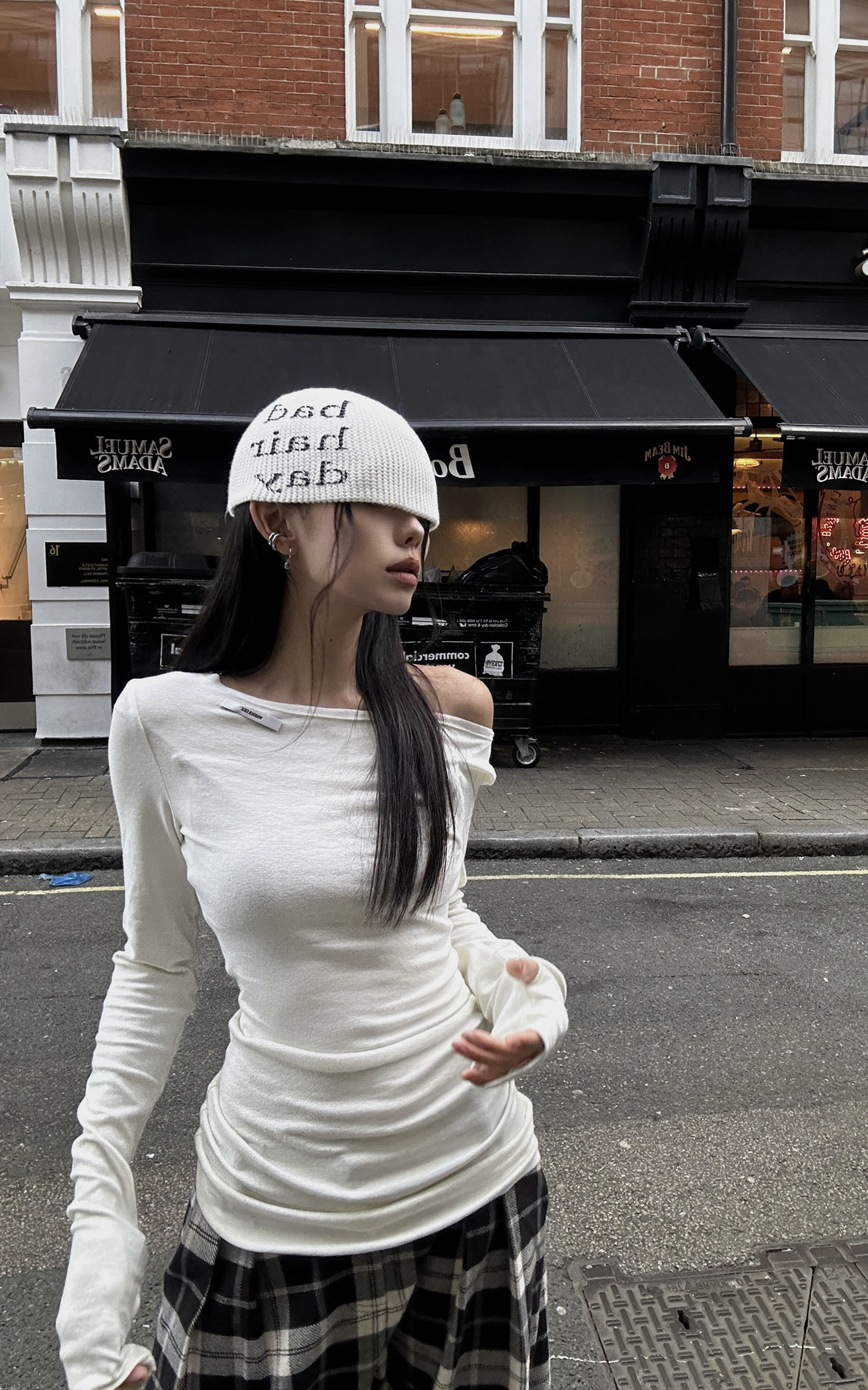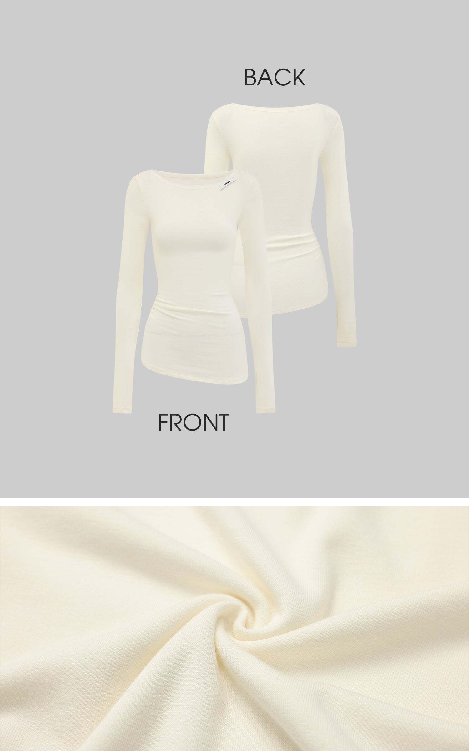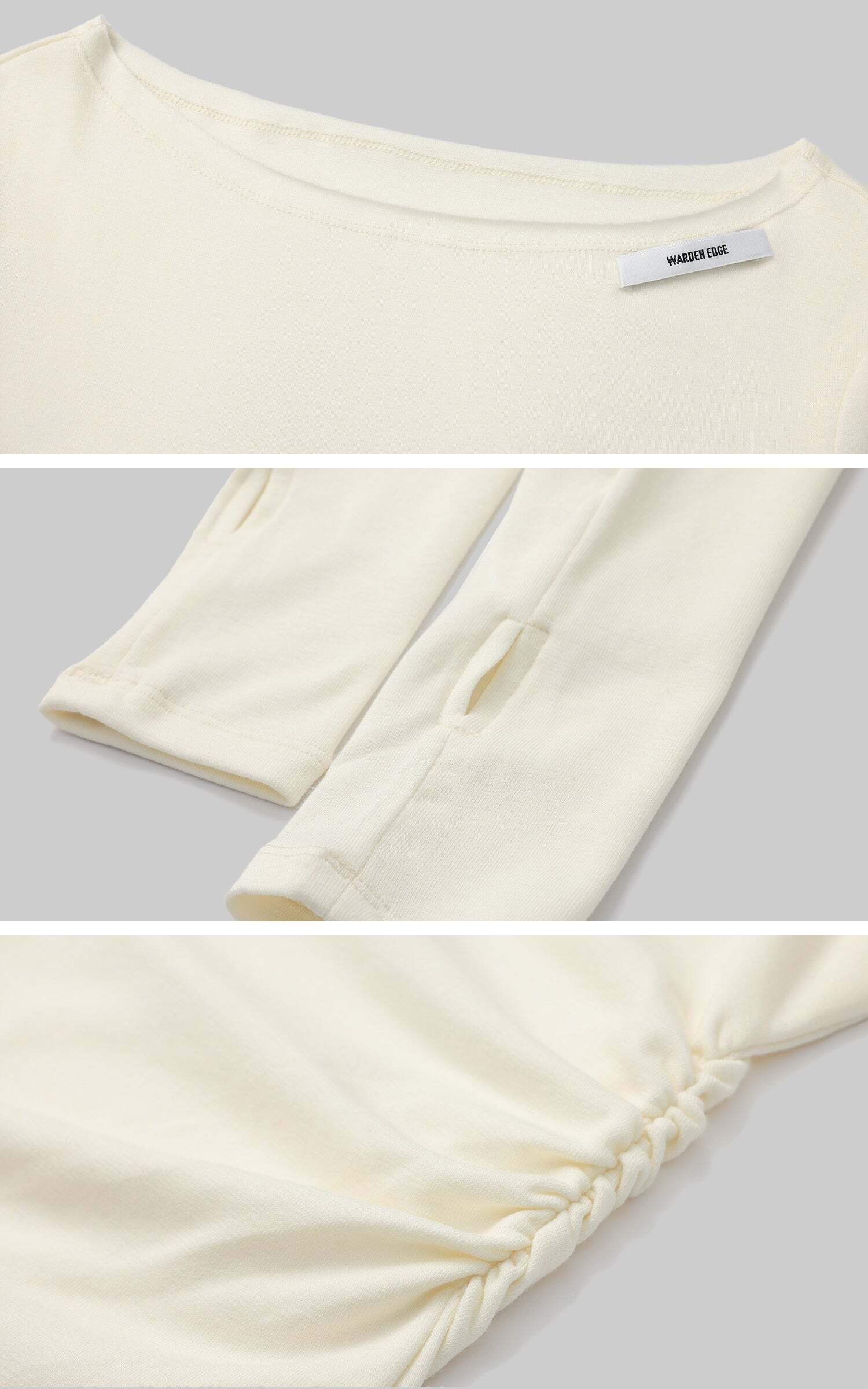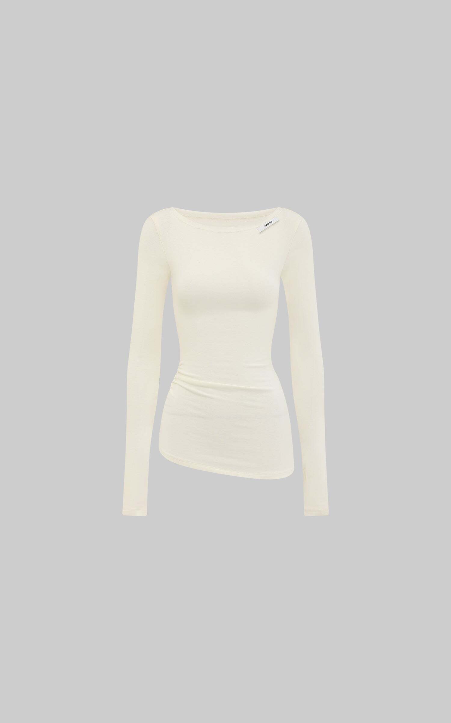 Minimalism meets sophistication with this off-shoulder long-sleeve tee. Crafted from a ribbed fabric blend, it offers a fitted silhouette that emphasizes form without compromising on comfort. The unique shoulder cut brings an effortless, asymmetrical elegance, while subtle ruching at the waist flatters the figure. Designed with thumbhole sleeves, this piece merges utility with edge, perfect for layering or as a statement on its own.