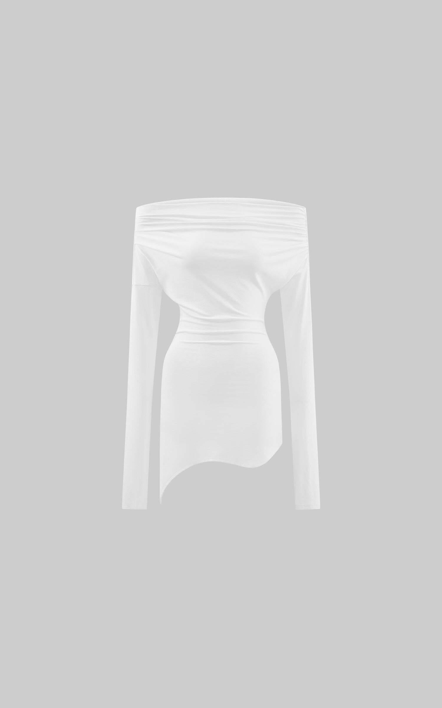 A deconstructed take on the classic long-sleeve. Cut in a slim silhouette with off-shoulder drape, ruched detailing and an asymmetric hem. Made from soft stretch cotton for comfort and edge. Easy to layer, this piece blurs casual and statement with a street-informed attitude.