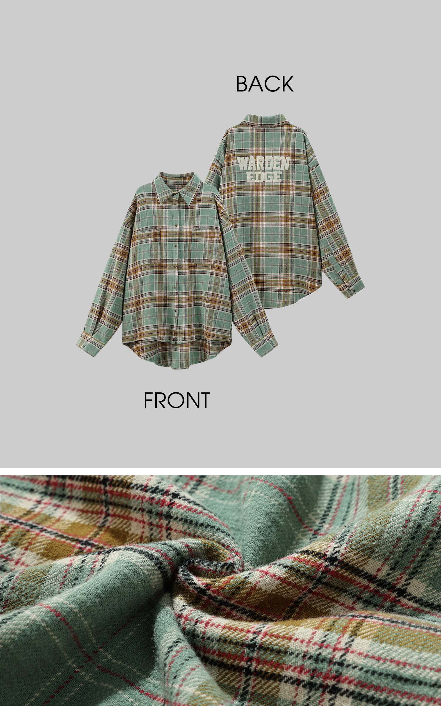 Elevate your streetwear game with this oversized plaid shirt. Designed with a relaxed fit and crafted from premium fabric, it features a classic button-down front, chest pockets, and a slightly curved hem for a laid-back yet structured silhouette. The earthy tones and distressed details give it a vintage vibe, while the bold letter patch at the back adds a modern edge. Wear it open over a tank or layer it under a jacket for effortless versatility.