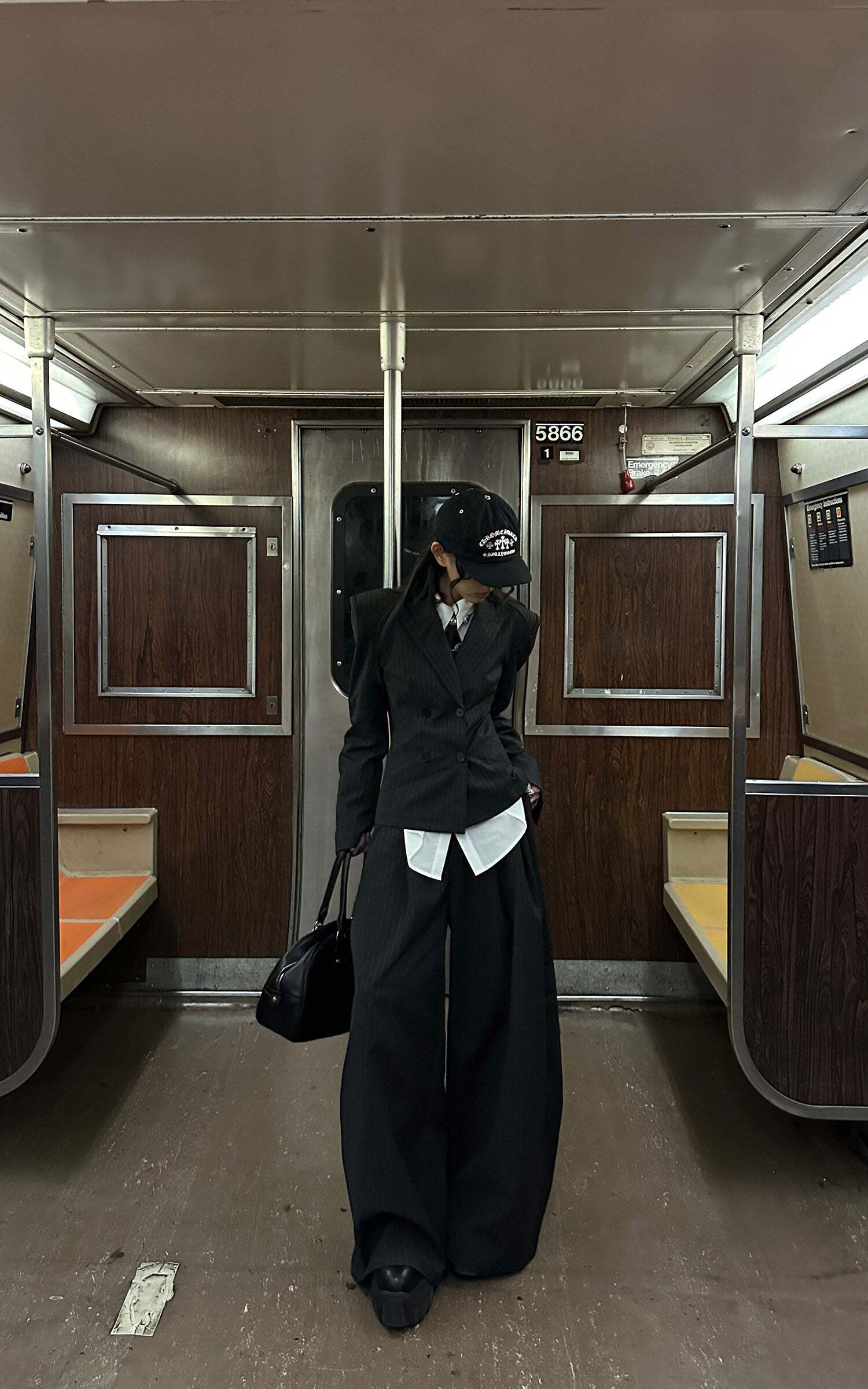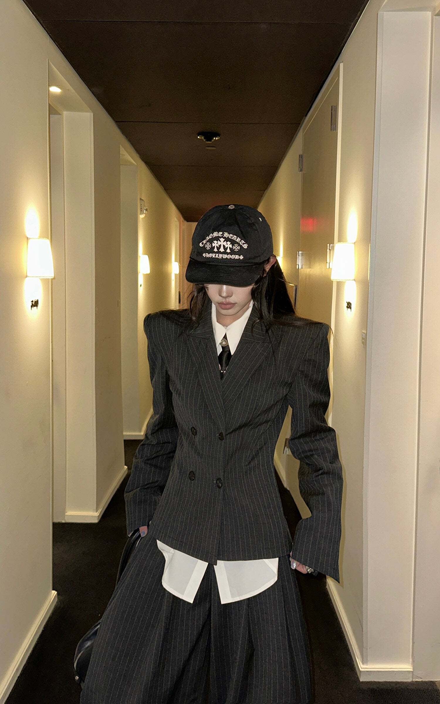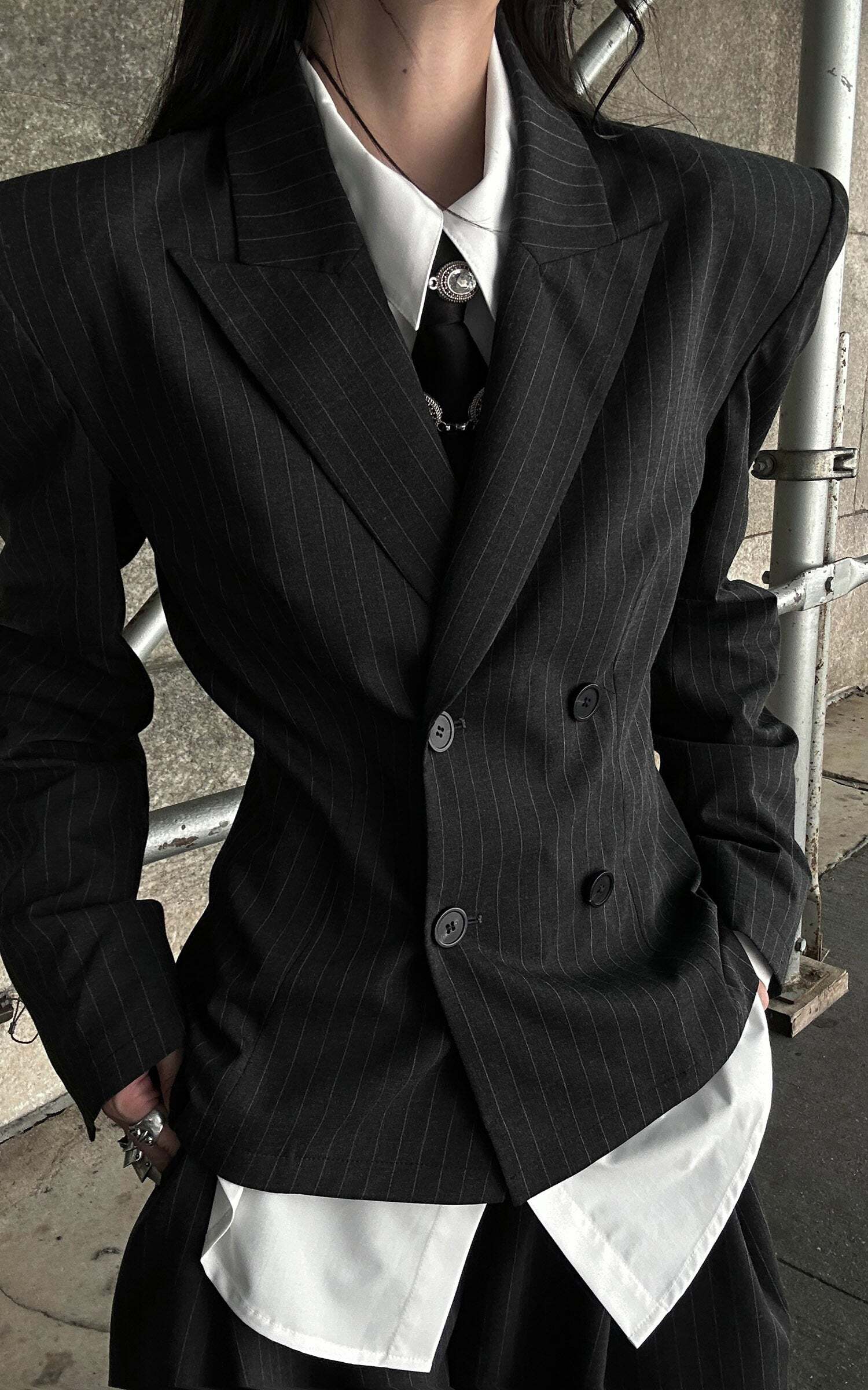 A sharp reinterpretation of tailoring—this three-piece set merges classic pinstripes with modern edge. The fitted double-breasted blazer sculpts the silhouette, paired with exaggerated wide-leg trousers that break traditional formality. Layered over a crisp shirt, the look moves between boardroom power and underground cool. Made with precision cuts and fluid drape, it balances structure and ease for a statement presence.