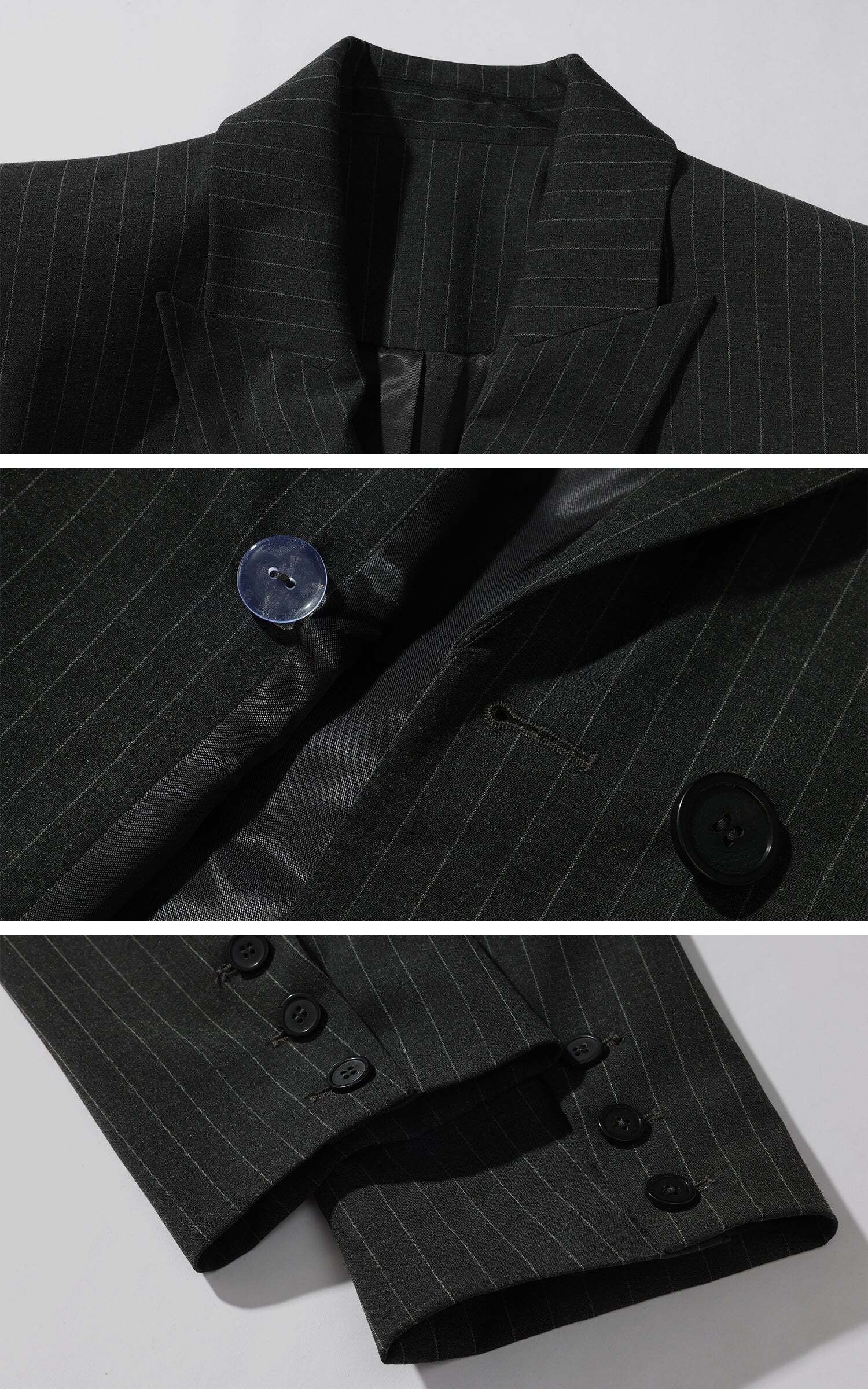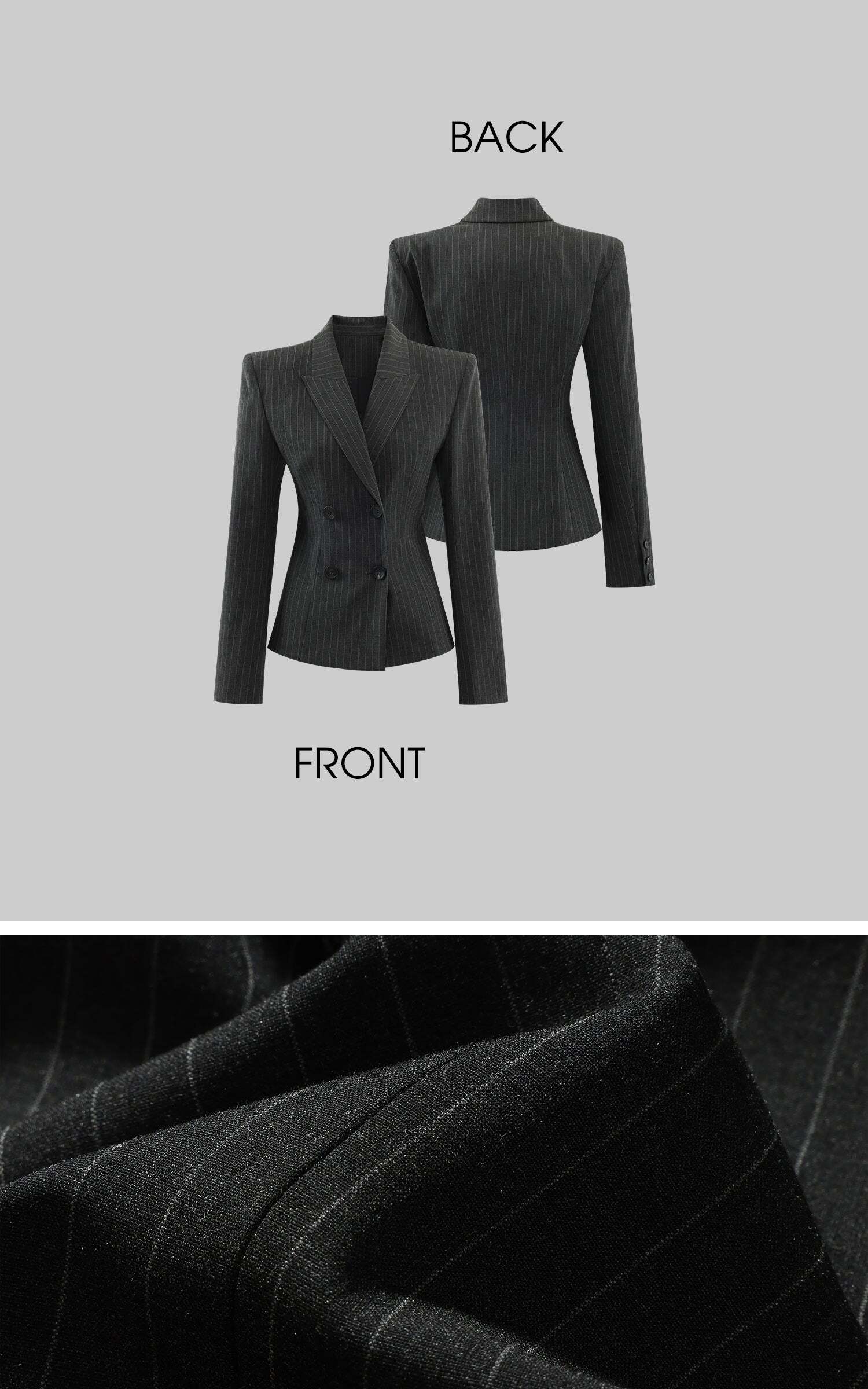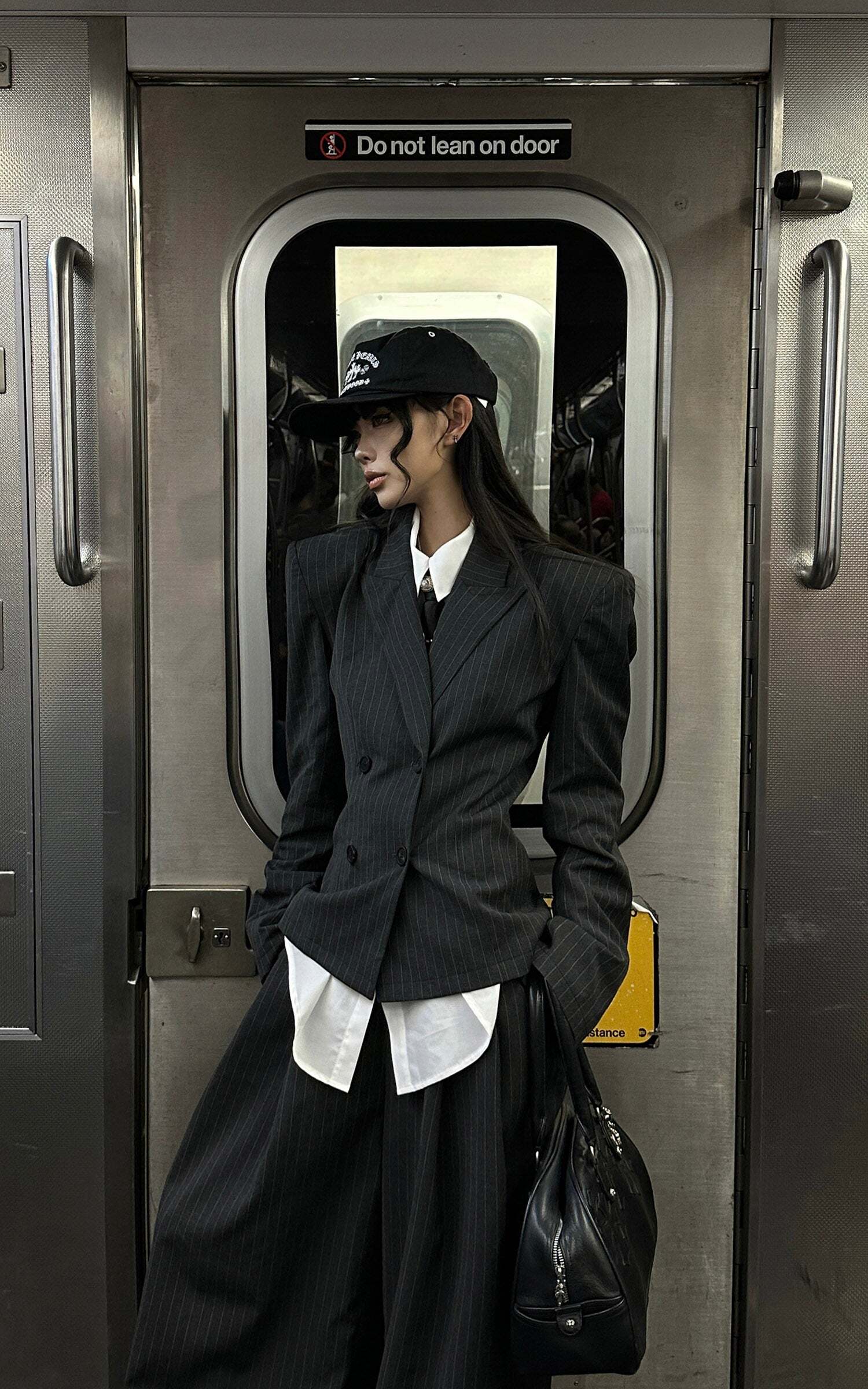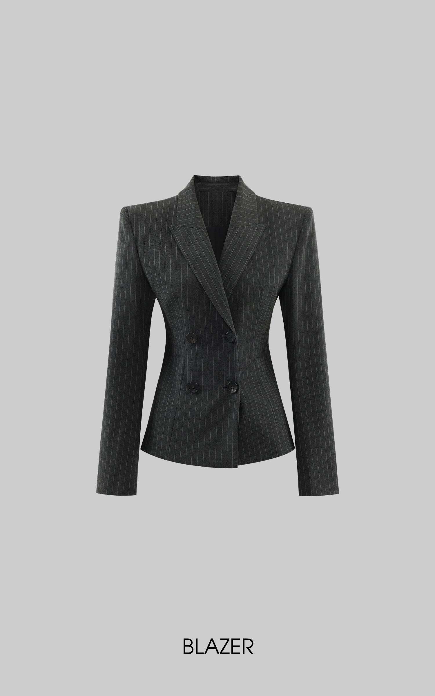 A sharp reinterpretation of tailoring—this three-piece set merges classic pinstripes with modern edge. The fitted double-breasted blazer sculpts the silhouette, paired with exaggerated wide-leg trousers that break traditional formality. Layered over a crisp shirt, the look moves between boardroom power and underground cool. Made with precision cuts and fluid drape, it balances structure and ease for a statement presence.