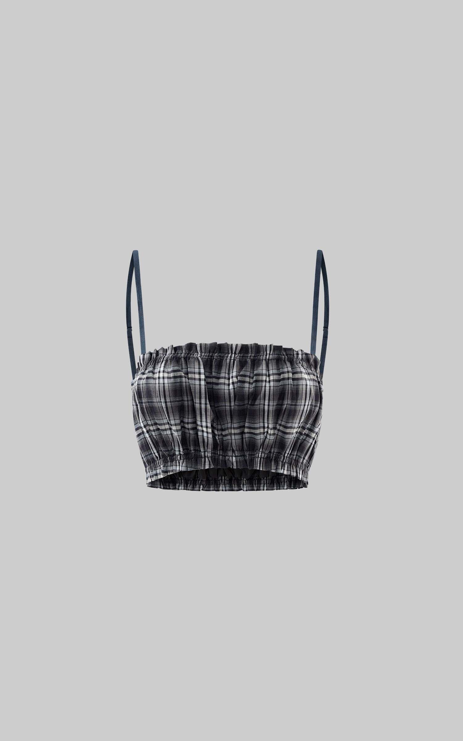 A cropped silhouette cut from textured plaid cotton, designed with ruched elastic gathering that molds to the body. The lightweight straps add minimal edge, while the raw plaid finish carries an effortless, street-driven energy. Layer it with oversized shirting or pair with distressed denim shorts for a bold, urban attitude.