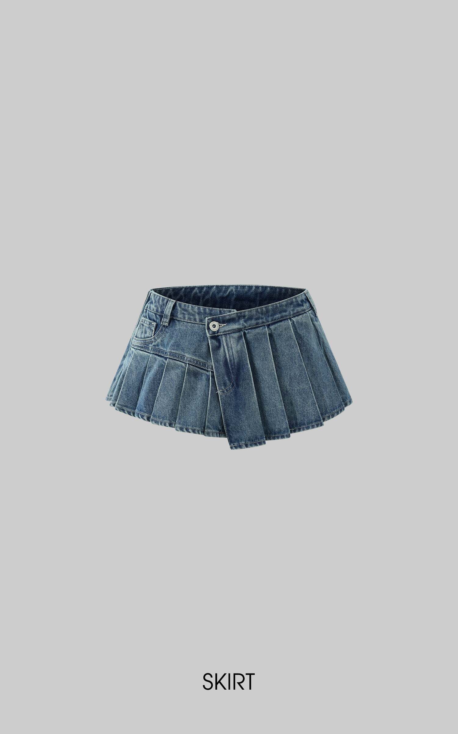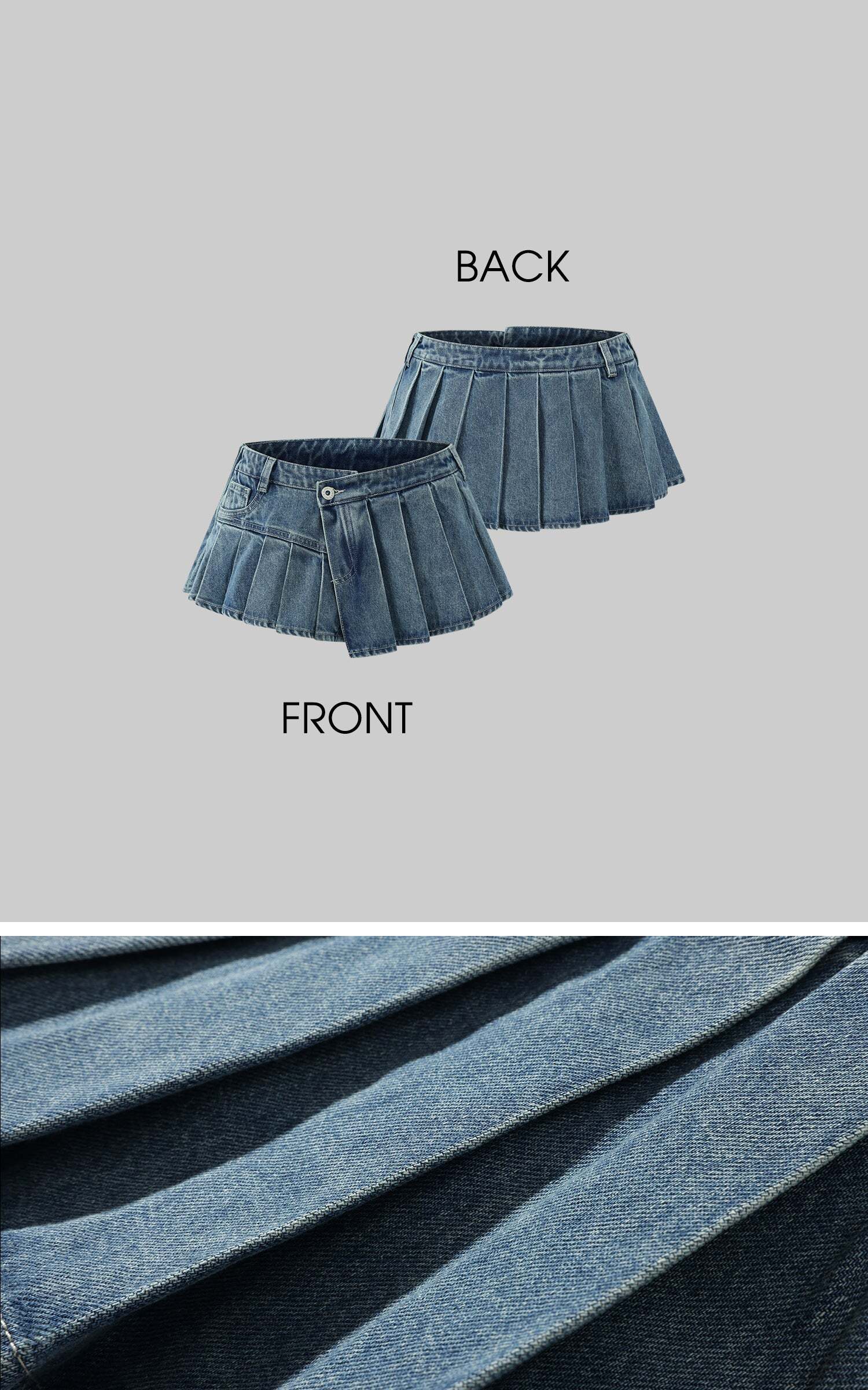 A raw-cut reimagination of the classic schoolgirl skirt, this ultra mini piece redefines proportions with bold irreverence. Crafted from washed denim with sharp knife pleats throughout, it features an asymmetric mock fly detail and integrated built-in shorts for function beneath form. The low-rise waist is punctuated with traditional belt loops and a contrast metal shank button, keeping the edge grounded in utilitarian roots. Style it with a tank, heavy boots, or layered chains to echo the streetscape it was made for.