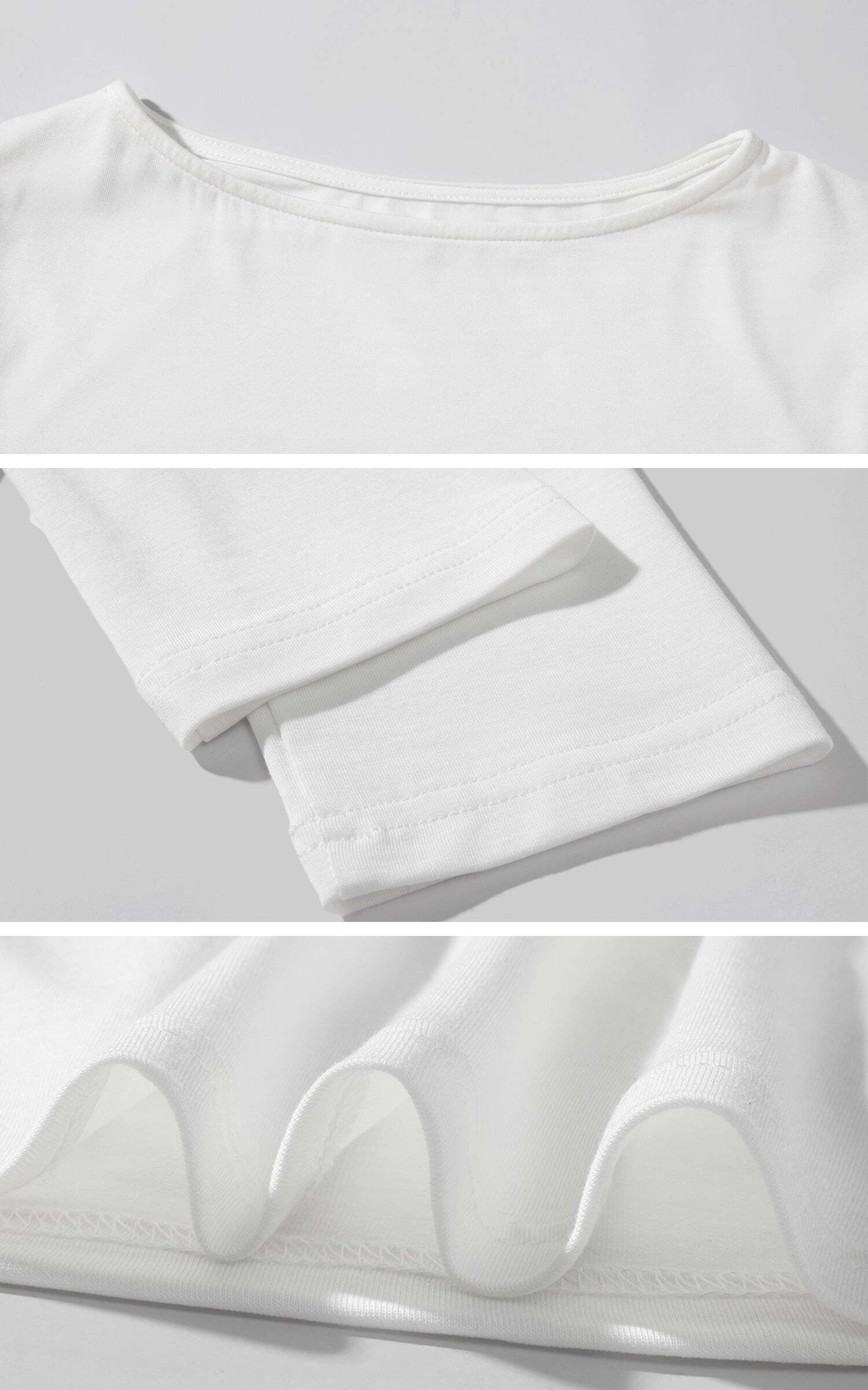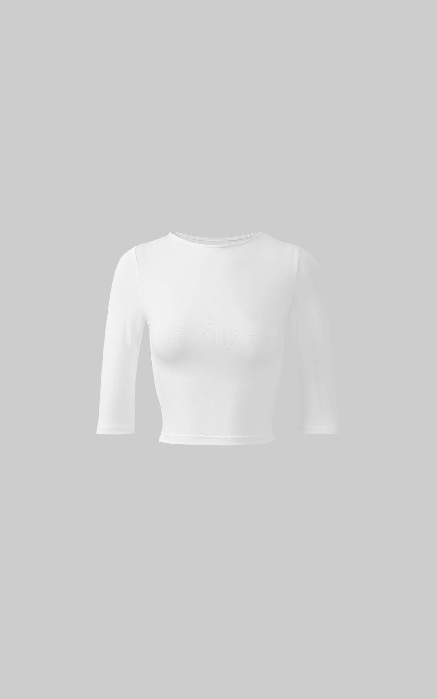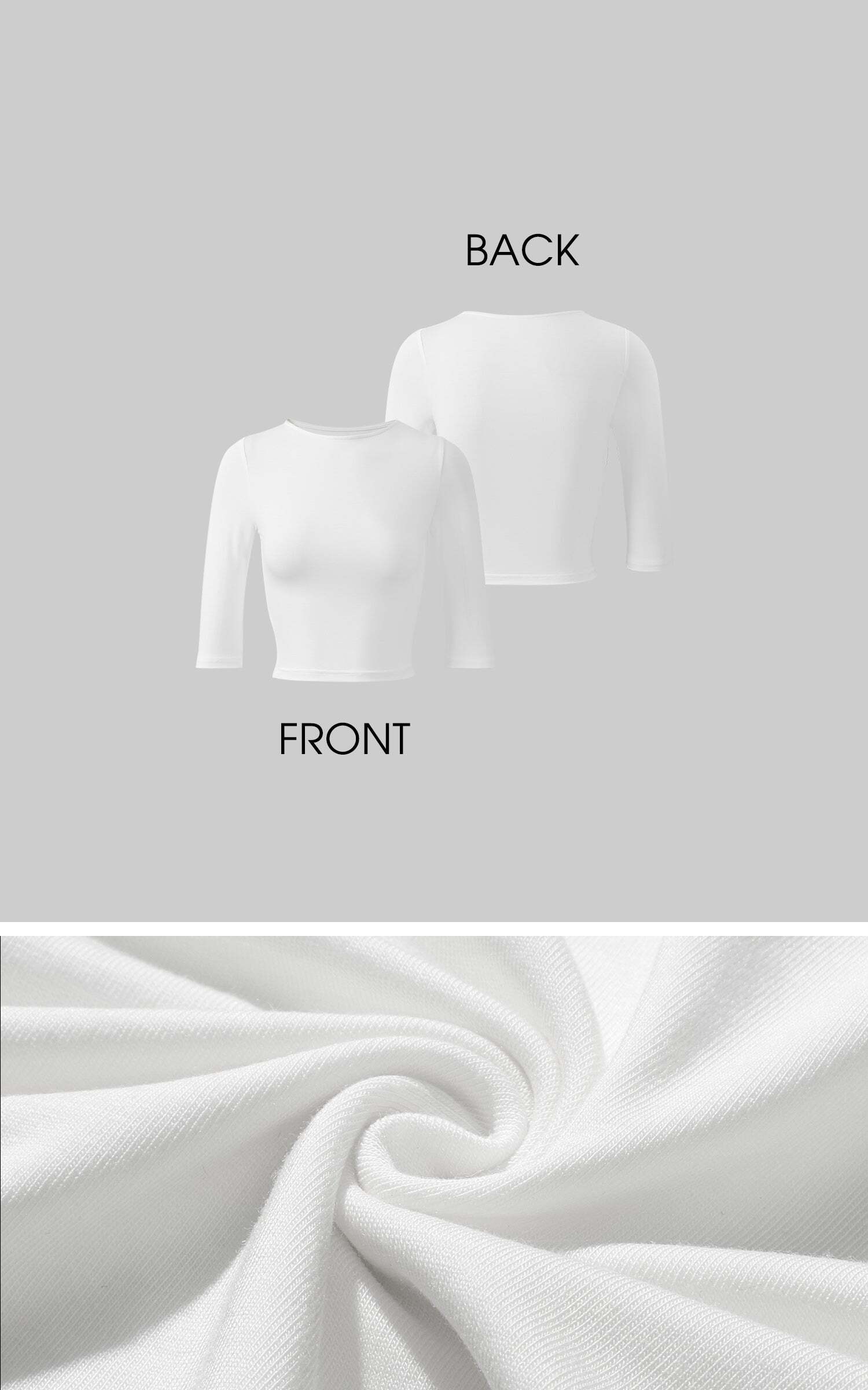 A sleek basic redefined with attitude. This cropped 3/4 sleeve tee is made from a soft, body-hugging stretch knit that molds to your form. Minimal at first glance, it pairs clean lines with quiet confidence—whether layered or worn solo. Designed for off-duty days and late-night detours alike.