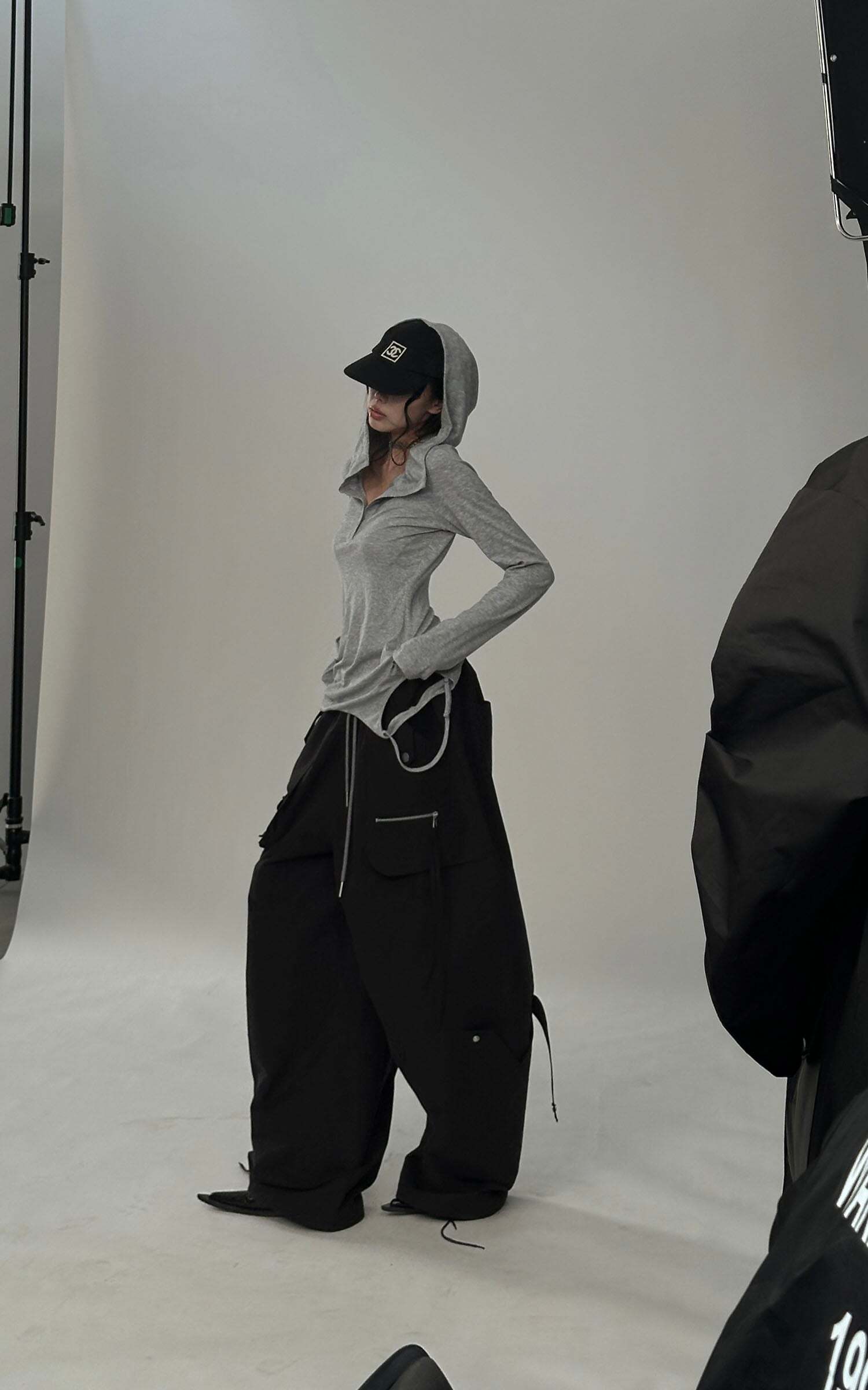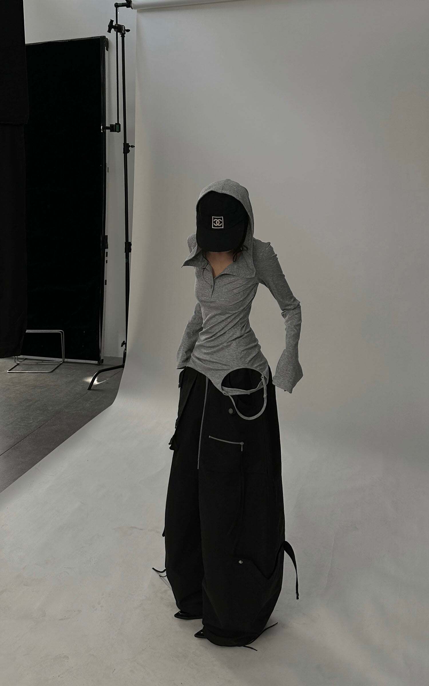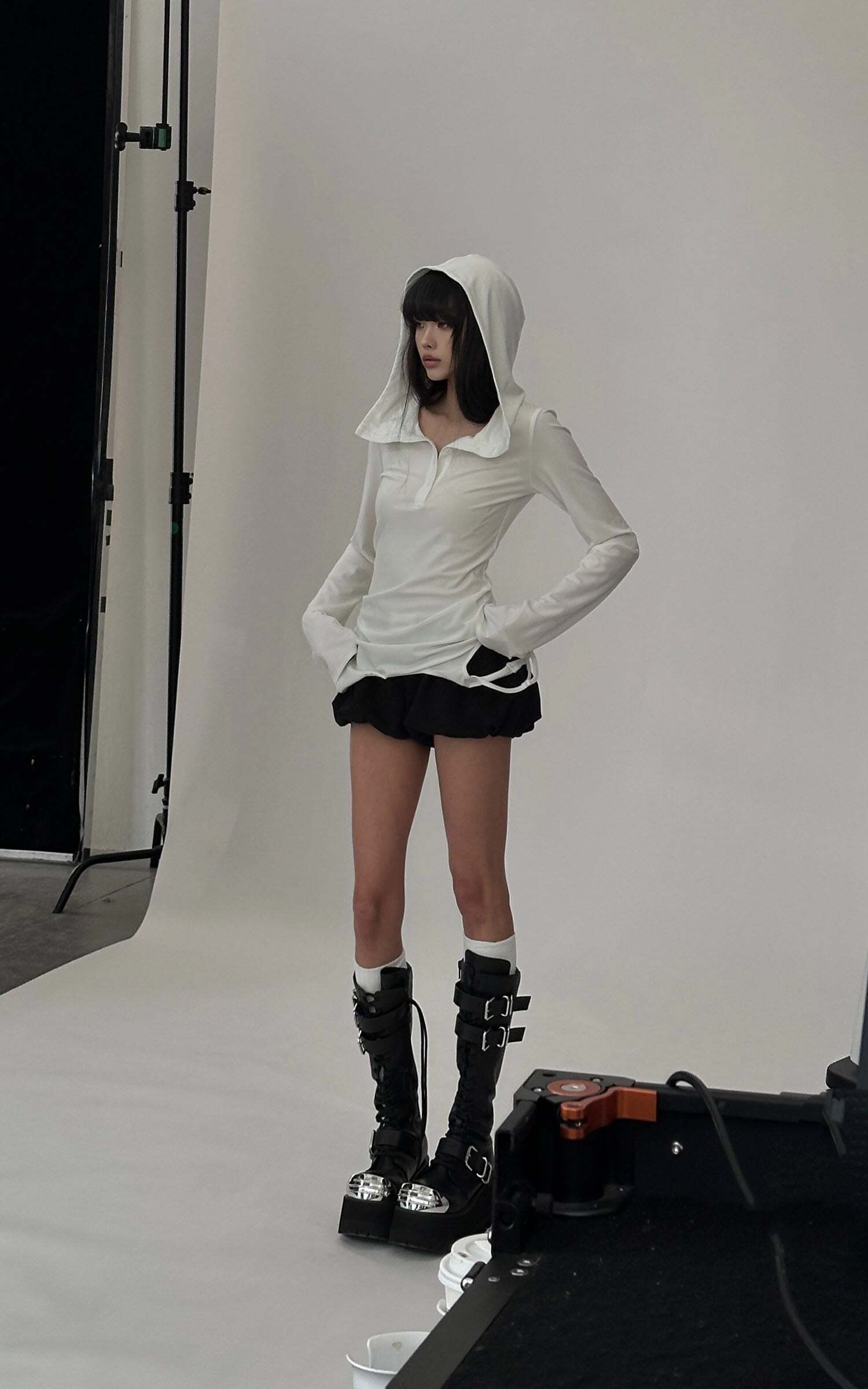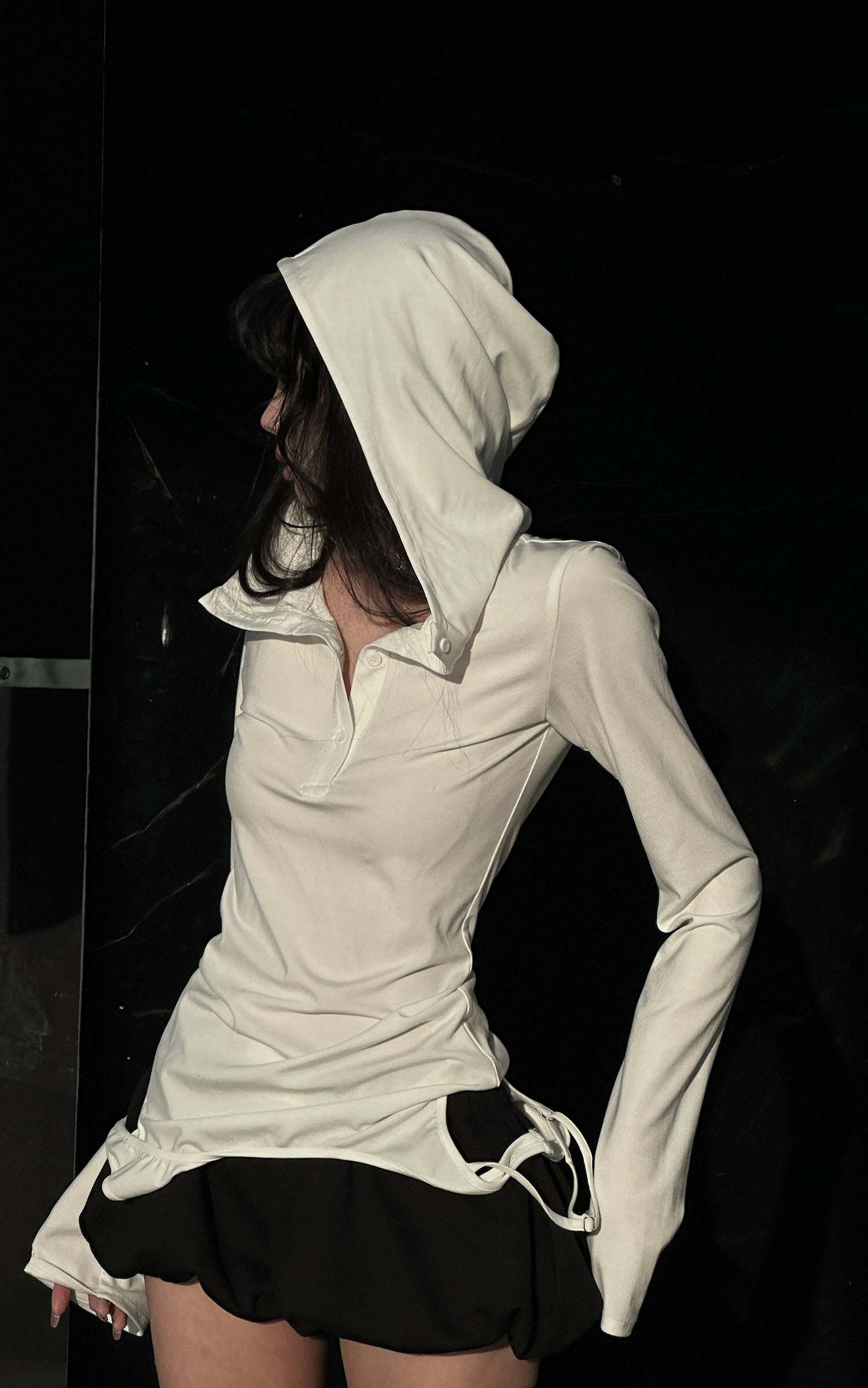 Designed with a sculpted silhouette, this hooded top plays with fluid lines and textural contrast. Elongated cuffs and an asymmetrical hem disrupt conventions, lending an unrestrained, layered dimension to the form. The half-button placket enhances both functionality and visual intrigue, offering a versatile styling element. Soft, body-hugging fabric ensures a refined yet effortless fit. Whether paired with sleek trousers for understated elegance or a structured mini for bold contrast, this piece redefines contemporary minimalism with a rebellious edge.