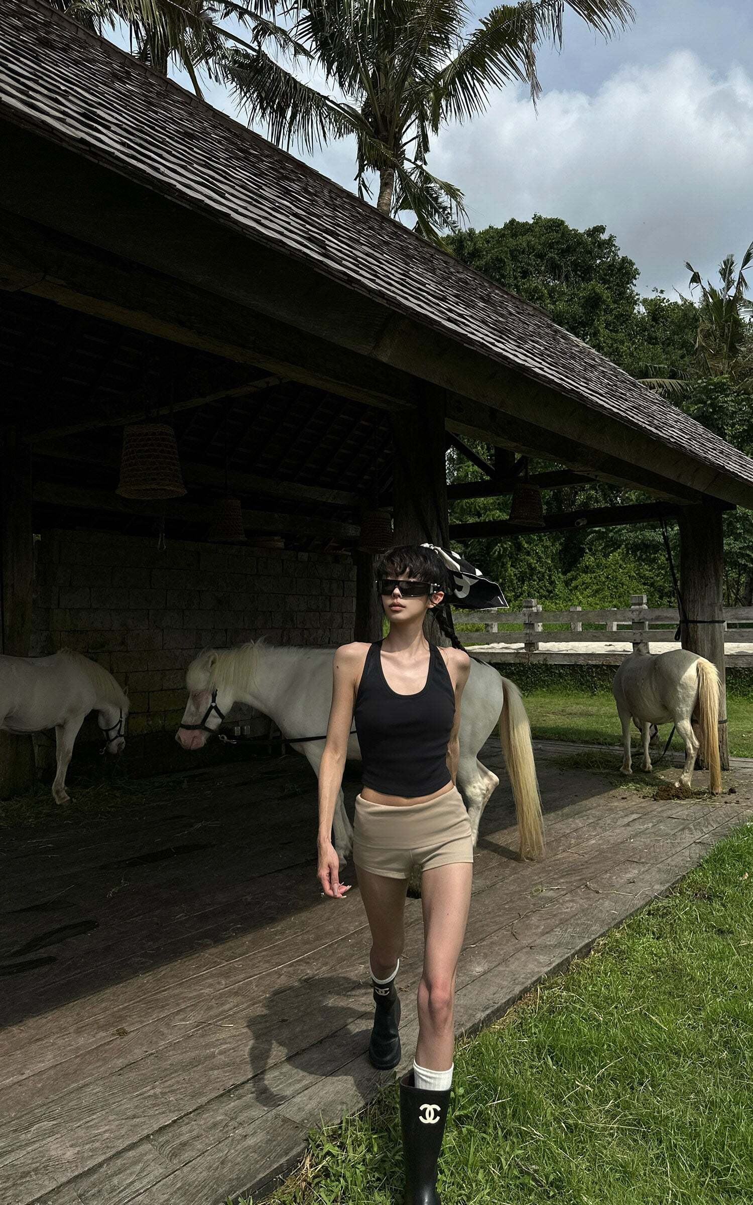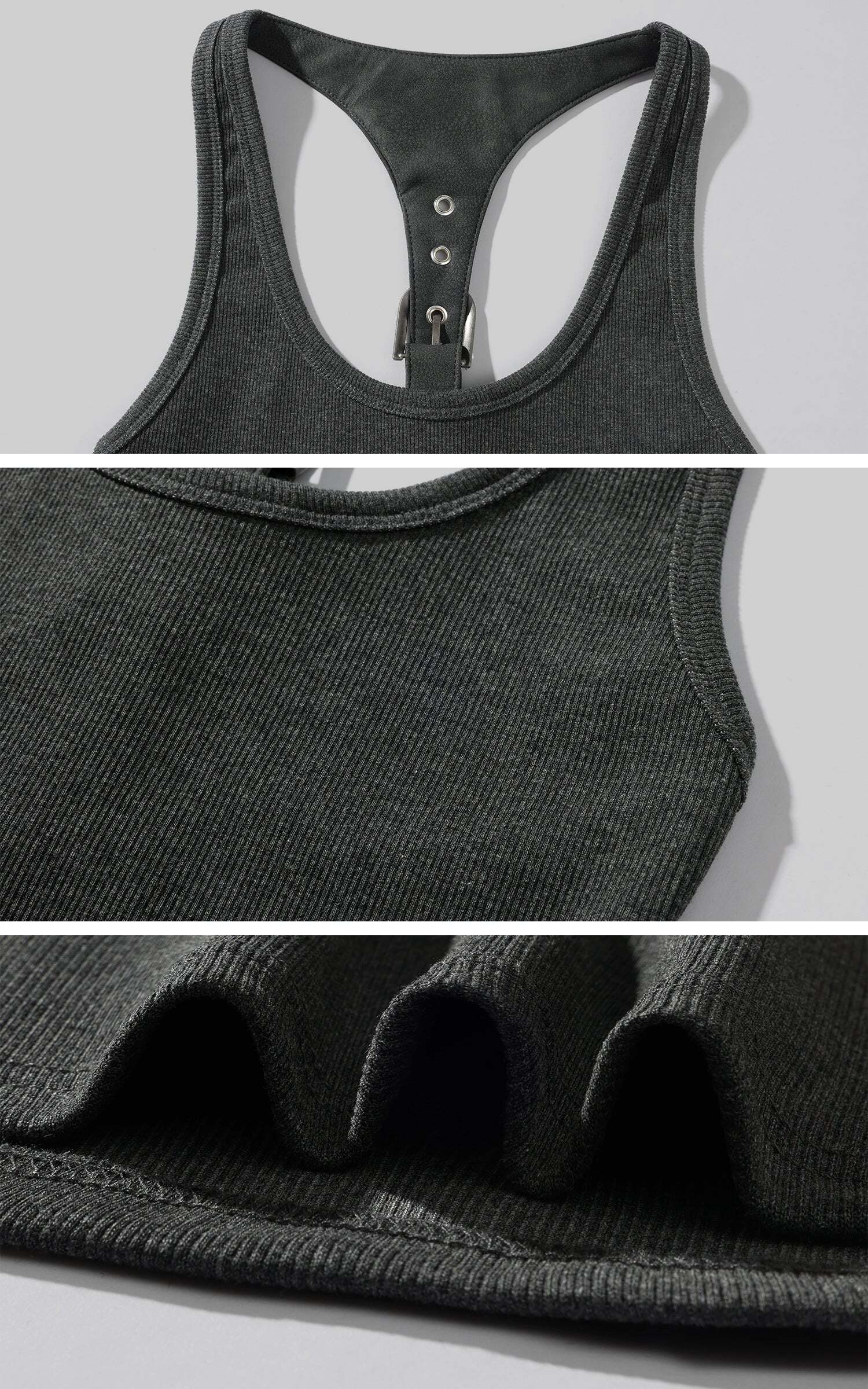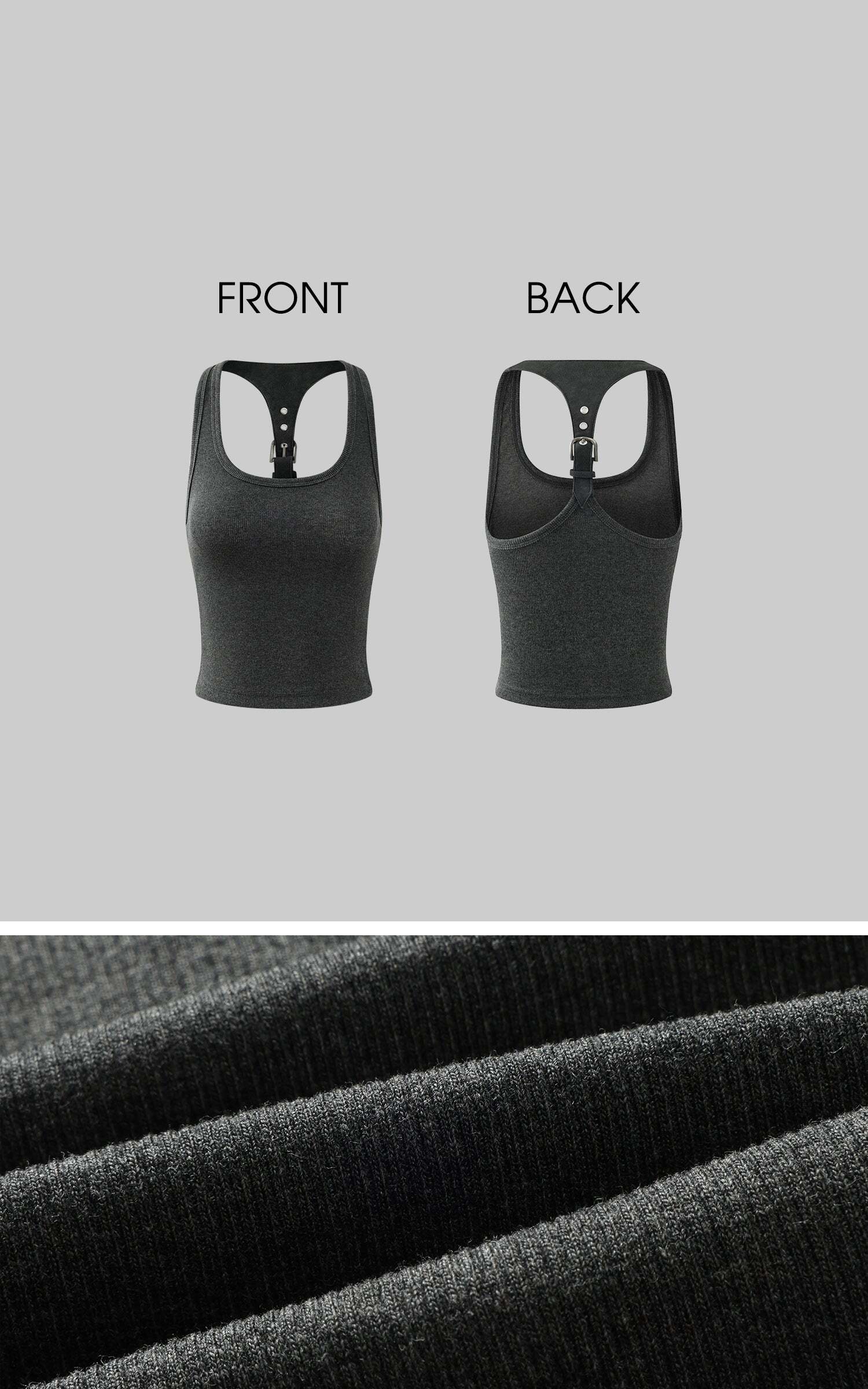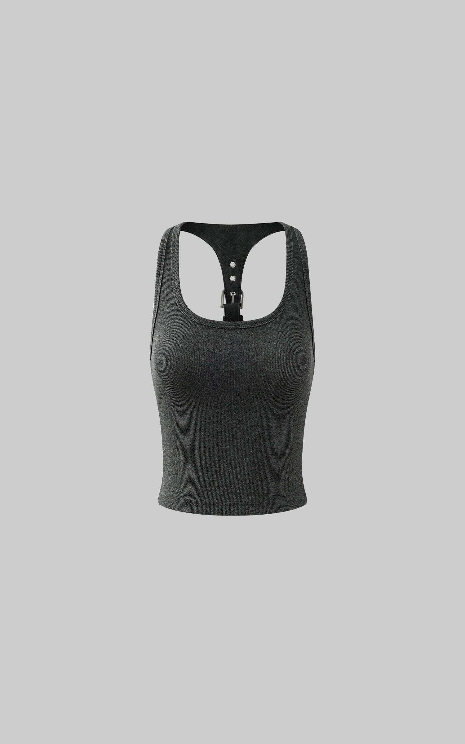 A fitted ribbed tank top cut with precision and built for edge. The cropped silhouette clings to form, while the back features a harness-inspired webbing with snap and buckle hardware—merging utilitarian codes with everyday minimalism. Finished with a clean neckline and exposed shoulder blades. Tough, lean, and easy to move in—built for hot days, colder intent.