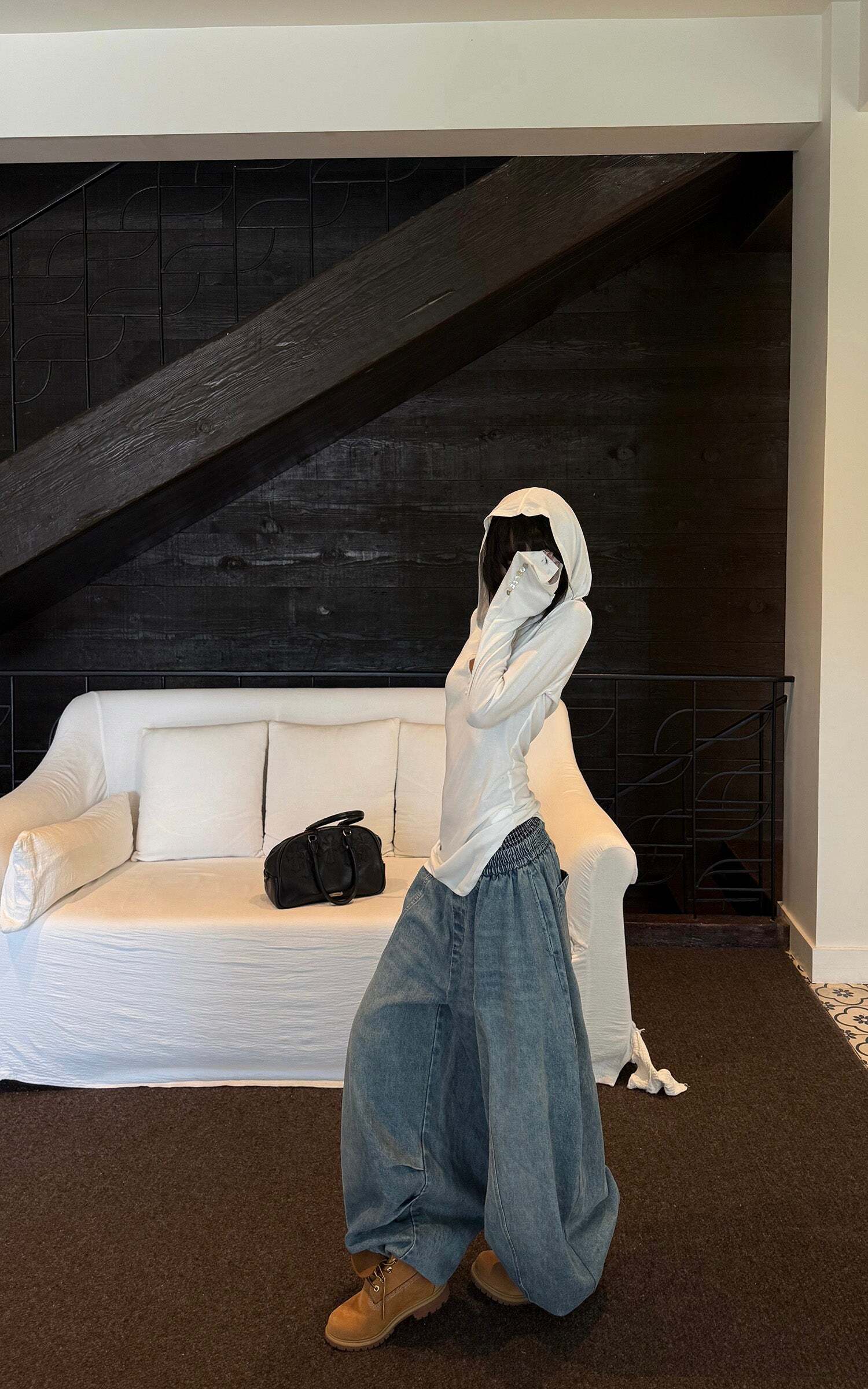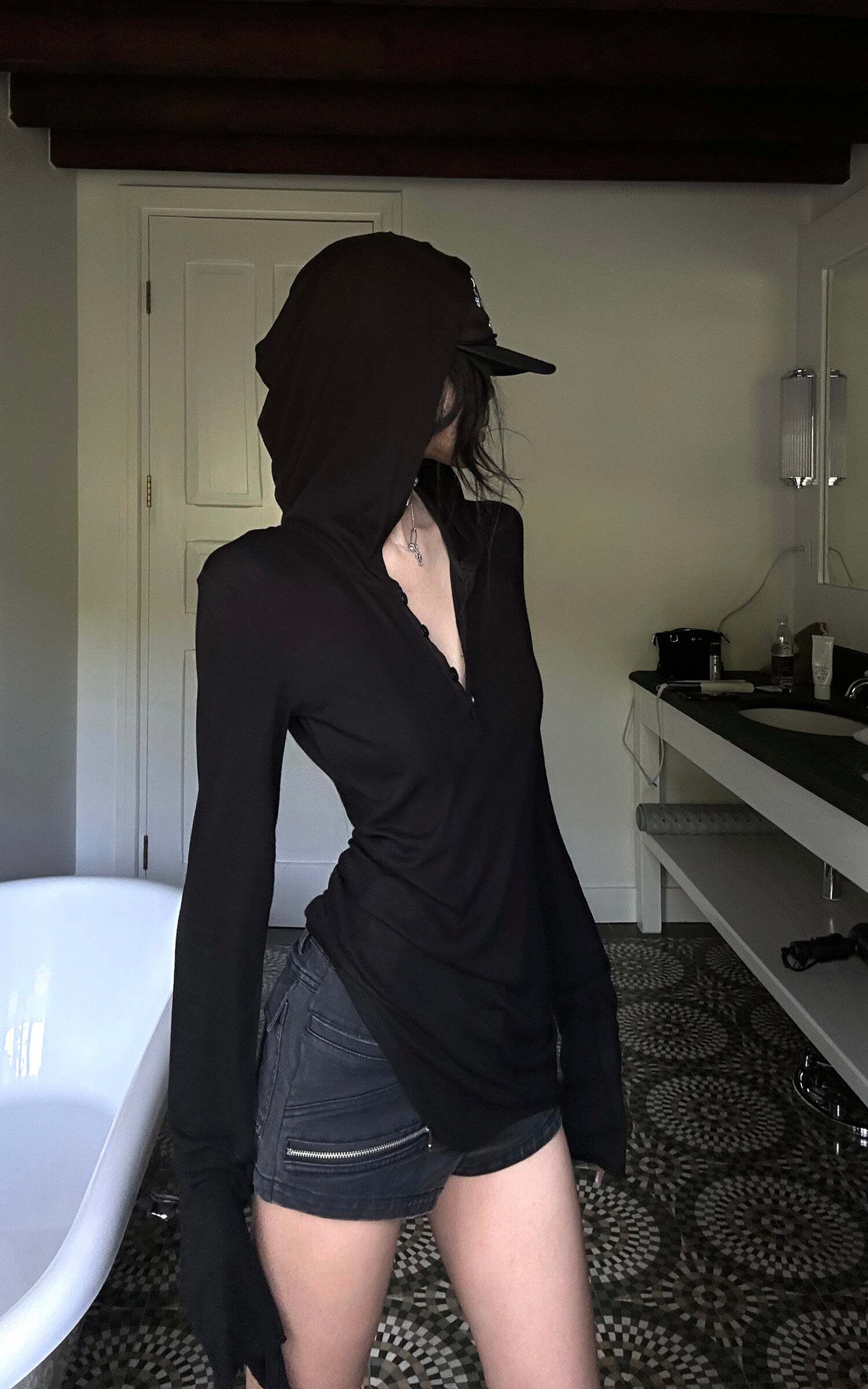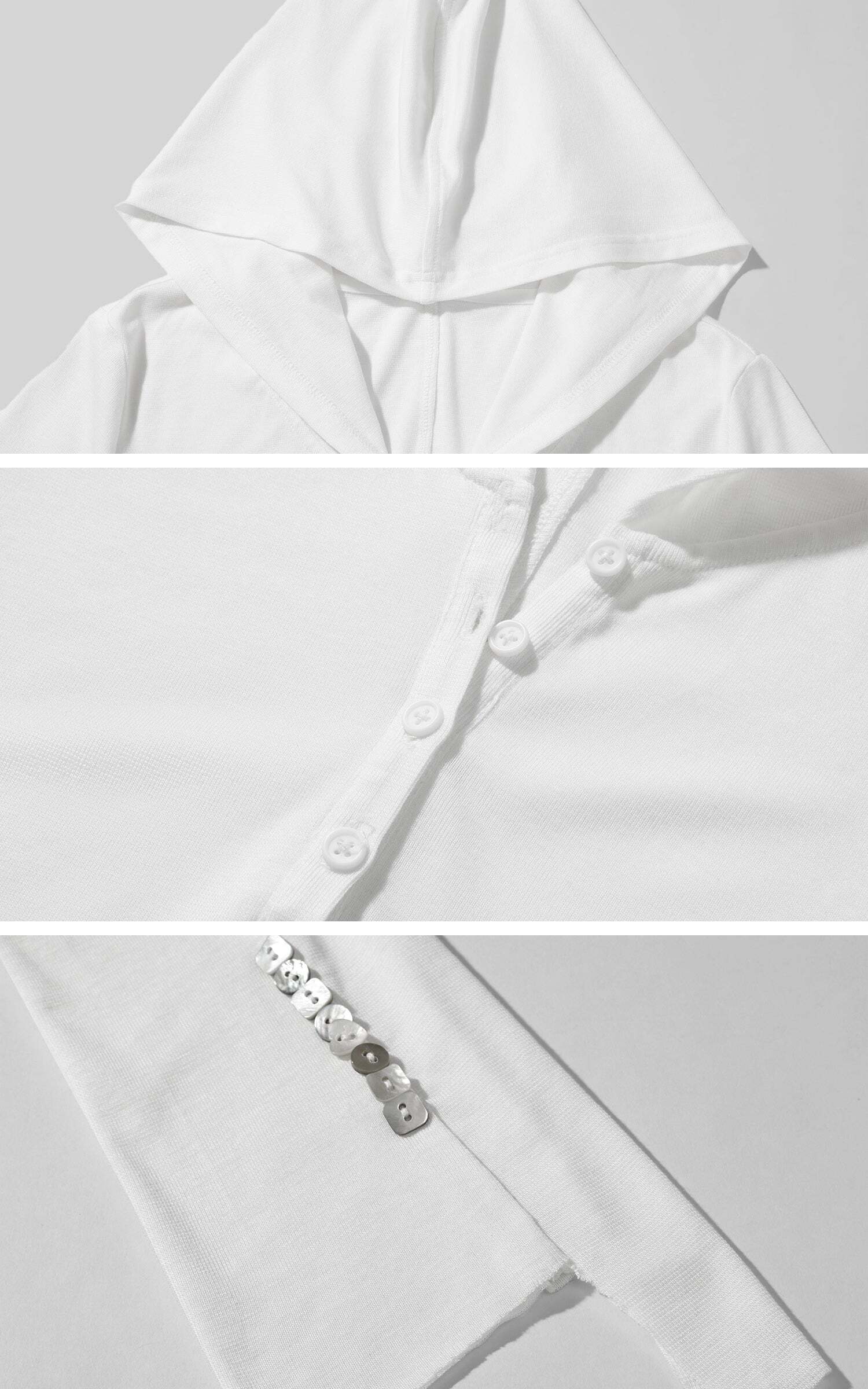 A slim silhouette meets street-ready attitude. This hooded long sleeve tee is cut from soft stretch cotton, detailed with elongated sleeves and button-front neckline for a subtle edge. The draped hood adds dimension, whether layered under outerwear or worn alone. A minimal yet directional piece designed to shift between casual uniform and statement street styling.