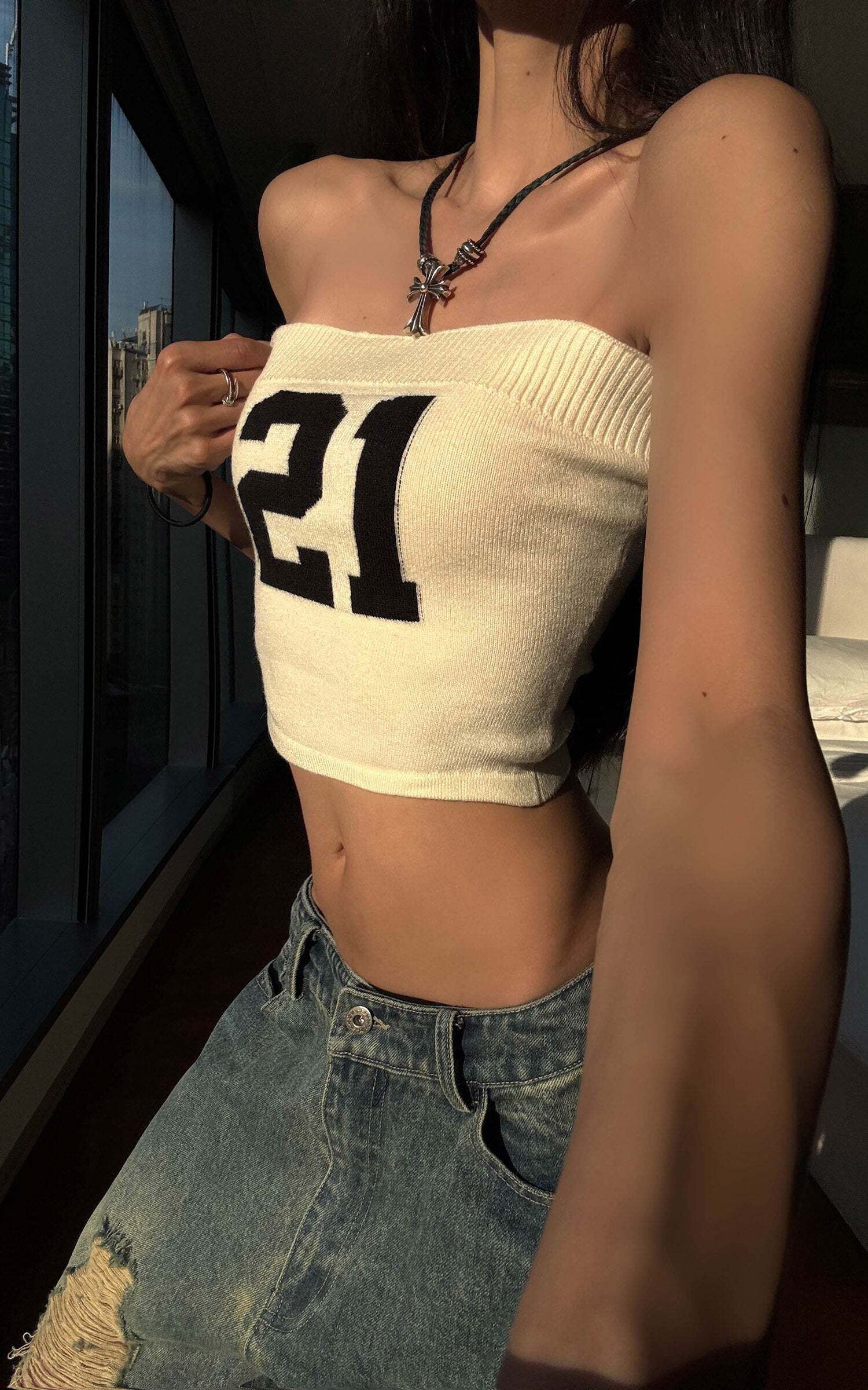 Strapless Knit Tube Top with Bold “21” Motif High-quality product featuring outfit ideas, outfit ideas winter, fall clothing trends 2025 and more. Modern design that fits the latest trends. Premium materials ensure durability and comfort. Order now for special offers! Product designed with attention to every detail. Suitable for all occasions and personal styles.