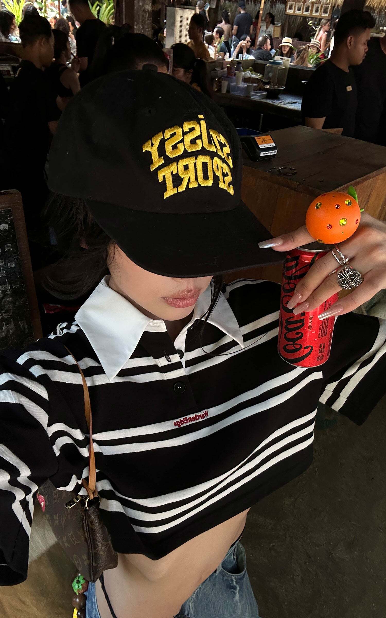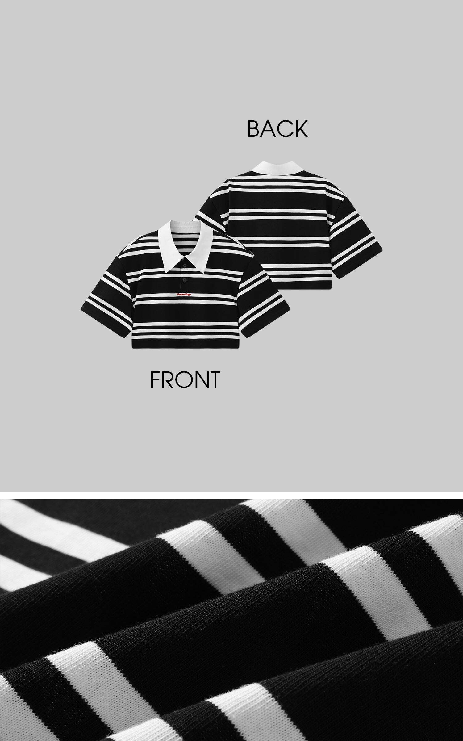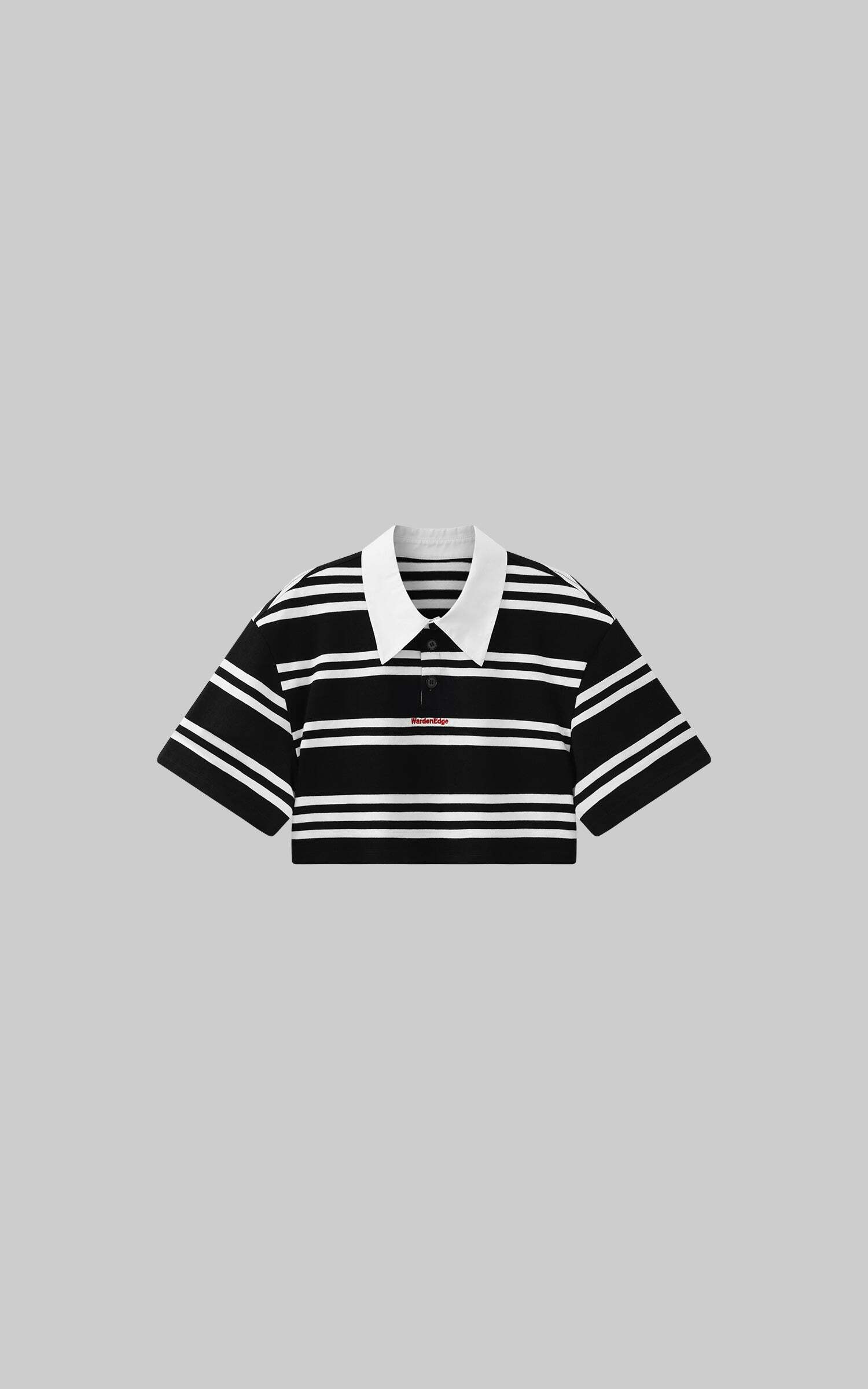 A sharp remix of the classic polo. This cropped piece pairs clean horizontal stripes with a crisp contrast collar and tonal buttons. The wide sleeves and structured silhouette balance street energy with preppy cues. Cut from soft cotton knit with a weighty hand, it delivers confident proportions with minimal effort. Built for those who don’t follow—only reinterpret.