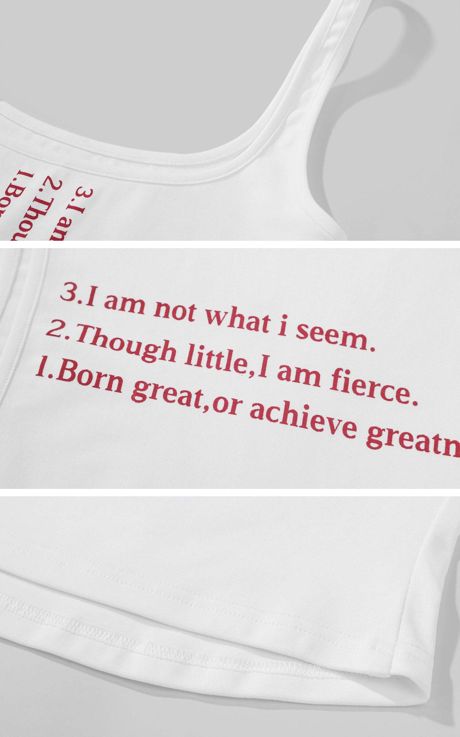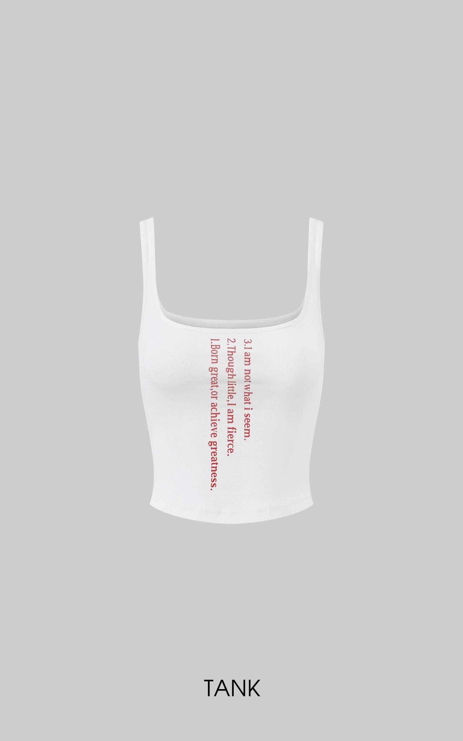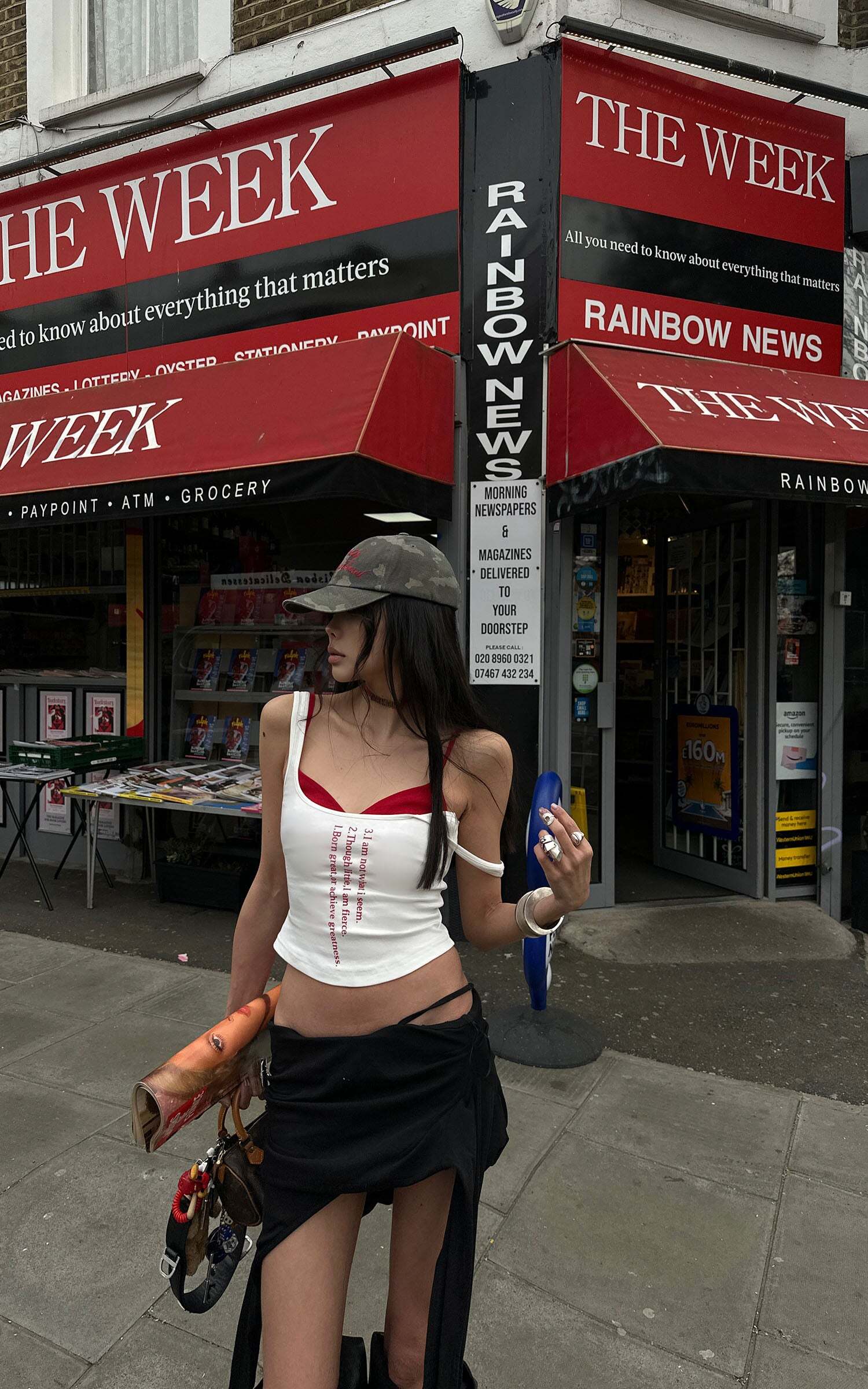 An intentional clash of softness and statement. This two-piece set includes a fitted white tank with vertically printed affirmations and a crimson bralette designed to peek through with unapologetic contrast. Together, they form a silhouette that’s confident and complex—built to disrupt the plain and provoke a second look. Adjustable straps and elastic finishing ensure comfort while the visual dialogue between the pieces captures a layered identity: composed, bold, and never silent. Wear as a declaration, not just an outfit.
