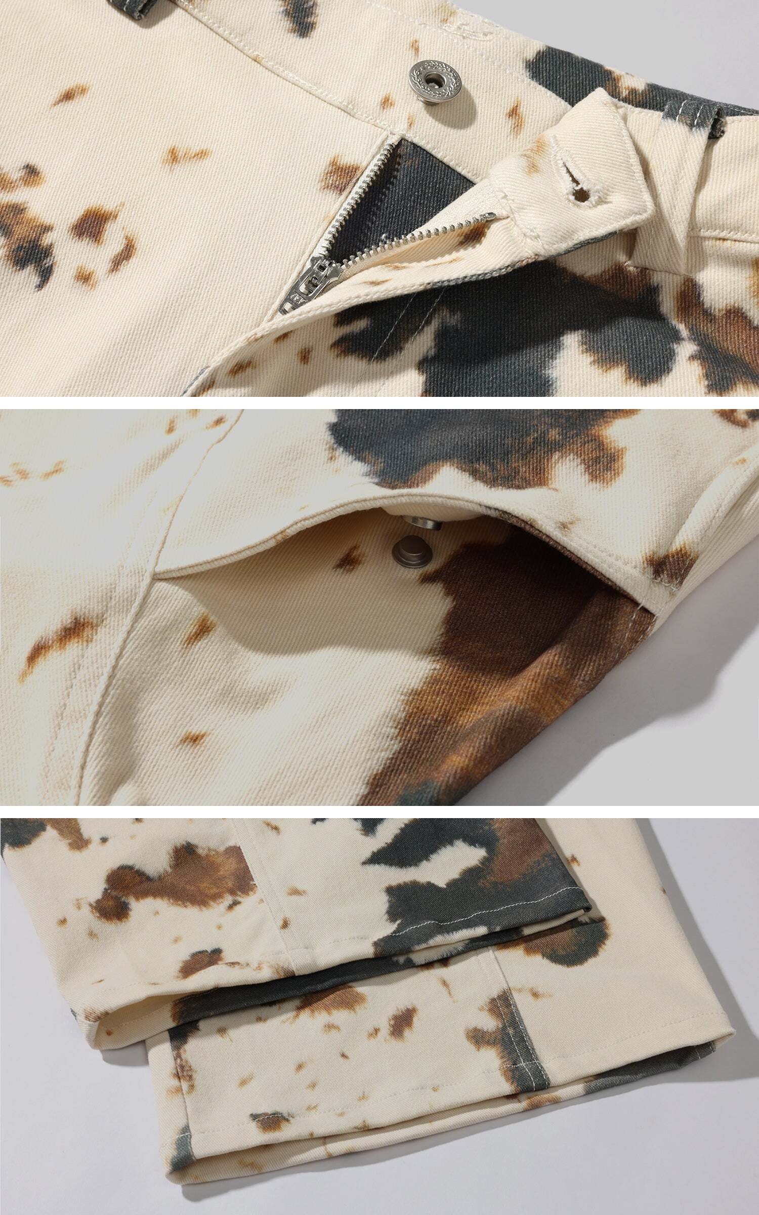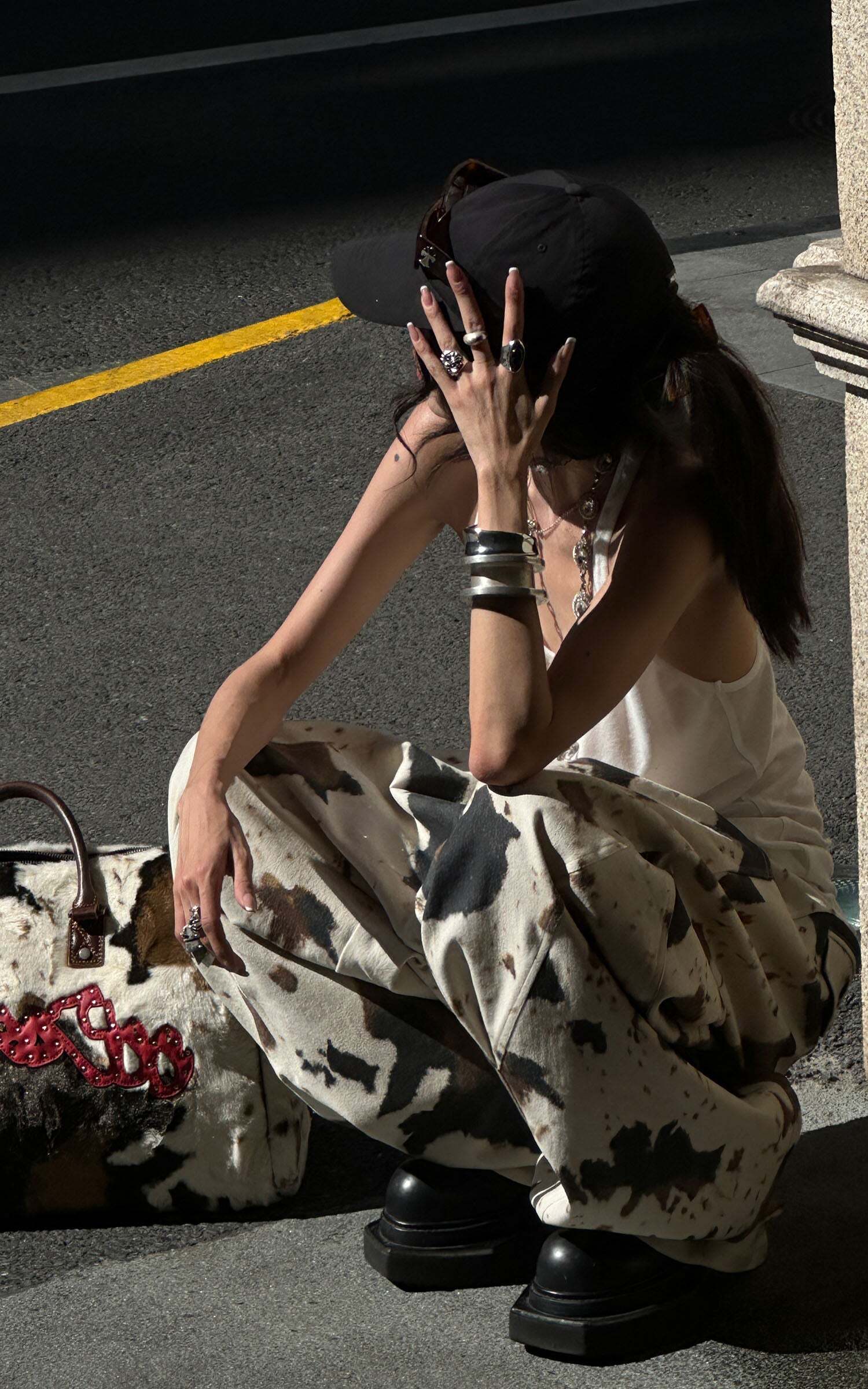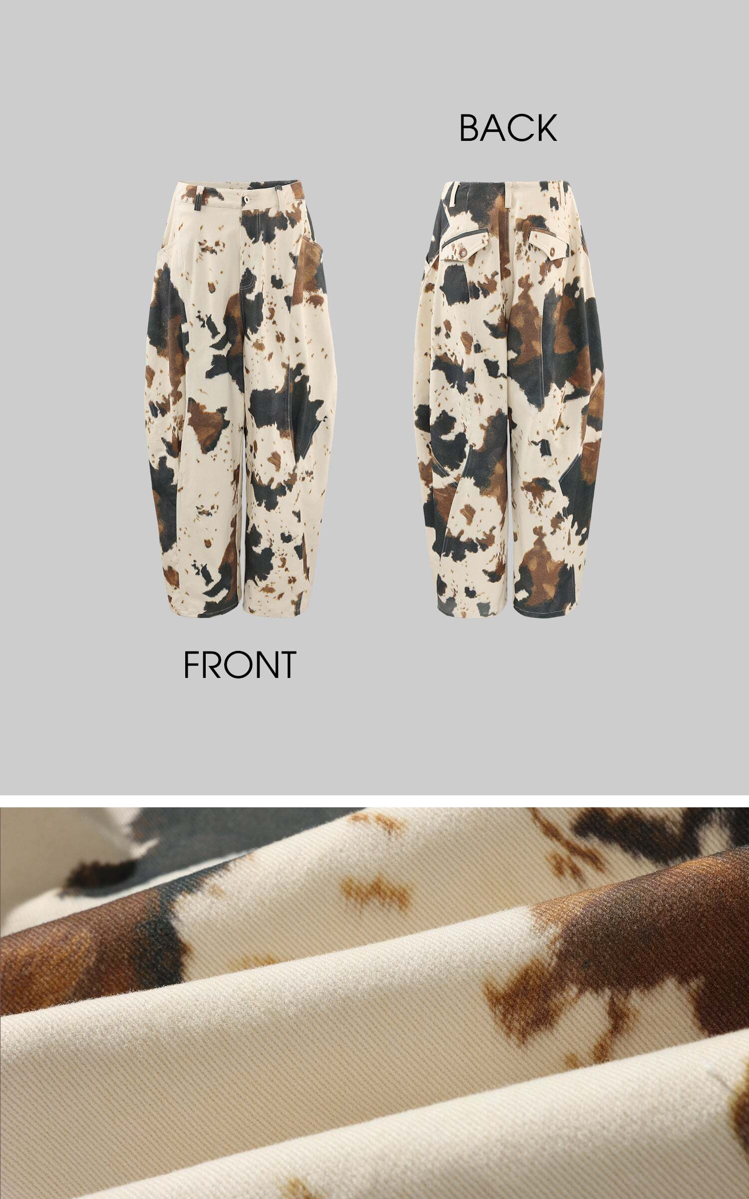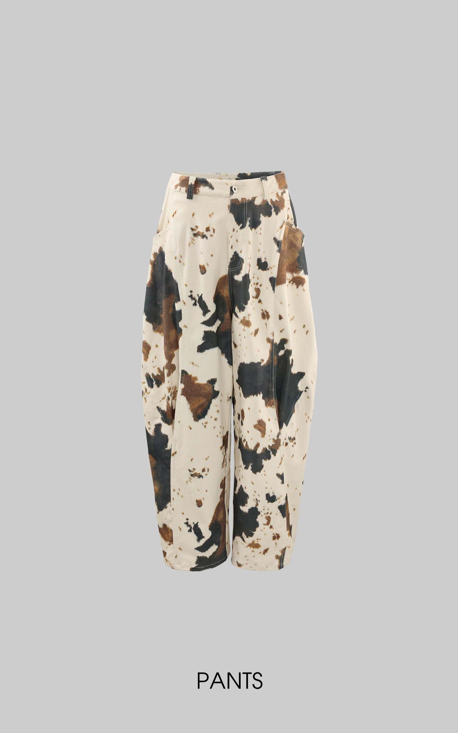 Constructed in a structured cotton denim, these oversized pants feature a bleach-dyed cowhide pattern, creating a raw, abstract effect. The exaggerated wide-leg silhouette is sculpted with asymmetric front pleats, while double flap pockets at the back add utilitarian edge. Detailed with industrial metal hardware and invisible side seam zippers, this piece is built for movement and presence. Wear it with tanks or technical layers for a low-slung, fearless profile.