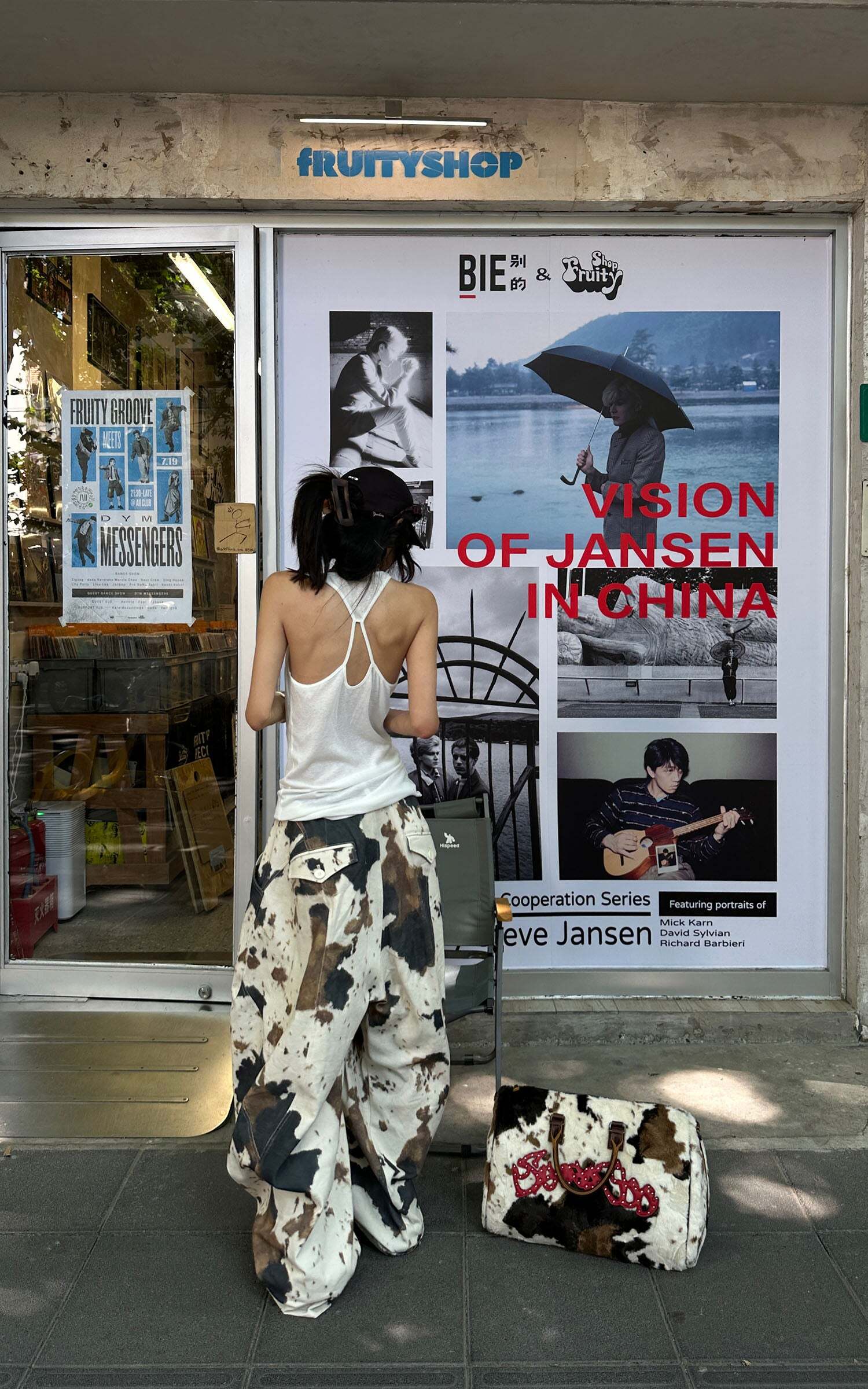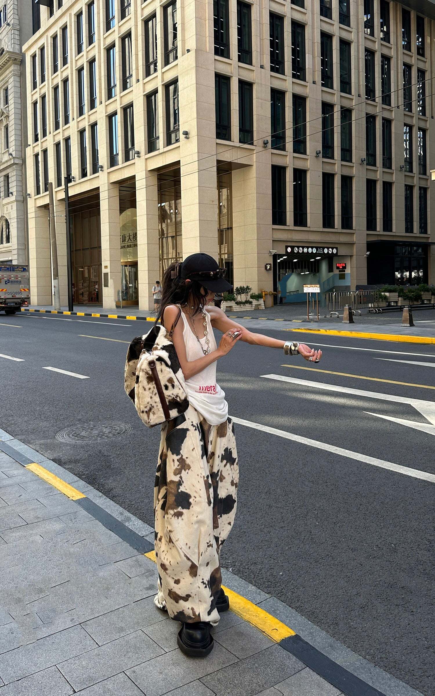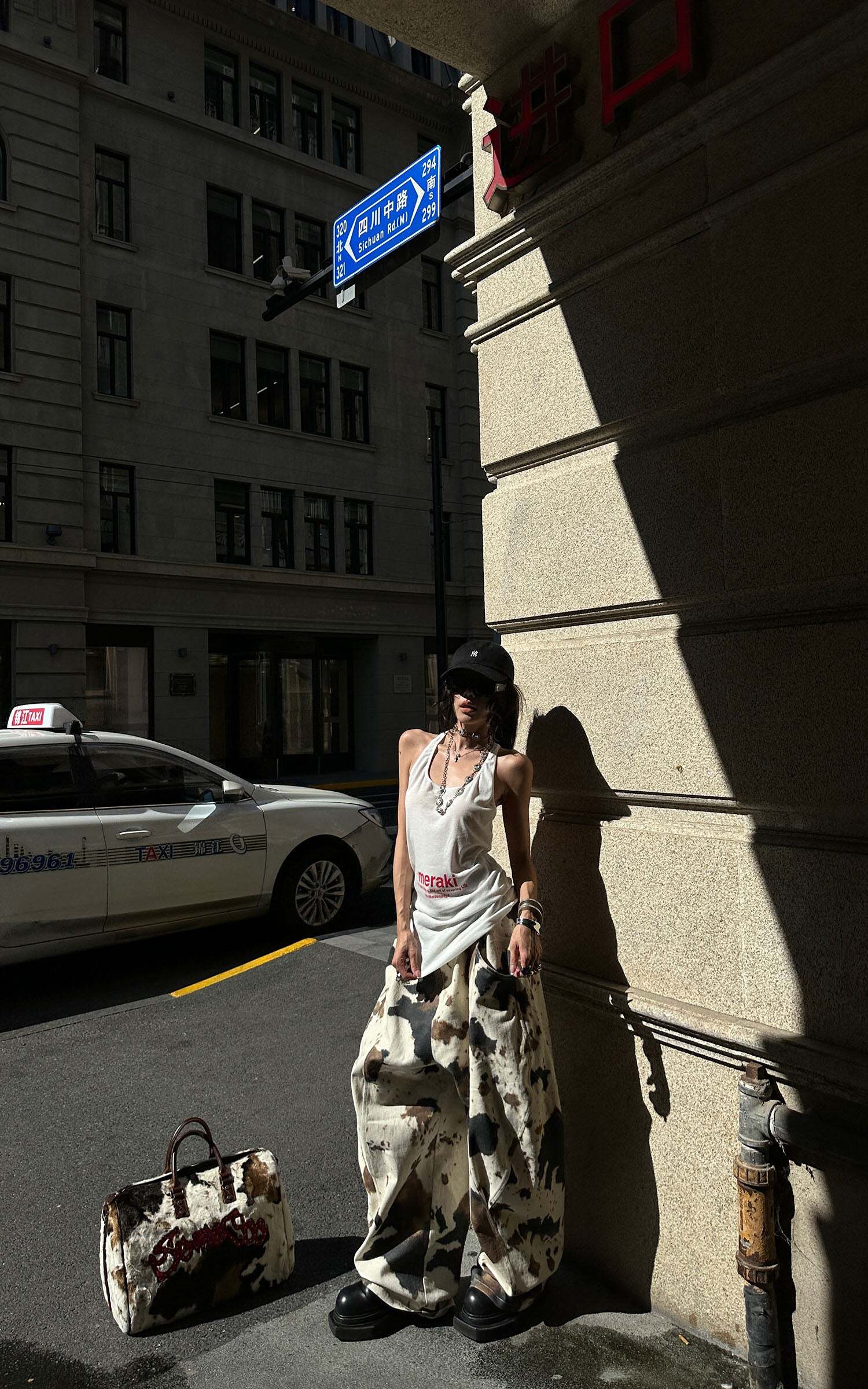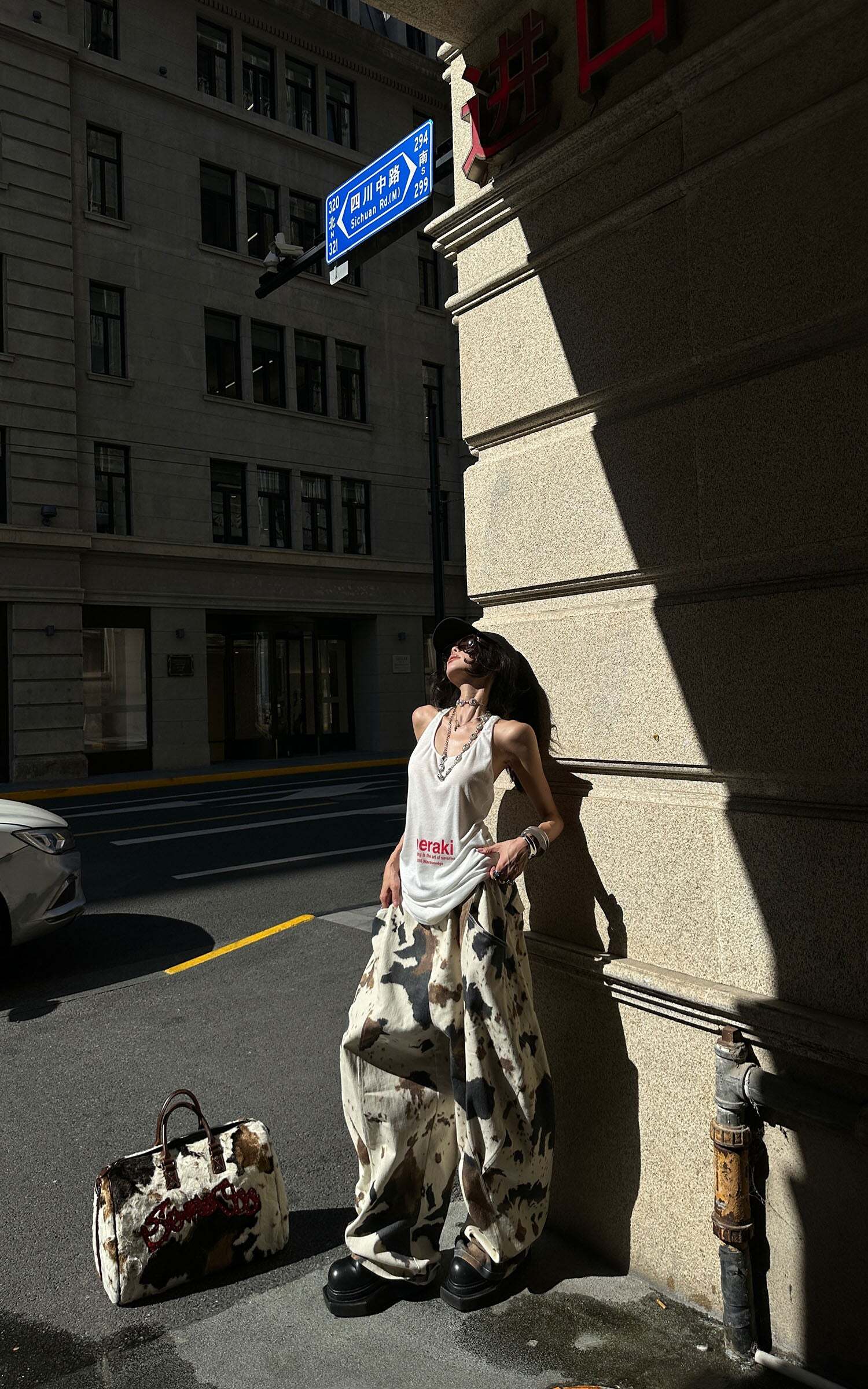 Constructed in a structured cotton denim, these oversized pants feature a bleach-dyed cowhide pattern, creating a raw, abstract effect. The exaggerated wide-leg silhouette is sculpted with asymmetric front pleats, while double flap pockets at the back add utilitarian edge. Detailed with industrial metal hardware and invisible side seam zippers, this piece is built for movement and presence. Wear it with tanks or technical layers for a low-slung, fearless profile.