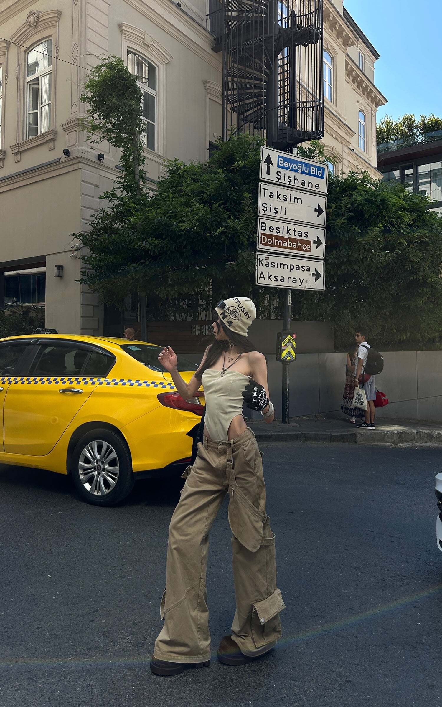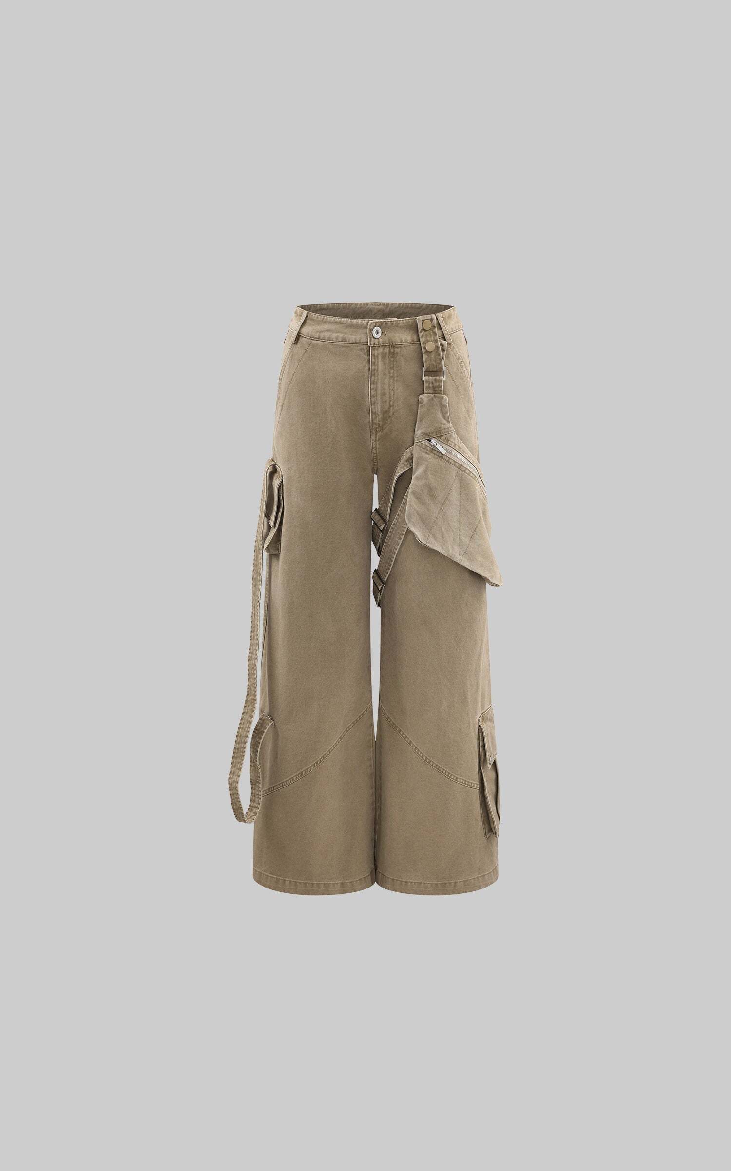 Cut in a loose wide-leg fit, these cargo pants reinterpret utility with a deconstructed edge. Multiple flap and zipper pockets, detachable pocket design, and hanging strap details add both function and statement. Finished in a washed texture for a worn-in look, it’s built for layering into bold city-ready outfits.