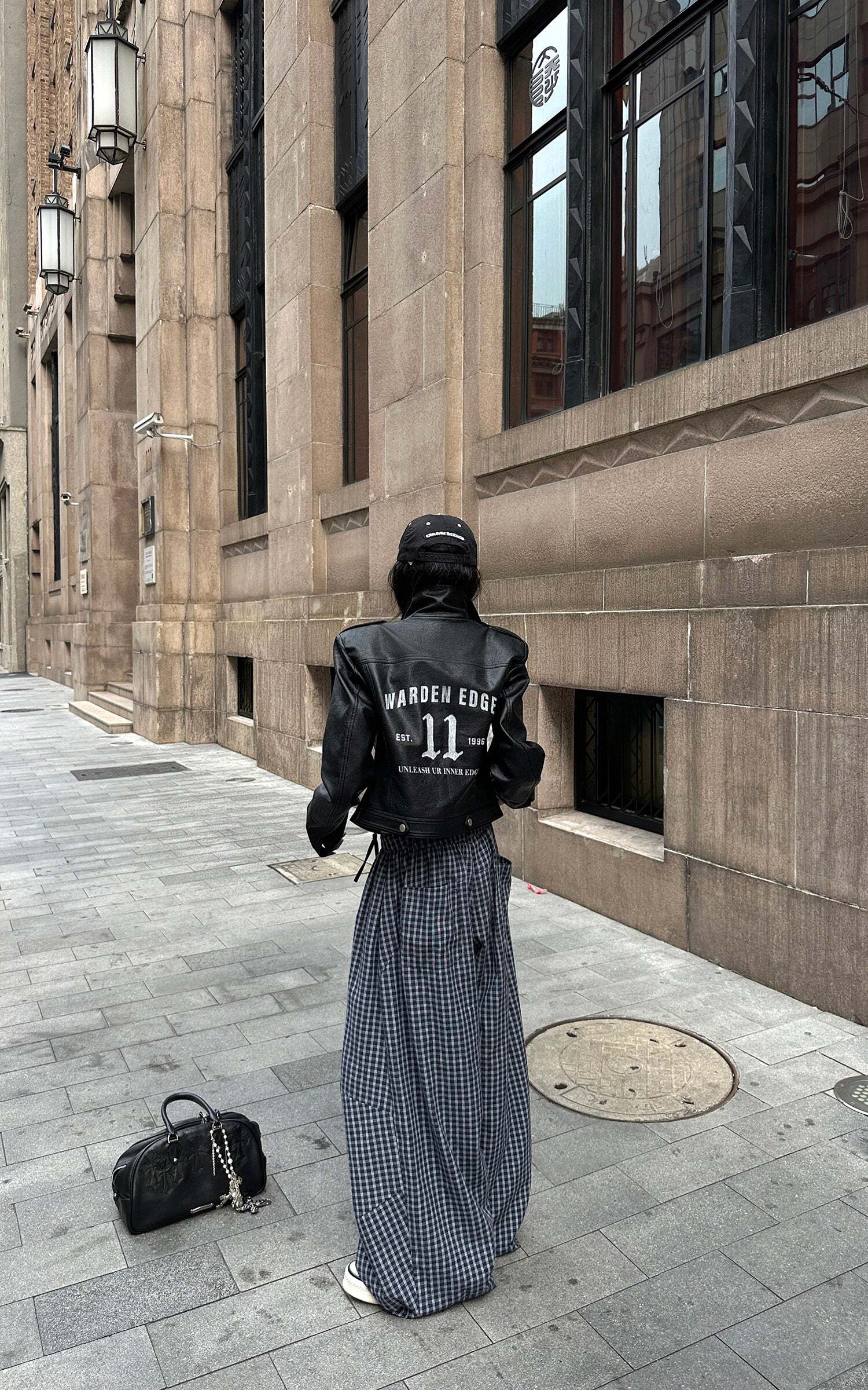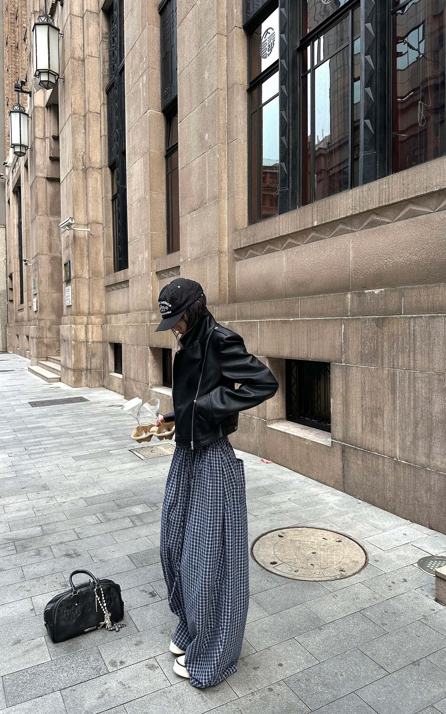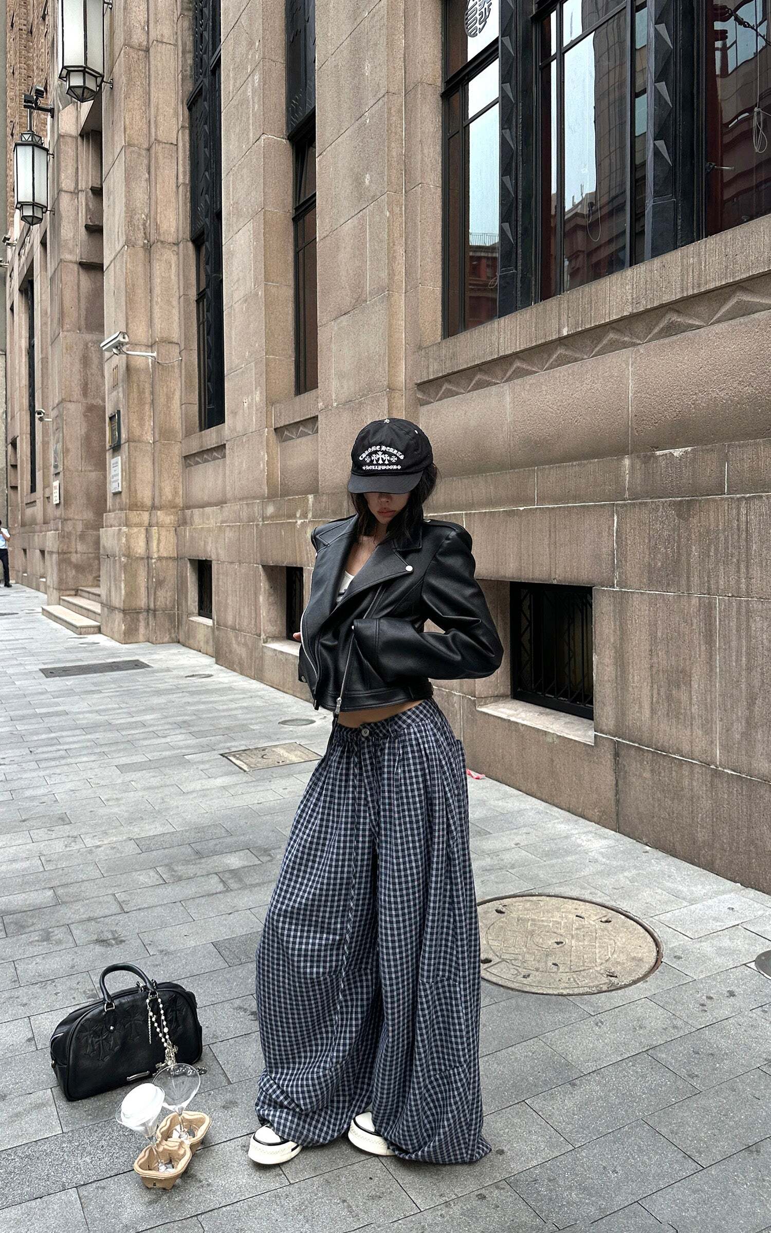 Wide-leg Check Pants: Relaxed Fit Streetwear & Leather Pants Outfit Winter