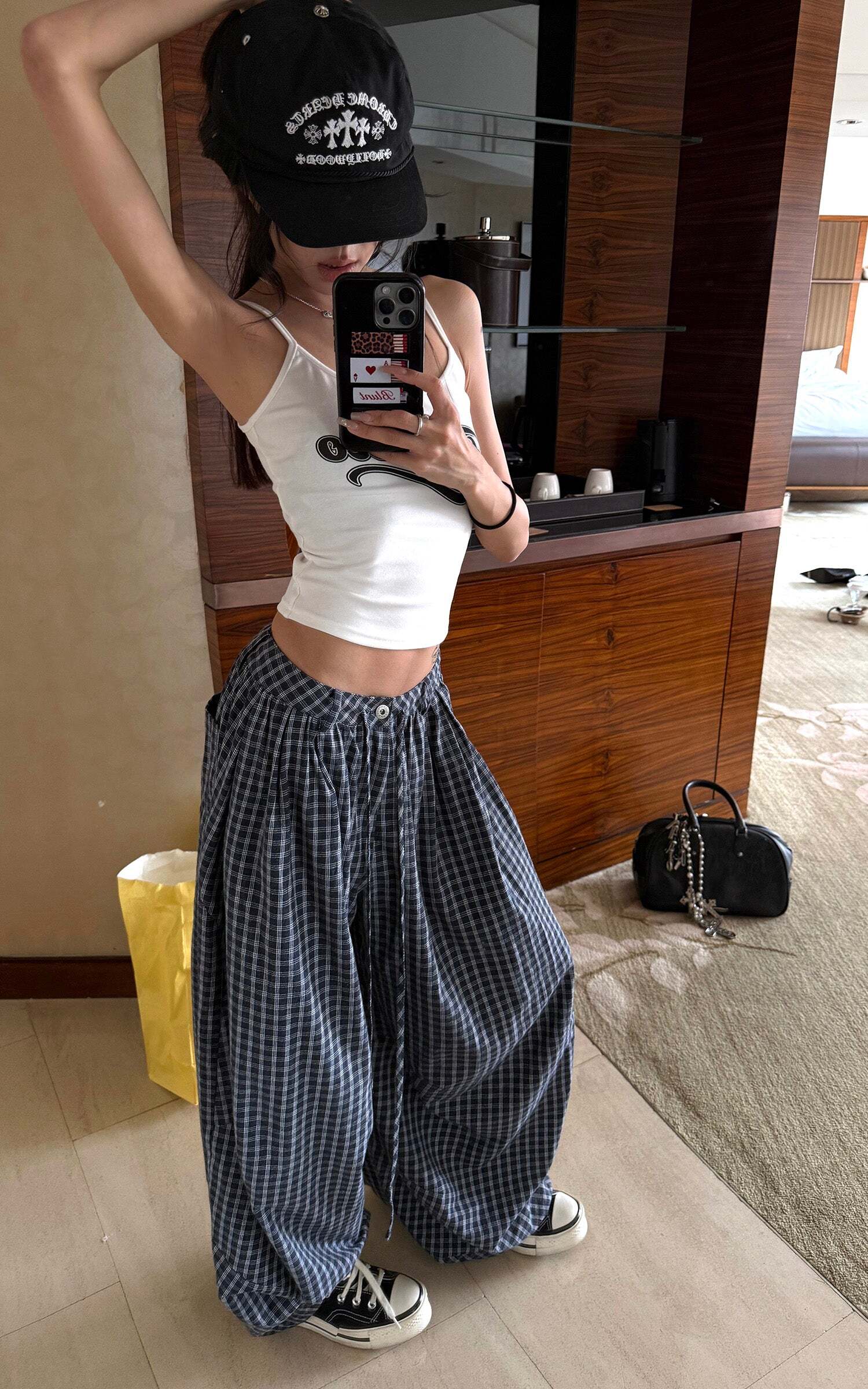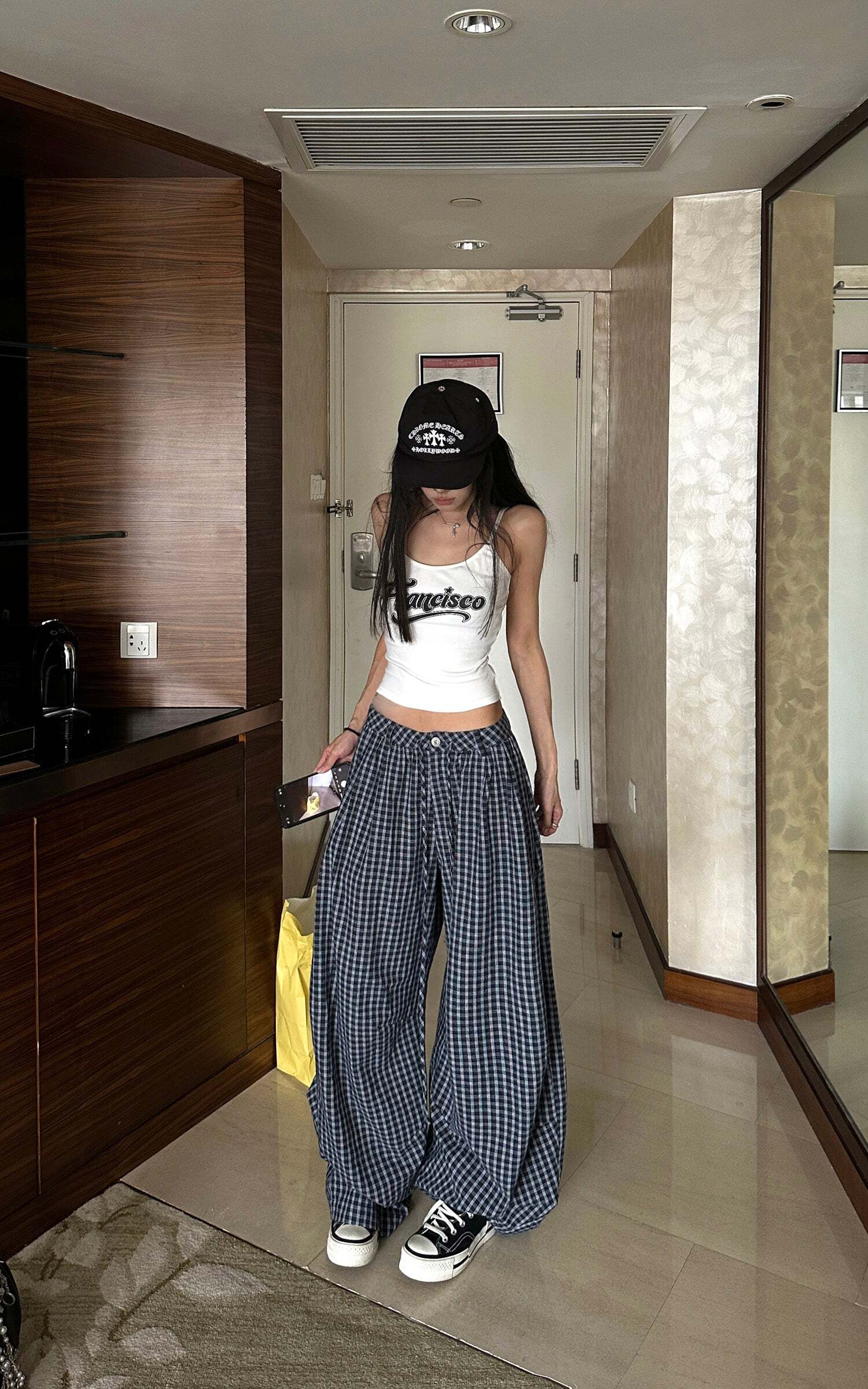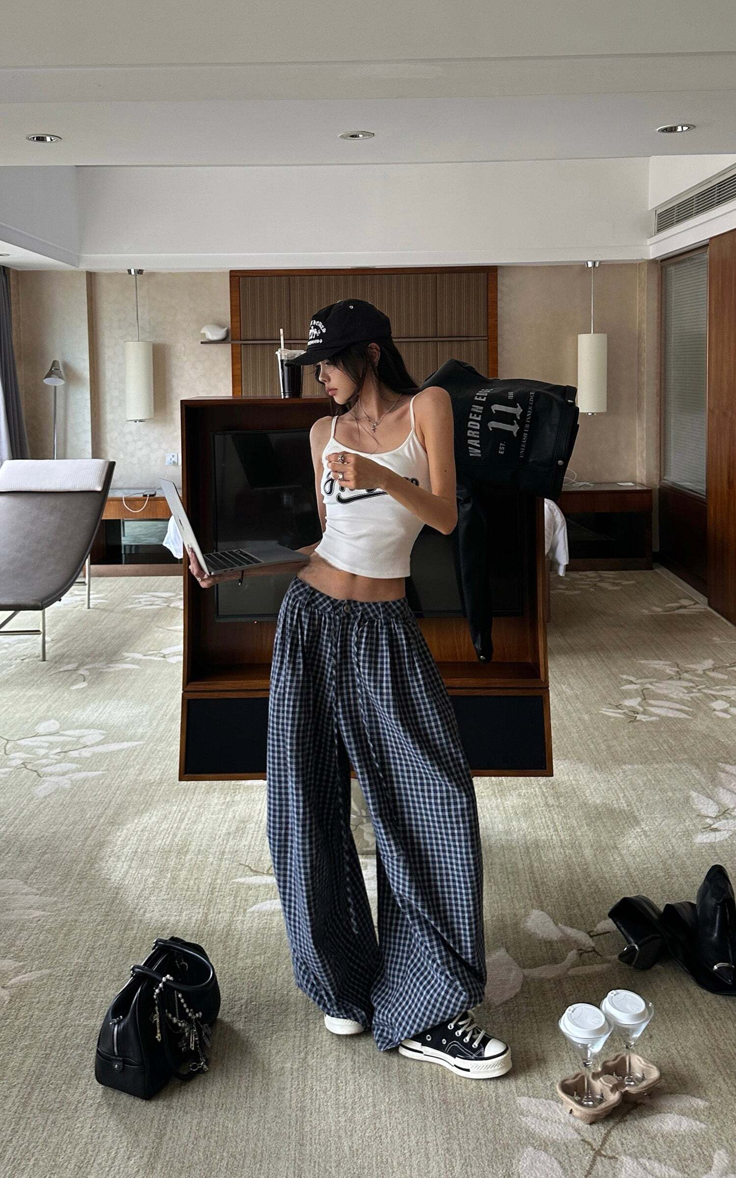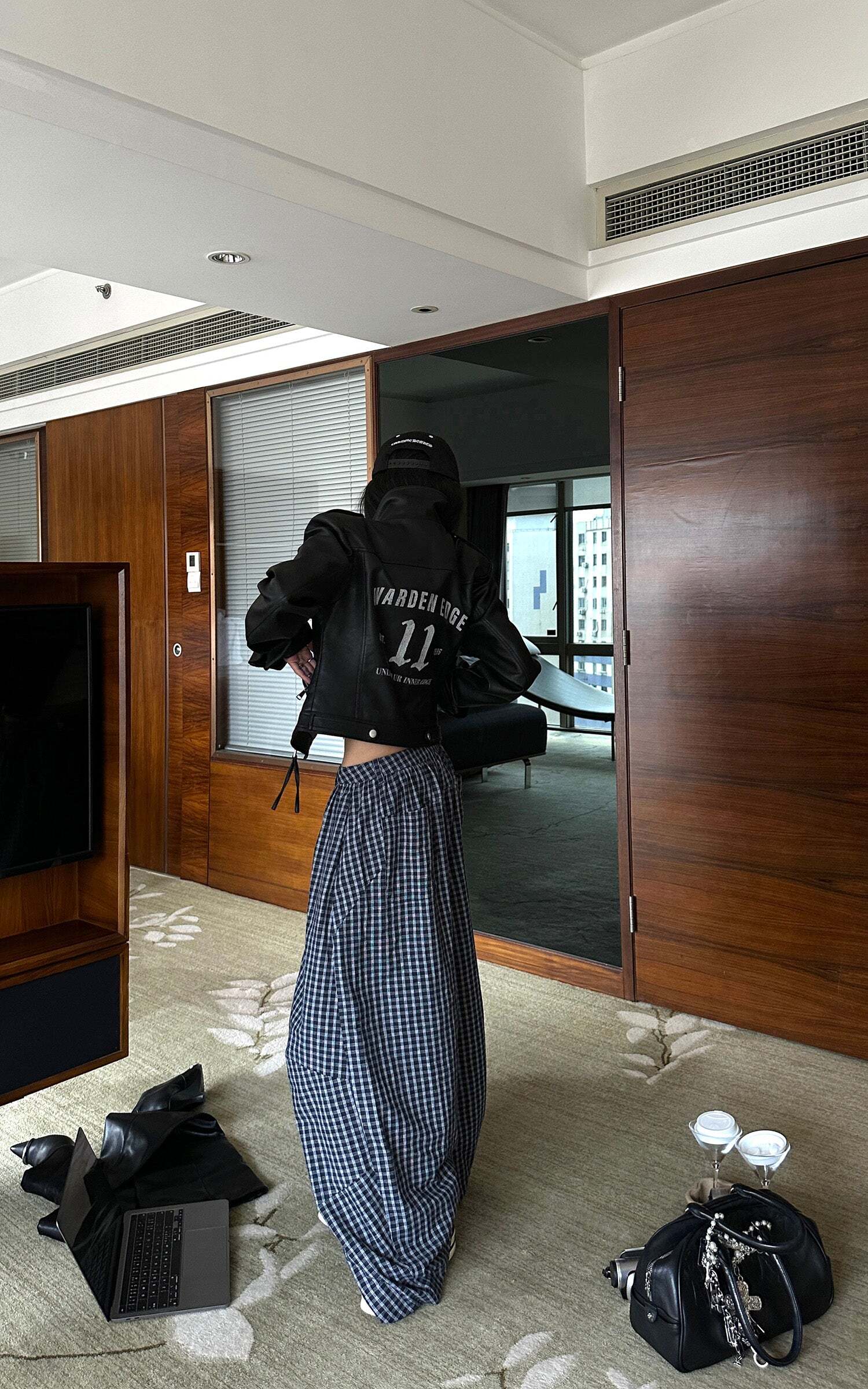 Wide-leg Check Pants: Relaxed Fit Streetwear & Leather Pants Outfit Winter