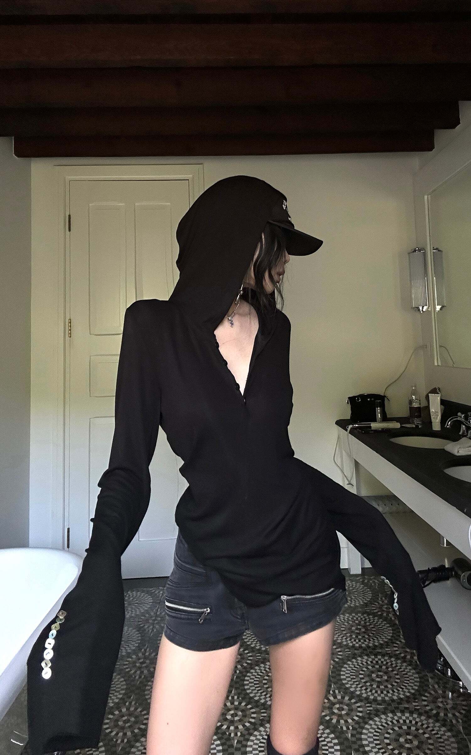 Cut close to the body with a bold ultra-short silhouette, these denim shorts redefine raw edge appeal. Angular seam construction and exposed metal zippers deliver an industrial statement, while structured back pockets add both depth and function. The denim holds its shape yet wears with a laid-back ease, balancing sharpness with attitude. Pair them with oversized layers or heavy boots to amplify their street-inflected energy.