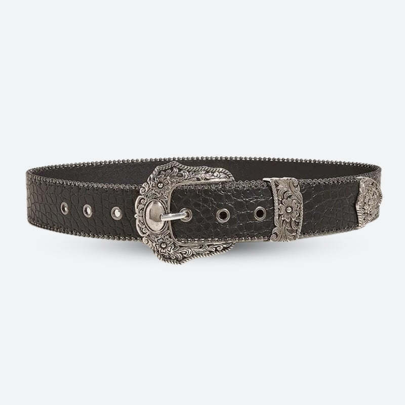 This Western Belt, crafted from textured faux leather, features a detailed metal buckle with intricate floral engravings. The silver-tone hardware adds a vintage vibe, making it a perfect accessory for jeans, skirts, or dresses, adding timeless style to any outfit.