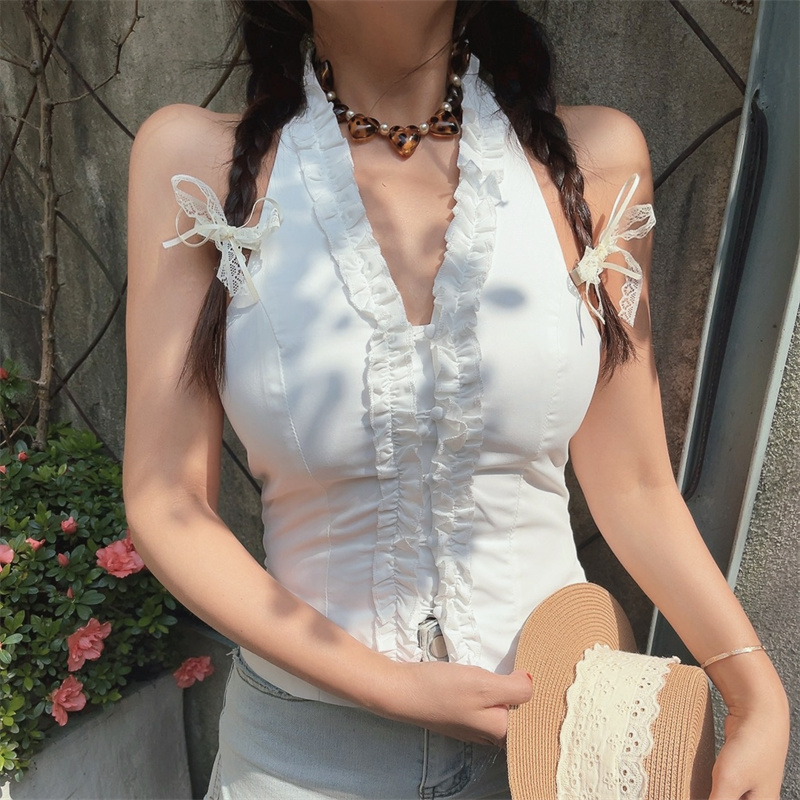Women V- Neck Ruffled Waitie Backless White Tank Top, Austral – Western Outfits Women