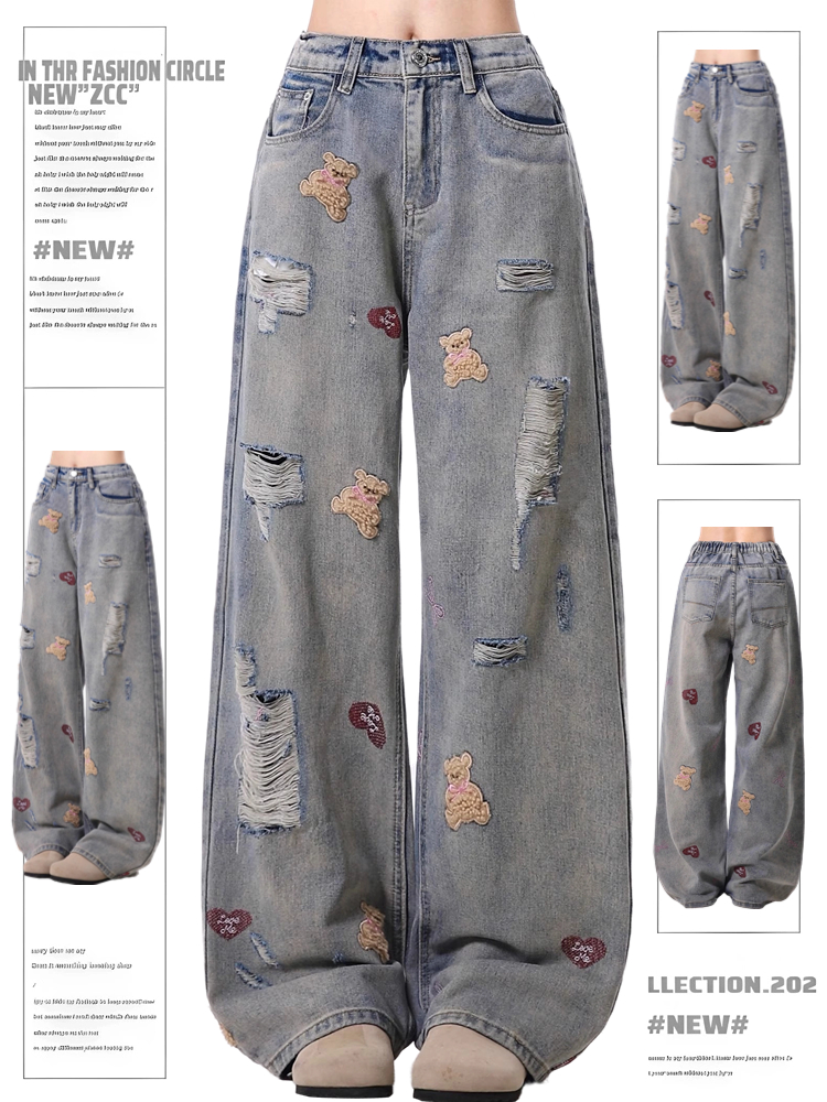 Women High Waisted Ripped Jeans Bear Embroidery Wide Leg Pants Spring, Autumn High-quality product featuring spring outfit, fall outfits women, leather pants outfit winter and more. Modern design that fits the latest trends. Premium materials ensure durability and comfort. Order now for special offers! Product designed with attention to every detail. Suitable for all occasions and personal styles.
