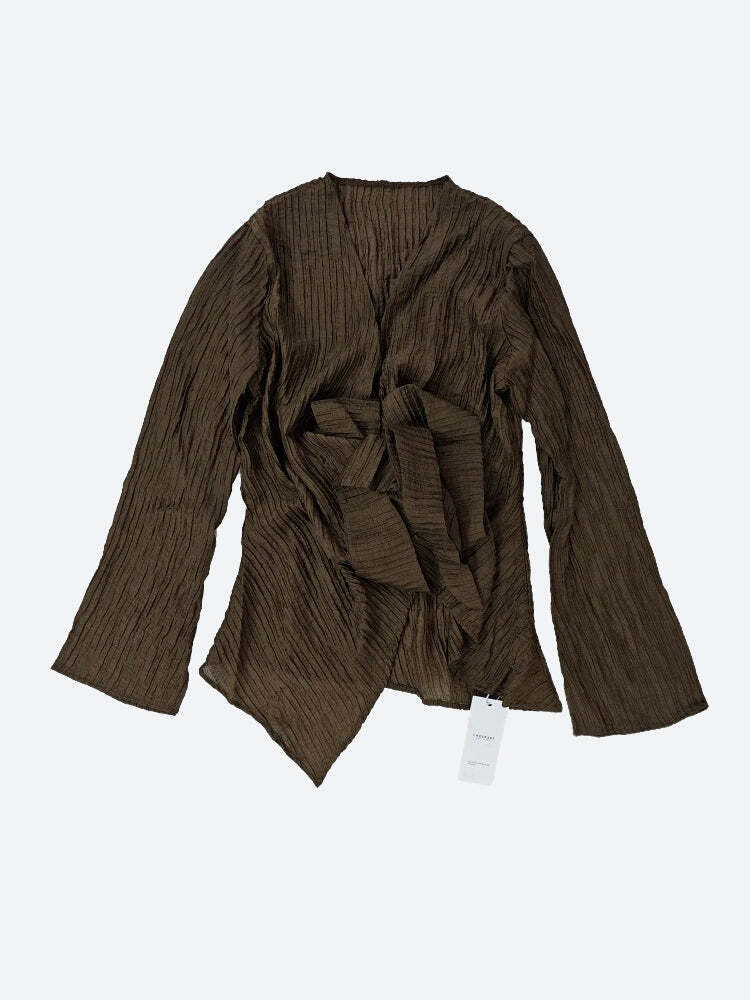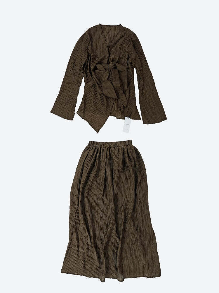 Crafted in luxe pleated fabric, this earthy-toned co-ord drapes effortlessly over the body. The wrap blouse cinches the waist with an asymmetrical hem, while the matching maxi skirt flows with graceful movement. Perfect for slow mornings, gallery strolls, or a soft glam dinner mood.