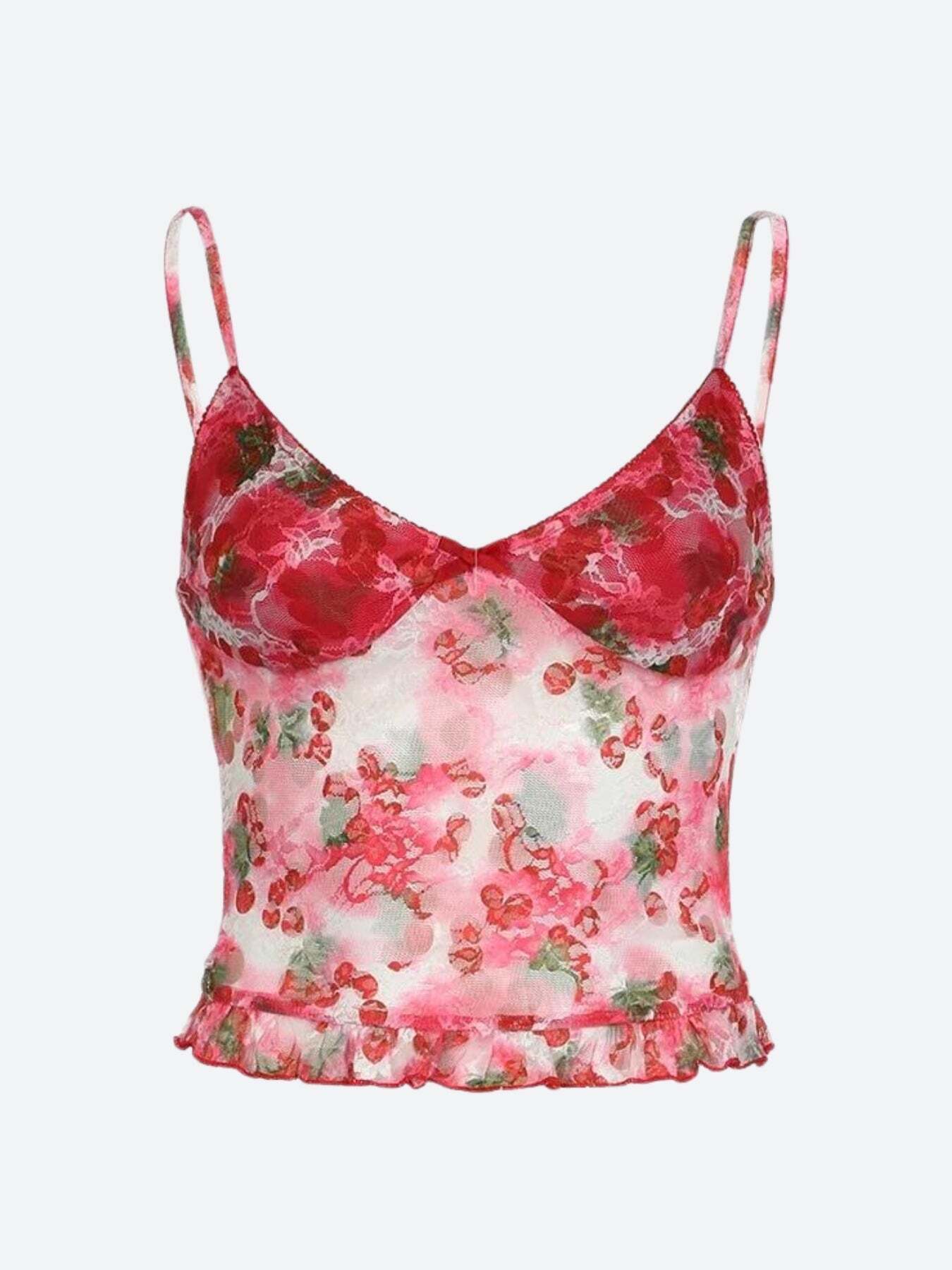 Showcasing a delicate cherry print on sheer mesh, this top blends flirty and nostalgic vibes. Spaghetti straps and ruched bust details create a flattering fit, while the ruffled hem adds whimsy. Perfect for layering, it pairs well with high-waisted jeans or a skirt for a chic, retro-inspired look.