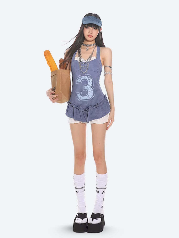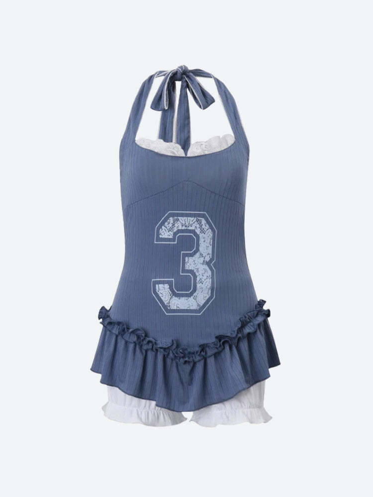 Channel early 2000s it-girl energy with this dreamy Y2K-inspired set. The fitted mini dress with a bold “3” varsity graphic brings sporty charm, while ruffled hems and lace trim serve soft girl vibes. Comes with matching bloomer-style shorts for full coverage and extra flair.