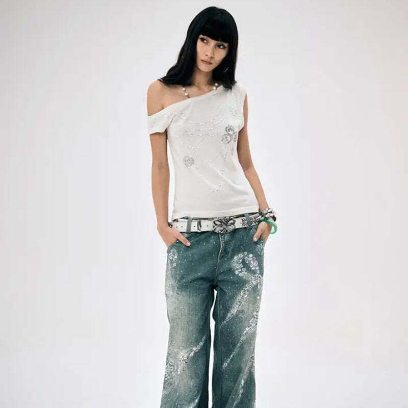 One-shoulder styling meets graphic sparkle for a throwback vibe that screams early 2000s. With an asymmetrical neckline and scattered rhinestones, this one-shoulder piece fits like a dream and adds edge to jeans or cargos. A must-have pick for retro trendsetters who want cool with minimal effort.