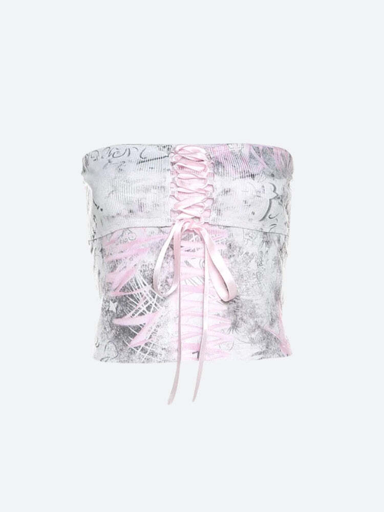 Own the night in this Y2K ribbon tube top, blending grunge graffiti print with sweet satin lacing. The body-hugging fit and lace-up front bring that early 2000s drama, perfect for low-rise skirts or cargos. Whether you’re hitting a party or snapping fit pics, it’s all about the vibe.