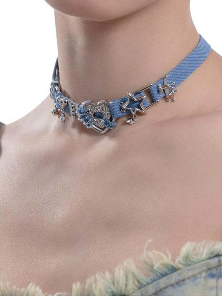 Add a touch of Y2K flair to your outfit with this sparkle denim choker necklace. Featuring playful charms and a heart buckle, this choker offers a trendy and nostalgic vibe. Perfect for elevating your casual looks, it combines edgy style with a touch of sparkle.